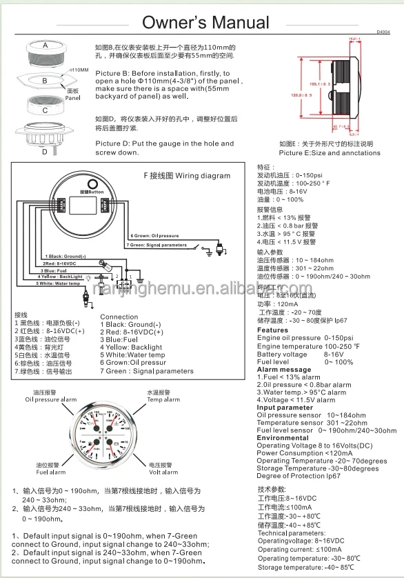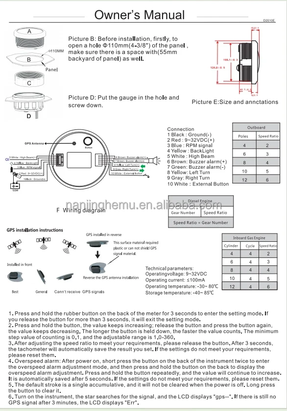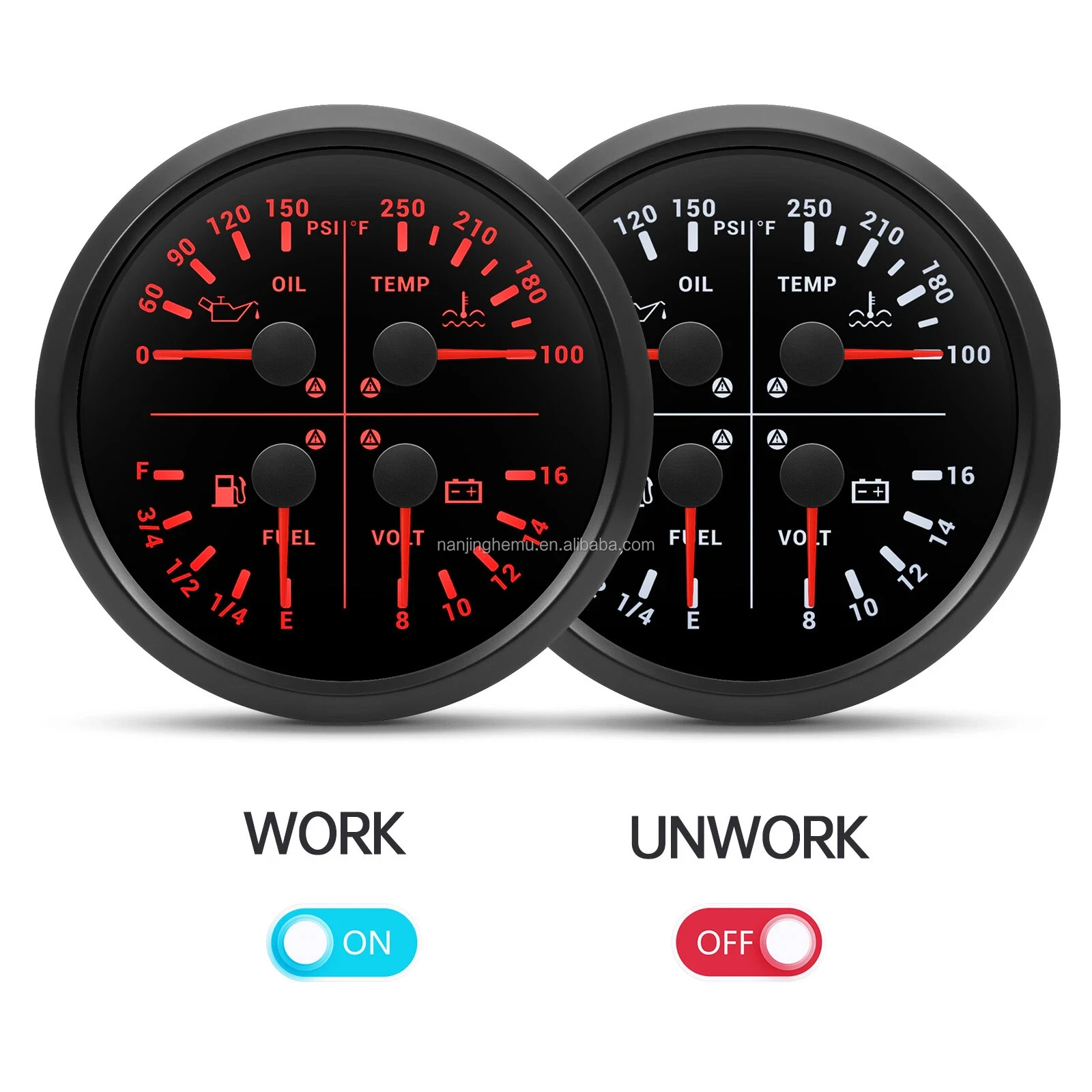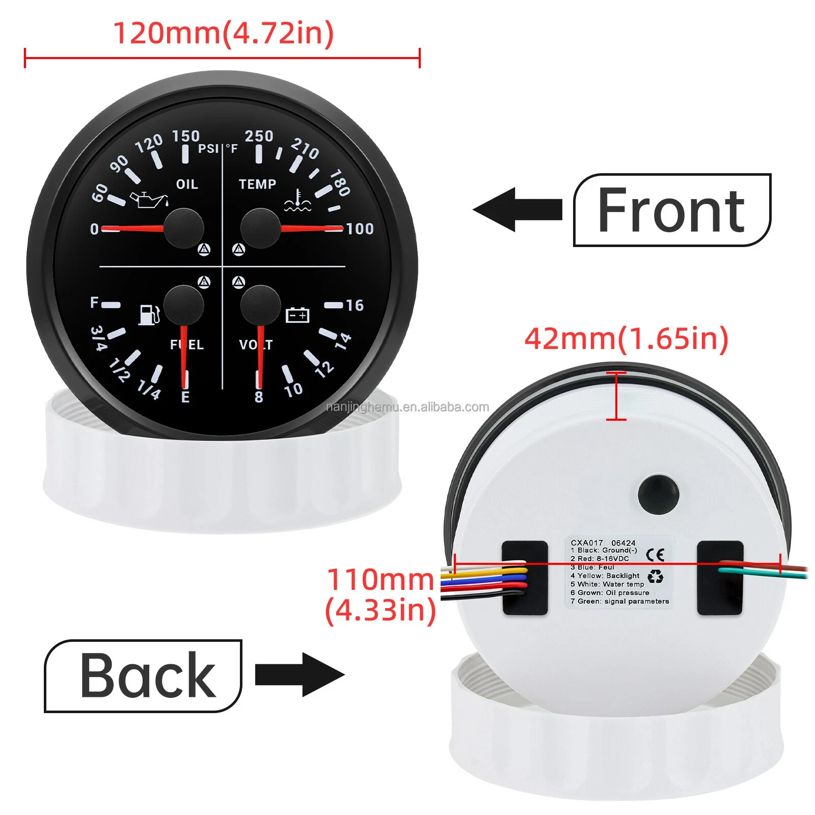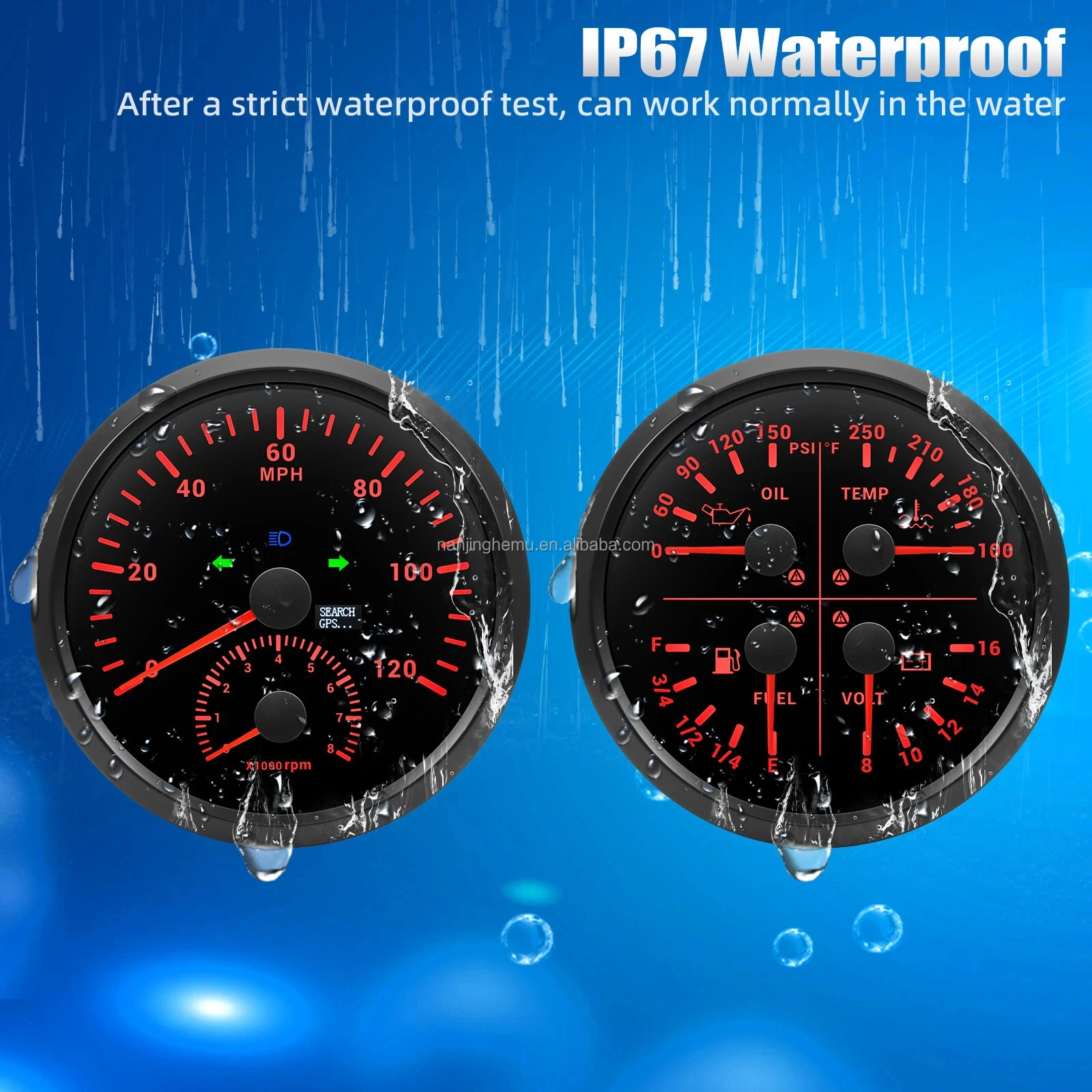 Features:Suitable for all vehicles and off-road vehiclesAnalog Display Speedometer & Tachometer & Digital Display Odometer.Speedometer with Turn Signal & High Beam Function.High Quality Stepper Motor Movement.Convex Clear Lens. 316 Stainless Steel Bezel & ABS Plastic Housing.Black Gauge Faceplate. Red Needle.RED LED Illumination.IP67 Waterproof. Rustproof. Anti-Fog & UV-Resistant.Tachometer Fits Both Gas & Diesel Powered Engine.4 In 1 Multi-Function Gauge with Warning Function.2 IN 1 Multi-Function Gauge Requires 12 / 24 Volt Negative Ground Systems.4 IN 1 Multi-Function Gauge Requires 12 Volt Negative Ground Systems.Most importantly. the gauge is easy to setup. and can be used in all vehicles. boats and off-road vehicles.GPS Speedometer Specifications:Application: Universal fit for Motorcycle/ Boat/Truck/Bus/CarElectronic Speedometer (stepper motor)No Mechanic Sensor. get speed signal from GPSSpeed ≠0 and show accurate speed in tunnel with the help of accelerometerGPS Blind Area Odometer CompensationOverSpeed Buzzer Alarm (Value Adjustable)Indication Light (Left. Right and High Beam)Installation Diameter: 110mm (4 3/8")Speed Range: 0~120MPHRPM Range : 0~8000RPMMileage Range: 0-99999.9milesWorking Voltage: 8-16VPower consumption:??120MAWorking temperatures: – 20 to 70°CStorage temperatures: -30 to 80??Protection rank: IP67 WaterproofReverse polarity protection and anti-fogging performance 4 In 1 Multi-Function GaugeFixing dimension: 110mm (4 3/8") Indicating Range: Oil press. meter: 0-150PSI;Water temp. meter: 100-250?HFuel level meter: 0-100%. empty-full;  0-190ohms/240-33ohms. The signal can be adjustedVoltmeter: 8-16VWorking Voltage: 12V Input Signal:10-184ohms for 0-10Bar oil pressure meter;0-100% for fuel level meter;(Default 0-190ohms. can adjust to 240-33ohms before delivery)8-16V voltage meter;Input Signal 301-22ohms for water temperature meterRed backlightProtection grade is IP67. the whole body is completely waterproof;Excellent antifogging function;316 Stainless steel bezel with curved glass;Convenient Installation by multi-plug socket connecting way;Accessories: matched with connectors. Installation InstructionAlarm Value:1. Fuel??13% Alarm2. Oil pressure ??0.8Bar Alarm3. Water temp.??95?? Alarm4. Voltage??11.5V Alarm Package Included:1 x 110mm 4 in 1 Multifunctional Gauge1 x 110mm GPS Speedometer Gauge1 x GPS Antenna1 x Tacho sensor1 x Water temp sensor 1/8NPT1 x Oil pressure sensor 1/8NPT2 x Cable2 x Installation Instruction
