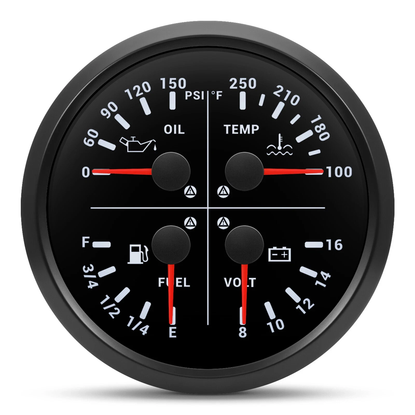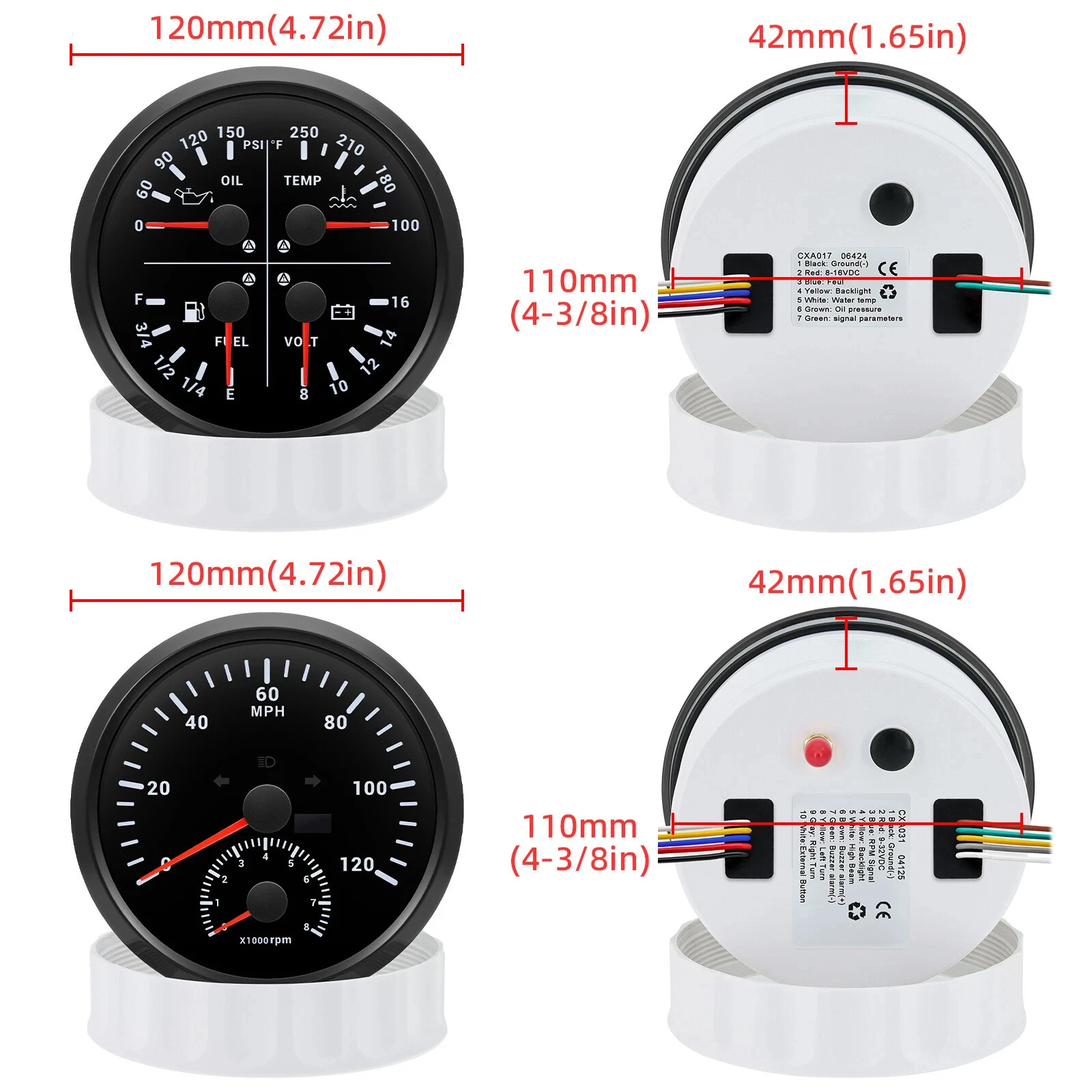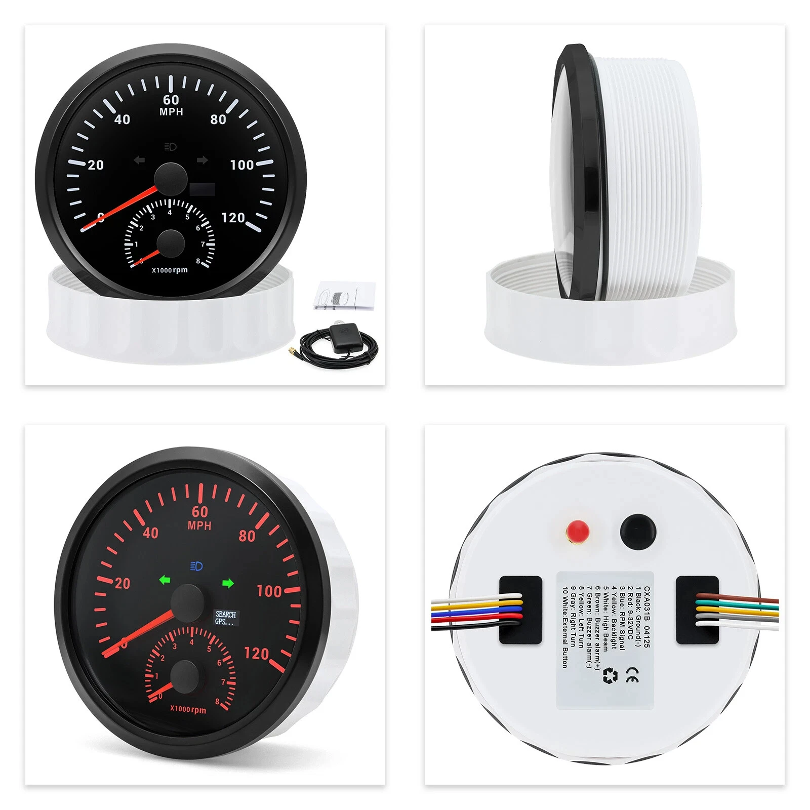 Features:Suitable for all vehicles and off-road vehiclesAnalog Display Speedometer & Tachometer & Digital Display Odometer.Speedometer with Turn Signal & High Beam Function.High Quality Stepper Motor Movement.Convex Clear Lens. 316 Stainless Steel Bezel & ABS Plastic Housing.Black Gauge Faceplate. Red Needle.RED LED Illumination.IP67 Waterproof. Rustproof. Anti-Fog & UV-Resistant.Tachometer Fits Both Gas & Diesel Powered Engine.4 In 1 Multi-Function Gauge with Warning Function.2 IN 1 Multi-Function Gauge Requires 12 / 24 Volt Negative Ground Systems.4 IN 1 Multi-Function Gauge Requires 12 Volt Negative Ground Systems.Most importantly. the gauge is easy to setup. and can be used in all vehicles. boats and off-road vehicles.GPS Speedometer Specifications:Application: Universal fit for Motorcycle/ Boat/Truck/Bus/CarElectronic Speedometer (stepper motor)No Mechanic Sensor. get speed signal from GPSSpeed ≠0 and show accurate speed in tunnel with the help of accelerometerGPS Blind Area Odometer CompensationOverSpeed Buzzer Alarm (Value Adjustable)Indication Light (Left. Right and High Beam)Installation Diameter: 110mm (4 3/8")Speed Range: 0~120MPHRPM Range : 0~8000RPMMileage Range: 0-99999.9milesWorking Voltage: 8-16VPower consumption:??120MAWorking temperatures: – 20 to 70°CStorage temperatures: -30 to 80??Protection rank: IP67 WaterproofReverse polarity protection and anti-fogging performance 4 In 1 Multi-Function GaugeFixing dimension: 110mm (4 3/8") Indicating Range: Oil press. meter: 0-150PSI;Water temp. meter: 100-250?HFuel level meter: 0-100%. empty-full;  0-190ohms/240-33ohms. The signal can be adjustedVoltmeter: 8-16VWorking Voltage: 12V Input Signal:10-184ohms for 0-10Bar oil pressure meter;0-100% for fuel level meter;(Default 0-190ohms. can adjust to 240-33ohms before delivery)8-16V voltage meter;Input Signal 301-22ohms for water temperature meterRed backlightProtection grade is IP67. the whole body is completely waterproof;Excellent antifogging function;316 Stainless steel bezel with curved glass;Convenient Installation by multi-plug socket connecting way;Accessories: matched with connectors. Installation InstructionAlarm Value:1. Fuel??13% Alarm2. Oil pressure ??0.8Bar Alarm3. Water temp.??95?? Alarm4. Voltage??11.5V Alarm Package Included:1 x 110mm 4 in 1 Multifunctional Gauge1 x 110mm GPS Speedometer Gauge1 x GPS Antenna1 x Tacho sensor1 x Water temp sensor 1/8NPT1 x Oil pressure sensor 1/8NPT2 x Cable2 x Installation Instruction