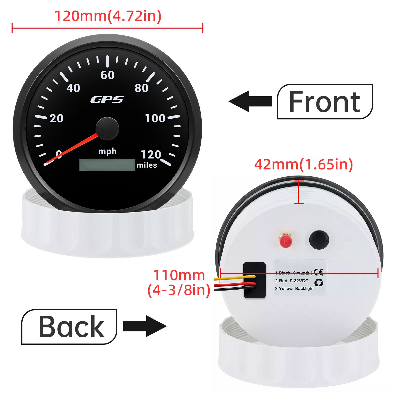 Feature:High-brightness LED backlight.316 stainless steel for long-term use even in acid-base. humid environment.IP67 waterproof and dust-proof grade.With curved glass( with anti-fog function).Suitable for all kinds of vehicle modification.Using stepper motor drive pointer. accurate display of the engine speed. and with the LCD display clear display mileage.Gauges have many kinds backlight color (red.yellow.orange.green.blue.purple.white).customers can adjust any color that you like.GPS Speedometer GaugeInstall Diameter: Φ110mm (4-3/8")Signal: GPSWorking Voltage: 9~32V DCSize: 12x8x12cm/4.72×3.1×4.75 inchUnits: MPHColors:Black&SilverIndication Range: 0-120MPHBacklight: 7Colors LEDPackage Includes:1X 110MM GPS Speedometer Gauge1X Wire Harness1X GPS Antenna1X Installation Instruction