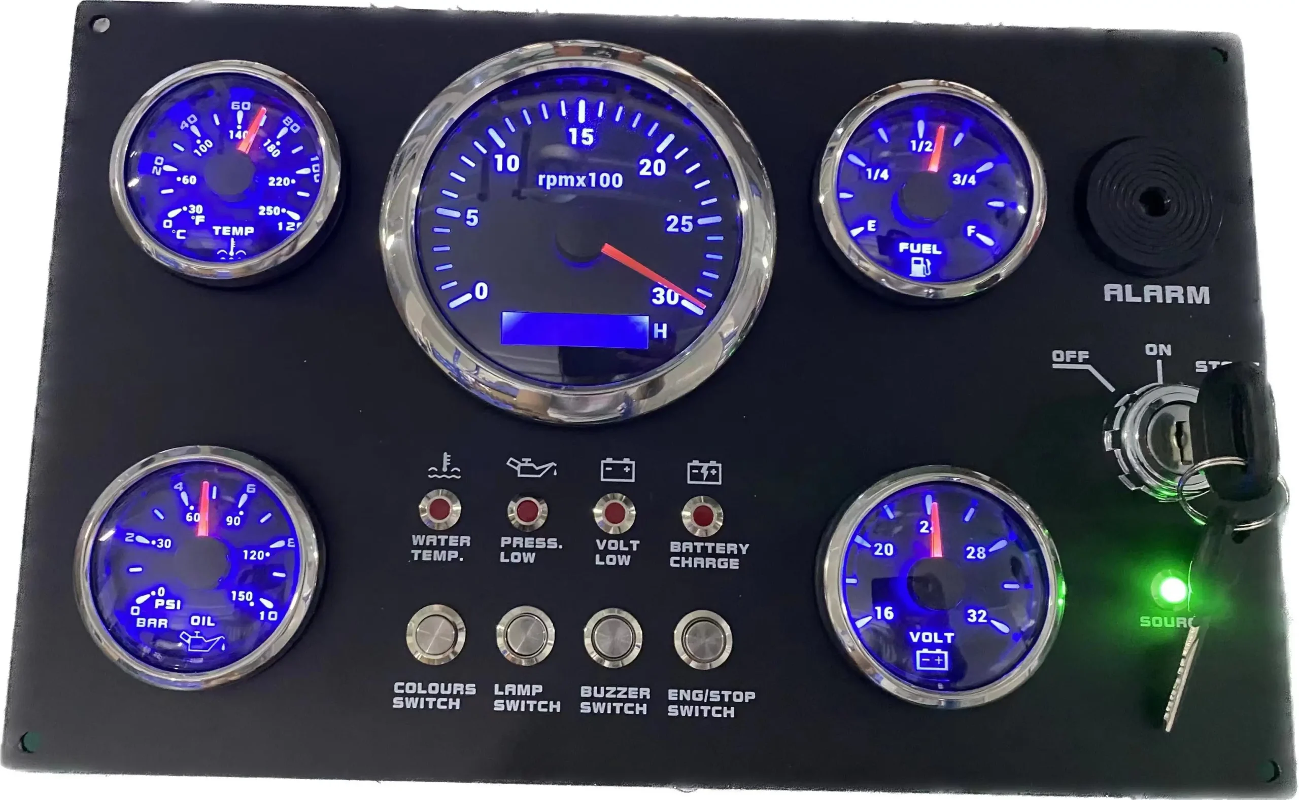 Features: | The gauge can be change: Tachometer with Digital Hour Meter:0-3000/4000/6000/7000/8000RPM Water Temperature gauge:40-120degree Oil Pressure gauge:0-5bar/0-10bar Volt meter:8-16V/16-32V Fuel Level gauge:0-190ohm/240-330hm Marine grade push button Switch (Engine Stop or Pre-heat) Marine grade Ignition key Sealed Key Switch. 4-position With Anti-restart 10A at 12V Four positions: Accessory – Off – Ignition/Accessory – Start. Spring return to Off. Key switch is constructed from engineering thermoplastic and is fully sealed using O-rings and ultrasonic welding to protect switch to ip67 (with connector installed). Plastic face nut and nickel-plated brass backing nut. Supplied with two matching keys. and with protective key boot. 2 tone Alarm Pizzo Siren |