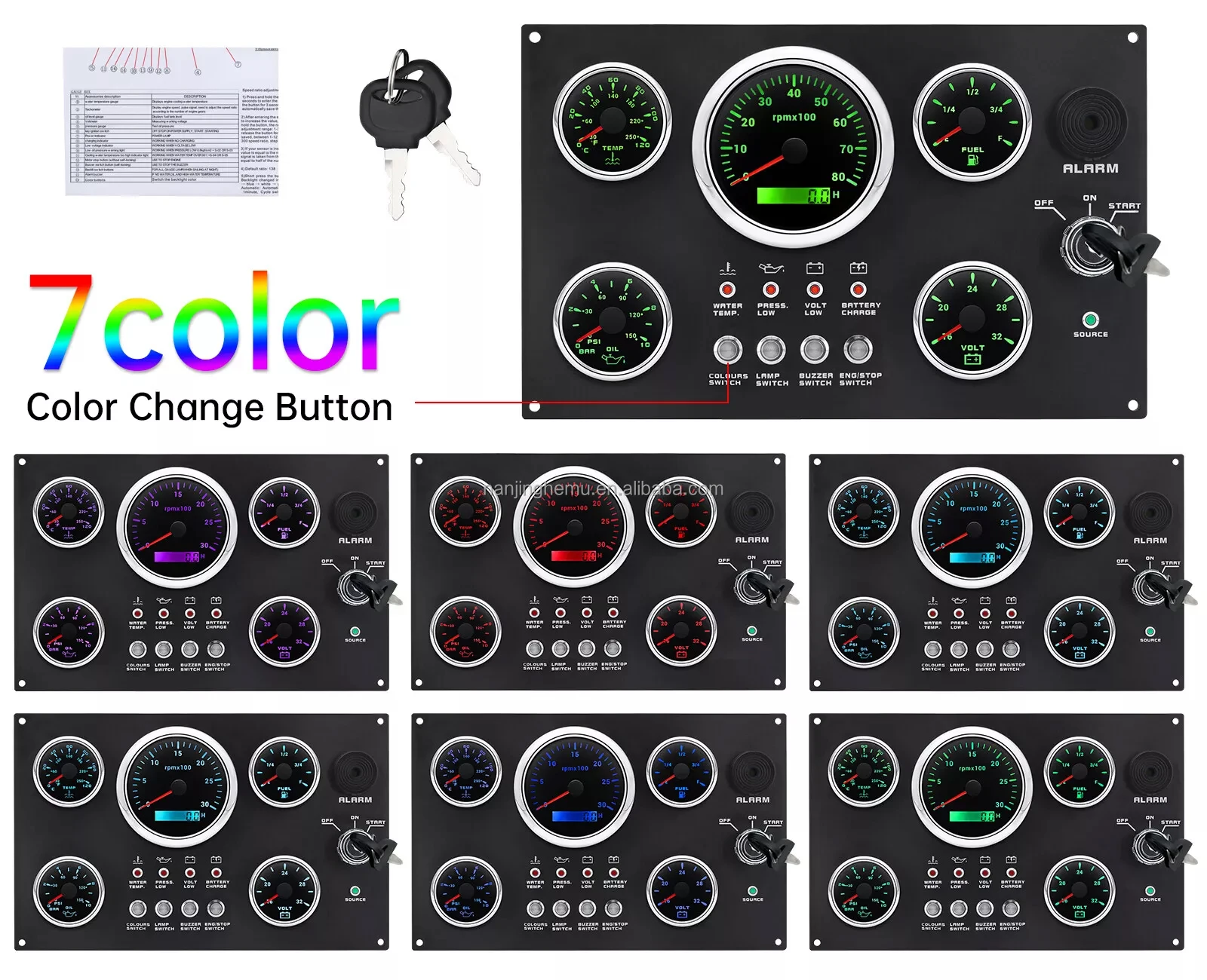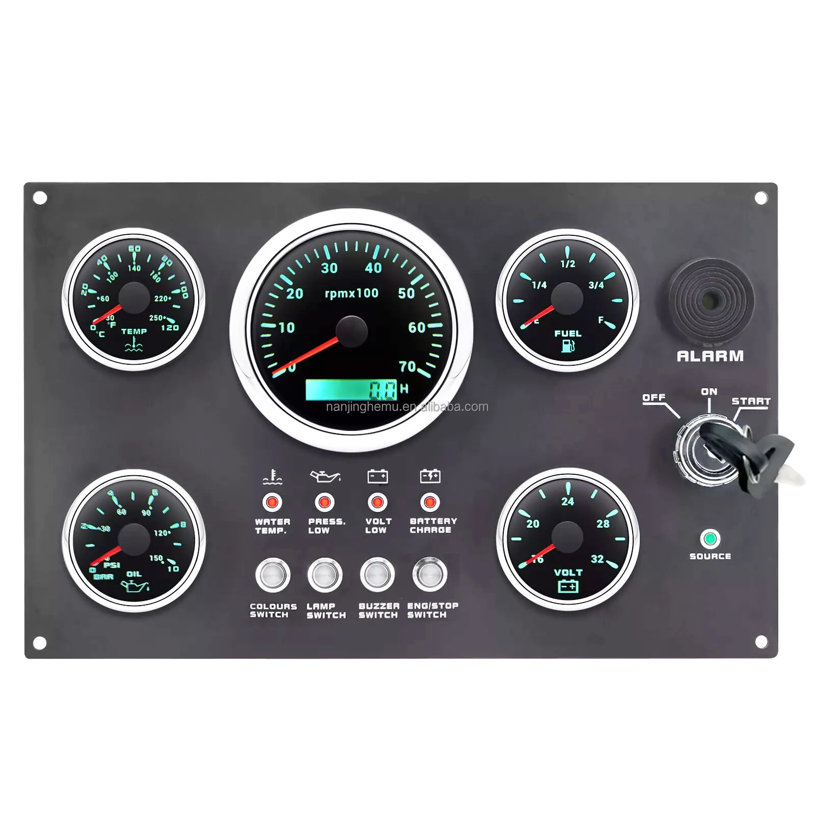 Features: | The gauge can be change: Tachometer with Digital Hour Meter:0-3000/4000/6000/7000/8000RPM Water Temperature gauge:40-120degree Oil Pressure gauge:0-5bar/0-10bar Volt meter:8-16V/16-32V Fuel Level gauge:0-190ohm/240-330hm Marine grade push button Switch (Engine Stop or Pre-heat) Marine grade Ignition key Sealed Key Switch. 4-position With Anti-restart 10A at 12V Four positions: Accessory – Off – Ignition/Accessory – Start. Spring return to Off. Key switch is constructed from engineering thermoplastic and is fully sealed using O-rings and ultrasonic welding to protect switch to ip67 (with connector installed). Plastic face nut and nickel-plated brass backing nut. Supplied with two matching keys. and with protective key boot. 2 tone Alarm Pizzo Siren |