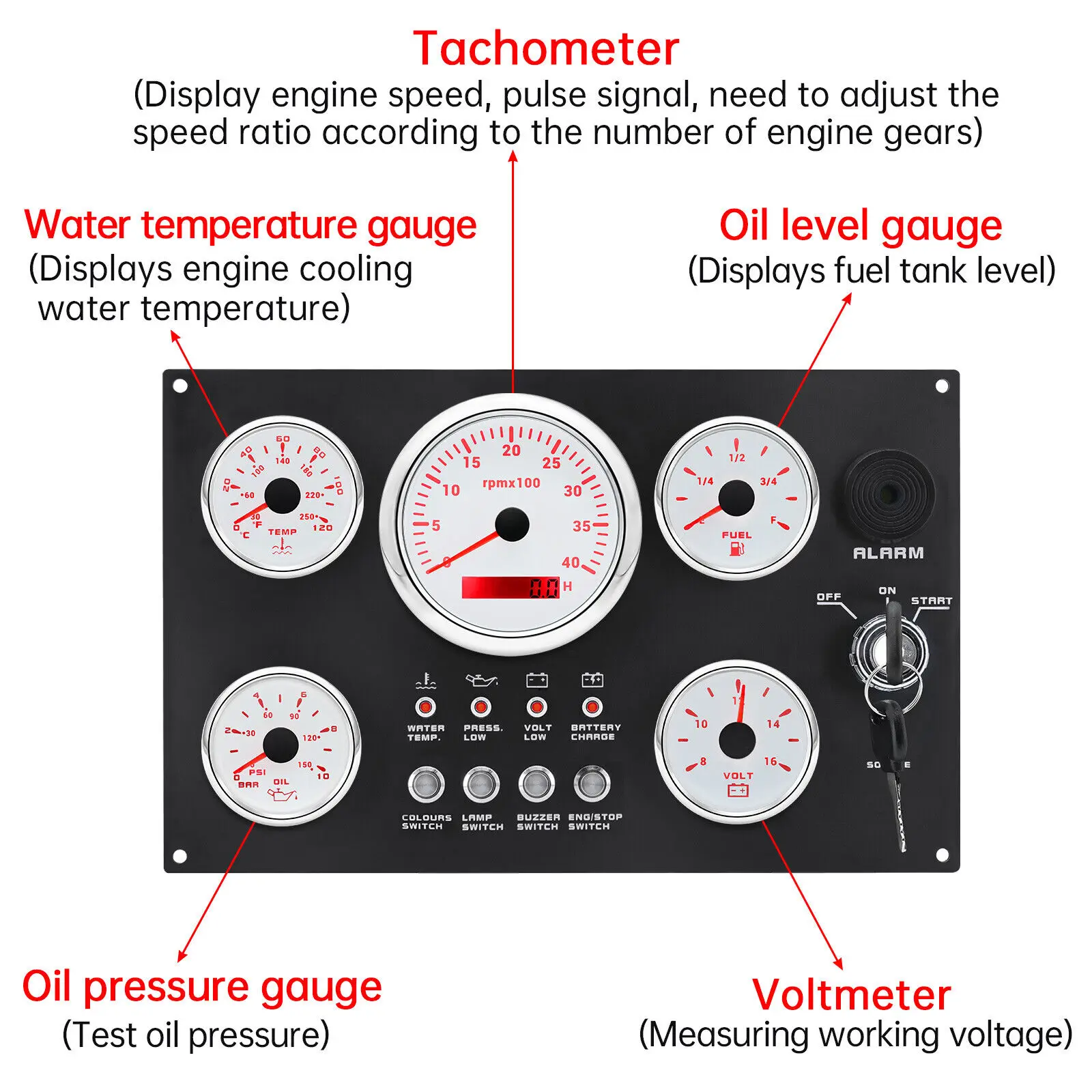 Features: | The gauge can be change: Tachometer with Digital Hour Meter:0-3000/4000/6000/7000/8000RPM Water Temperature gauge:40-120degree Oil Pressure gauge:0-5bar/0-10bar Volt meter:8-16V/16-32V Fuel Level gauge:0-190ohm/240-330hm Marine grade push button Switch (Engine Stop or Pre-heat) Marine grade Ignition key Sealed Key Switch. 4-position With Anti-restart 10A at 12V Four positions: Accessory – Off – Ignition/Accessory – Start. Spring return to Off. Key switch is constructed from engineering thermoplastic and is fully sealed using O-rings and ultrasonic welding to protect switch to ip67 (with connector installed). Plastic face nut and nickel-plated brass backing nut. Supplied with two matching keys. and with protective key boot. 2 tone Alarm Pizzo Siren |