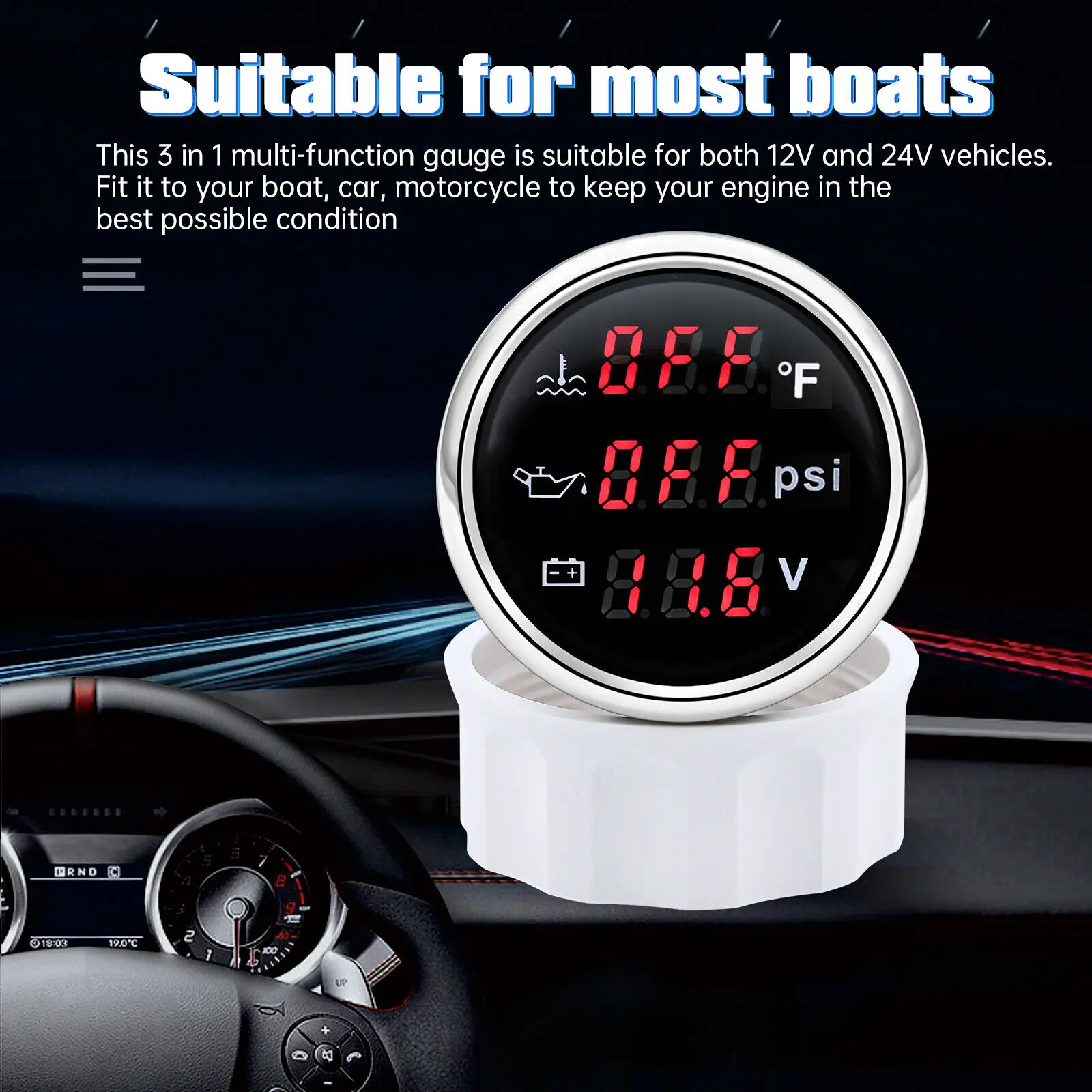 2'' 52MM 3 IN 1 Gauge Boat Car Water Temp ?H Oil Pressure PSI Voltage with Sender