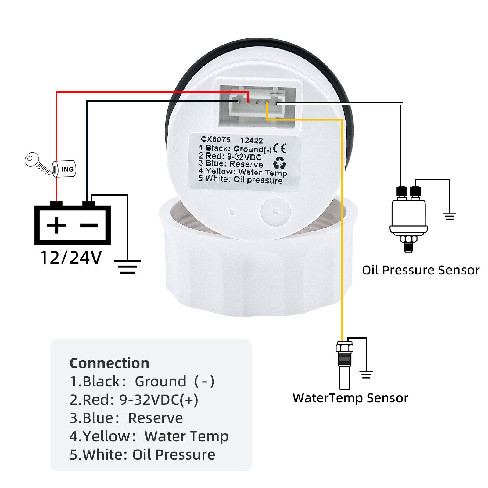 Features:Water Temperature: 100-250?H (Temperature sensor: 301-22ohm)Oil Pressure: 0-145 PSI (Pressure sensor: 10-184ohm)Sensor are not provided with this gauge.Plz. order the sensor separately if you need it.Voltmeter: 9-32VAlarm: Symbal flashing(When 2 or more faults occur. an item is reported every 3s.)Degree of Protection: IP67Backlight: TFT Screen Dimensions:52mm diameter (2")55mm Depth (2-3/4") Package Included:1x 3 in 1 Multi-function Gauge1x 1/8NPT Temp Sensor1x 1/8NPT Oil pressure1x Multi-plug socket1x Instruction