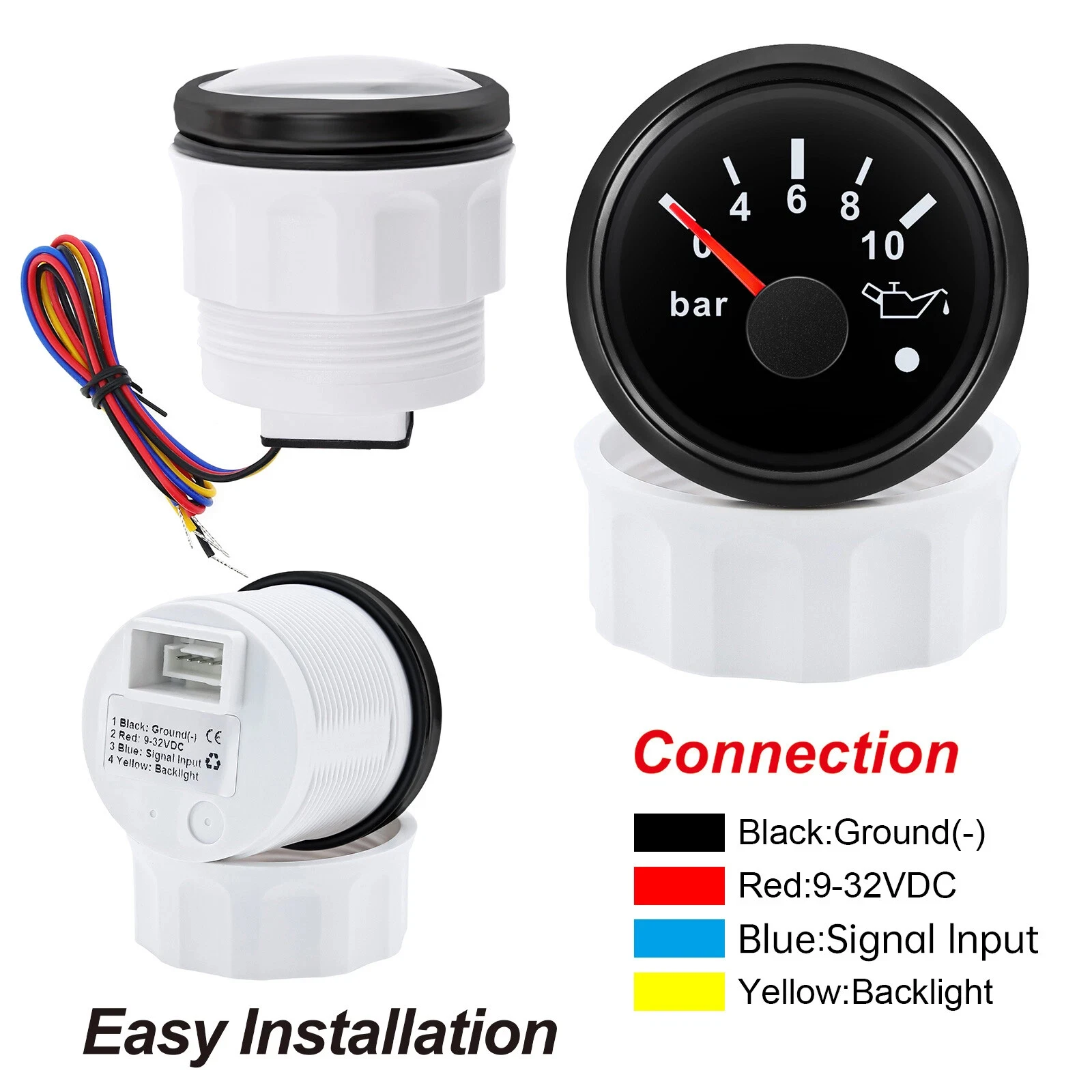 2" 52mm Car Truck Oil Pressure Gauge 0-10Bar Meter With 1/8NPT Press Sensor 12V 24V