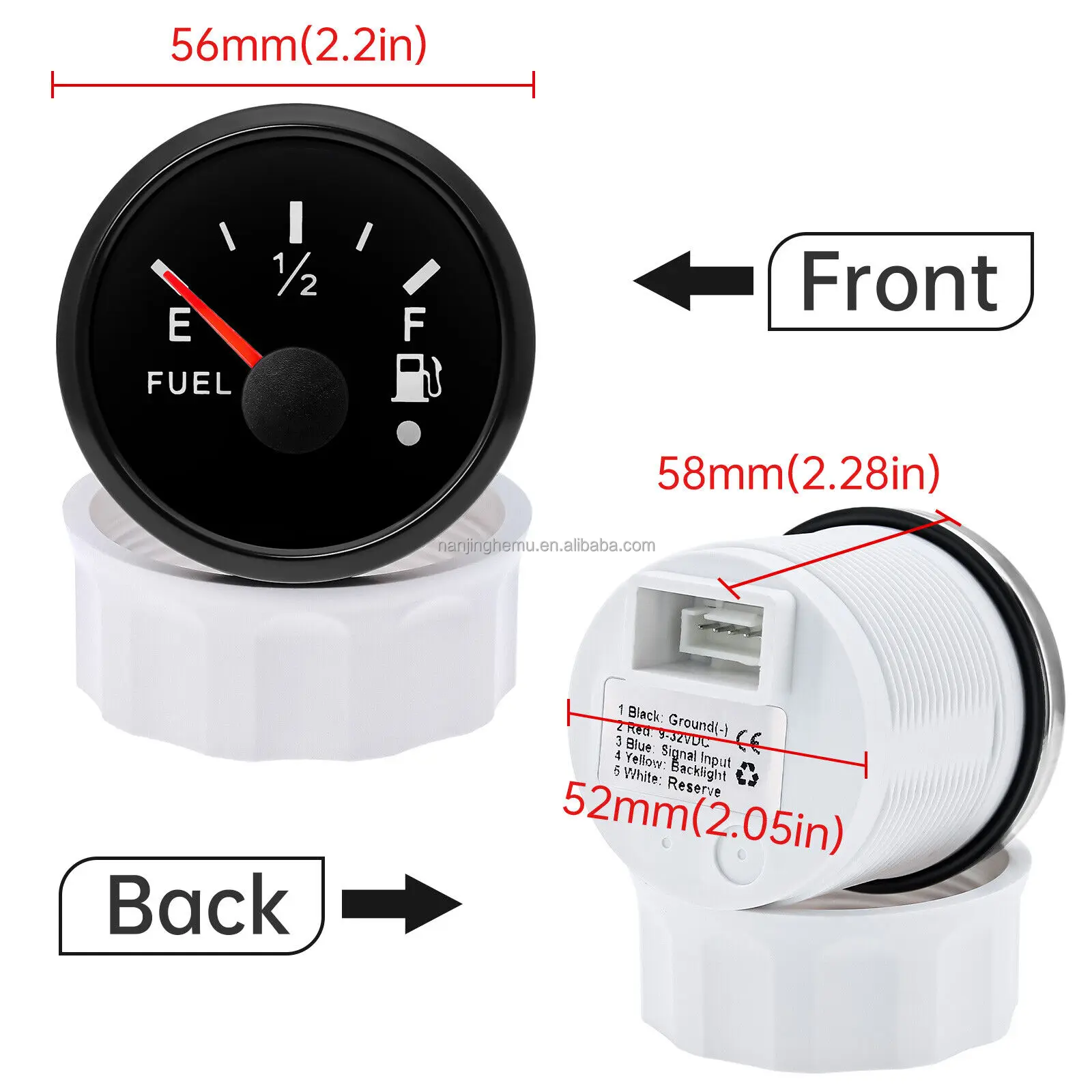 Warning Alarm: When fuel level low than 13%. the warning light will flash.FeaturesThis gauge have 7 backlight color : red??green??blue??yellow??olivine??orange??purple. totally 7kinds different backlight color. it will change automatically every 1 minute.Fantastic waterproof Function: Can work in the water.You can fix only one color you like by pressing the gauge back "set" buttonGauges front cover use stainless steel 316L for long-term use even in acid-base and humid environmentIP67 waterproof and dustproof gradeStepper motors used for full range of stepping gauges.great feature with its less power consumption.longer life.higher precision etc.With curved glass (with anti-fog function)With ultra-wide working voltage design (long-term operating voltage:9-32v.maximum up to:36v)There is a snap together with the harness connector.for best and firmly connected.in order that the gauges could work even in strongviberation.products can be used for the engines/generating units.ships.construction machinery.agricultural machinery.automotive modification etc. Specifications:Material:stainless steel 316L+anti-fog glassInstall diameter:Φ52mm or 2-1/16"Indication range:E-FBacklight color:red.yellow.orange.green.blue.purple.yellow green. You can choose what you need color that press the gauge back buttonWorking voltage:9-32VDCInput signal:240-33ohmWorking current:≤60mAOperating temperature:-30??~+75??Storage temperature:-40??~+85??Grade of protection:IP67 Package included1 x Fuel level gauge1 x Wiring harness??1 x Instruction manual