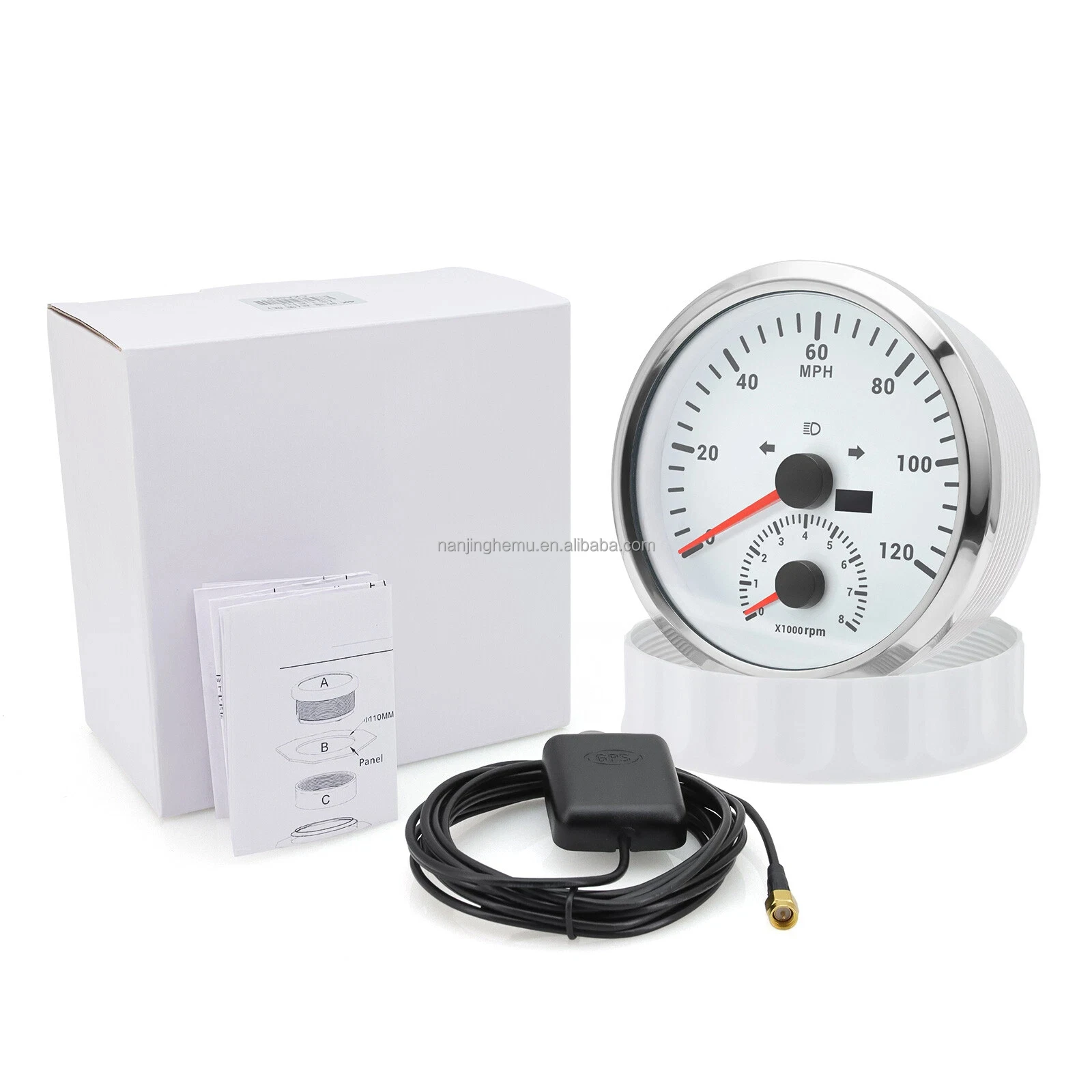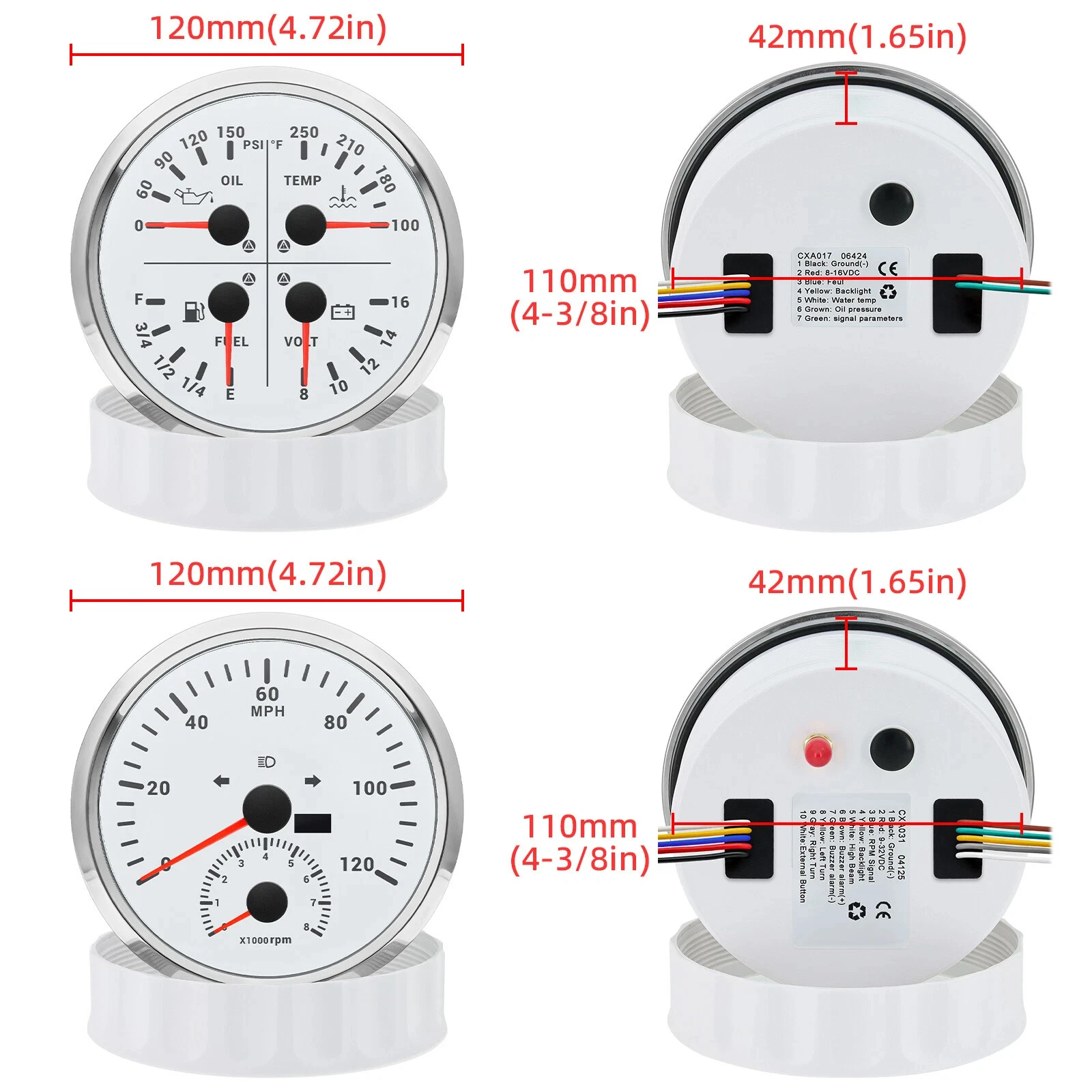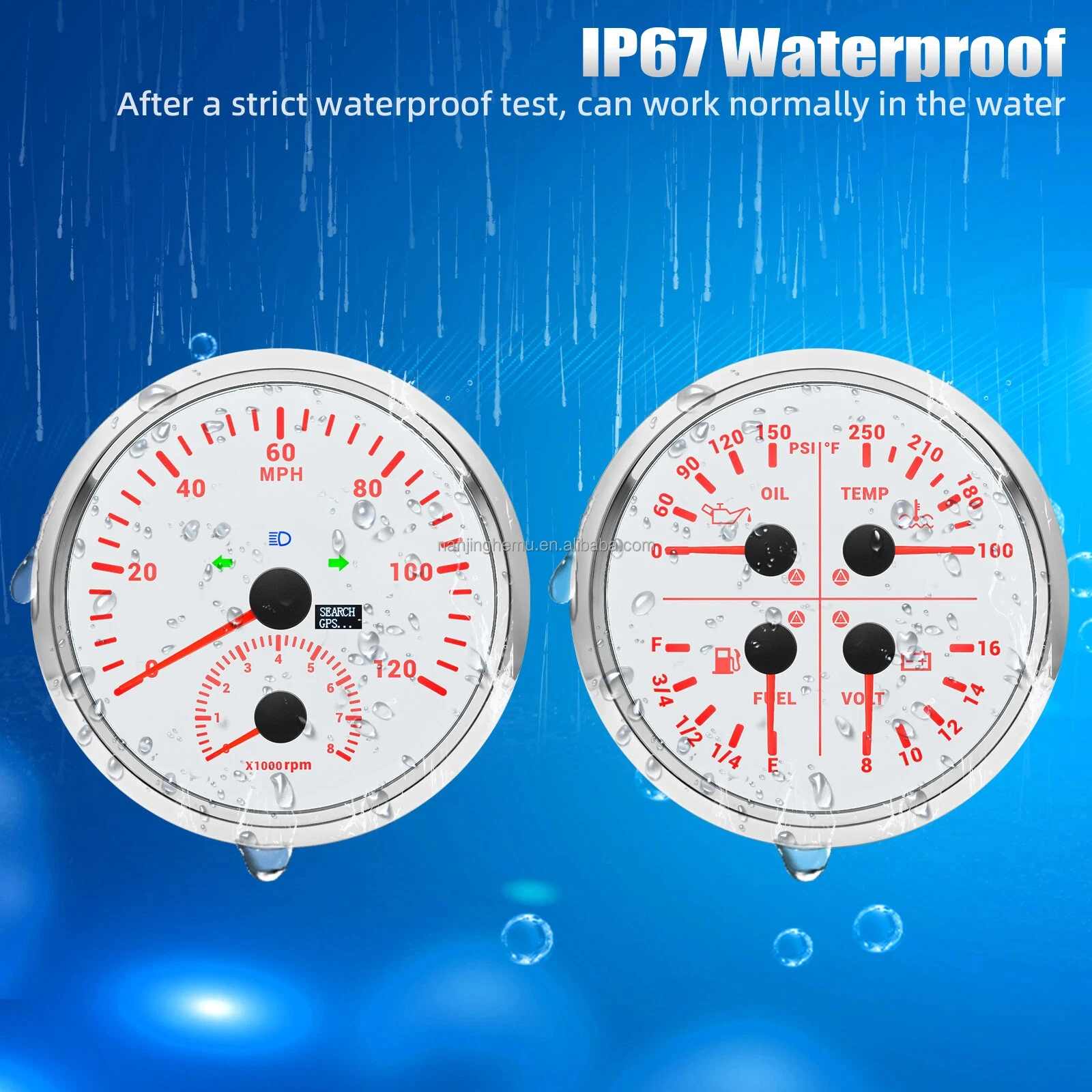 Features:Suitable for all vehicles and off-road vehiclesAnalog Display Speedometer & Tachometer & Digital Display Odometer.Speedometer with Turn Signal & High Beam Function.High Quality Stepper Motor Movement.Convex Clear Lens. 316 Stainless Steel Bezel & ABS Plastic Housing.Black Gauge Faceplate. Red Needle.RED LED Illumination.IP67 Waterproof. Rustproof. Anti-Fog & UV-Resistant.Tachometer Fits Both Gas & Diesel Powered Engine.4 In 1 Multi-Function Gauge with Warning Function.2 IN 1 Multi-Function Gauge Requires 12 / 24 Volt Negative Ground Systems.4 IN 1 Multi-Function Gauge Requires 12 Volt Negative Ground Systems.Most importantly. the gauge is easy to setup. and can be used in all vehicles. boats and off-road vehicles.GPS Speedometer Specifications:Application: Universal fit for Motorcycle/ Boat/Truck/Bus/CarElectronic Speedometer (stepper motor)No Mechanic Sensor. get speed signal from GPSSpeed ≠0 and show accurate speed in tunnel with the help of accelerometerGPS Blind Area Odometer CompensationOverSpeed Buzzer Alarm (Value Adjustable)Indication Light (Left. Right and High Beam)Installation Diameter: 110mm (4 3/8")Speed Range: 0~120MPHRPM Range : 0~8000RPMMileage Range: 0-99999.9milesWorking Voltage: 8-16VPower consumption:??120MAWorking temperatures: – 20 to 70°CStorage temperatures: -30 to 80??Protection rank: IP67 WaterproofReverse polarity protection and anti-fogging performance 4 In 1 Multi-Function GaugeFixing dimension: 110mm (4 3/8") Indicating Range: Oil press. meter: 0-150PSI;Water temp. meter: 100-250?HFuel level meter: 0-100%. empty-full; 0-190ohms/240-33ohms. The signal can be adjustedVoltmeter: 8-16VWorking Voltage: 12V Input Signal:10-184ohms for 0-10Bar oil pressure meter;0-100% for fuel level meter;(Default 0-190ohms. can adjust to 240-33ohms before delivery)8-16V voltage meter;Input Signal 301-22ohms for water temperature meterRed backlightProtection grade is IP67. the whole body is completely waterproof;Excellent antifogging function;316 Stainless steel bezel with curved glass;Convenient Installation by multi-plug socket connecting way;Accessories: matched with connectors. Installation InstructionAlarm Value:1. Fuel??13% Alarm2. Oil pressure ??0.8Bar Alarm3. Water temp.??95?? Alarm4. Voltage??11.5V Alarm Package Included:1 x 110mm 4 in 1 Multifunctional Gauge1 x 110mm GPS Speedometer Gauge1 x GPS Antenna1 x Tacho sensor1 x Water temp sensor 1/8NPT1 x Oil pressure sensor 1/8NPT2 x Cable2 x Installation Instruction