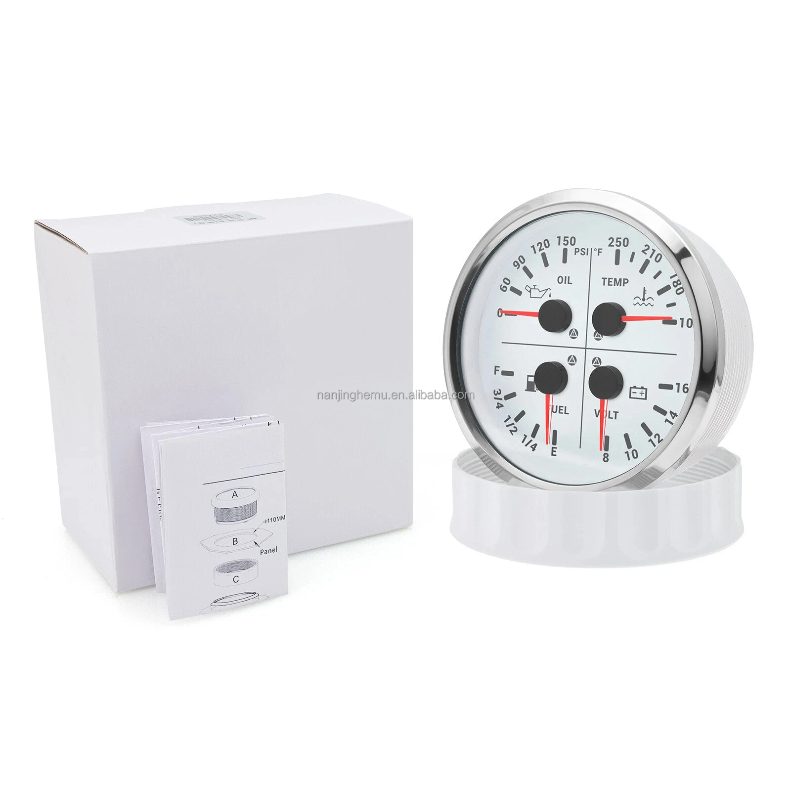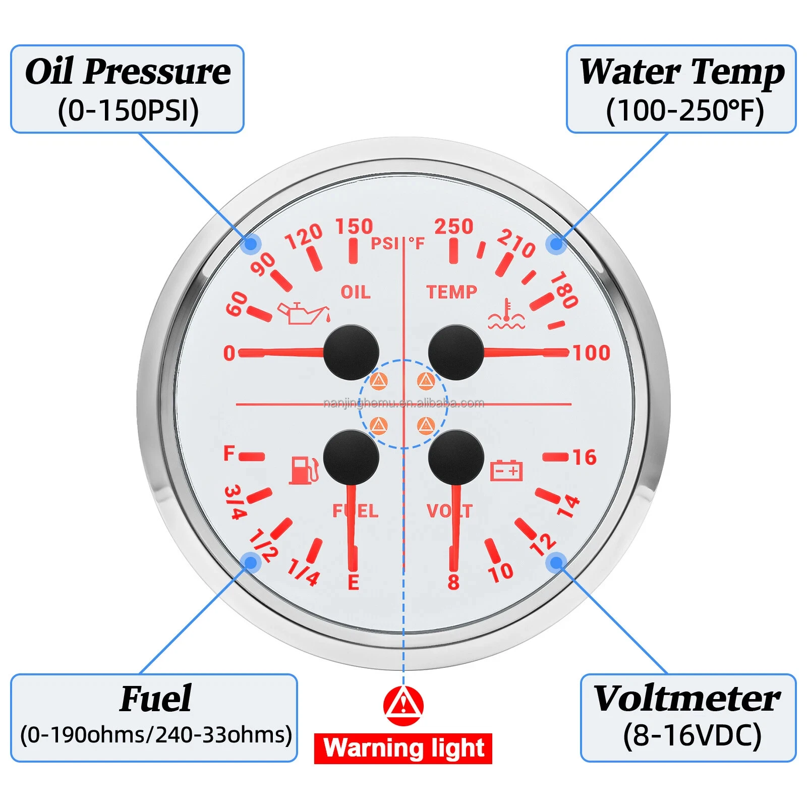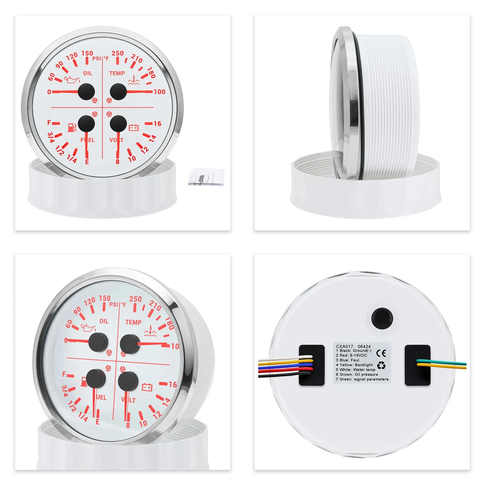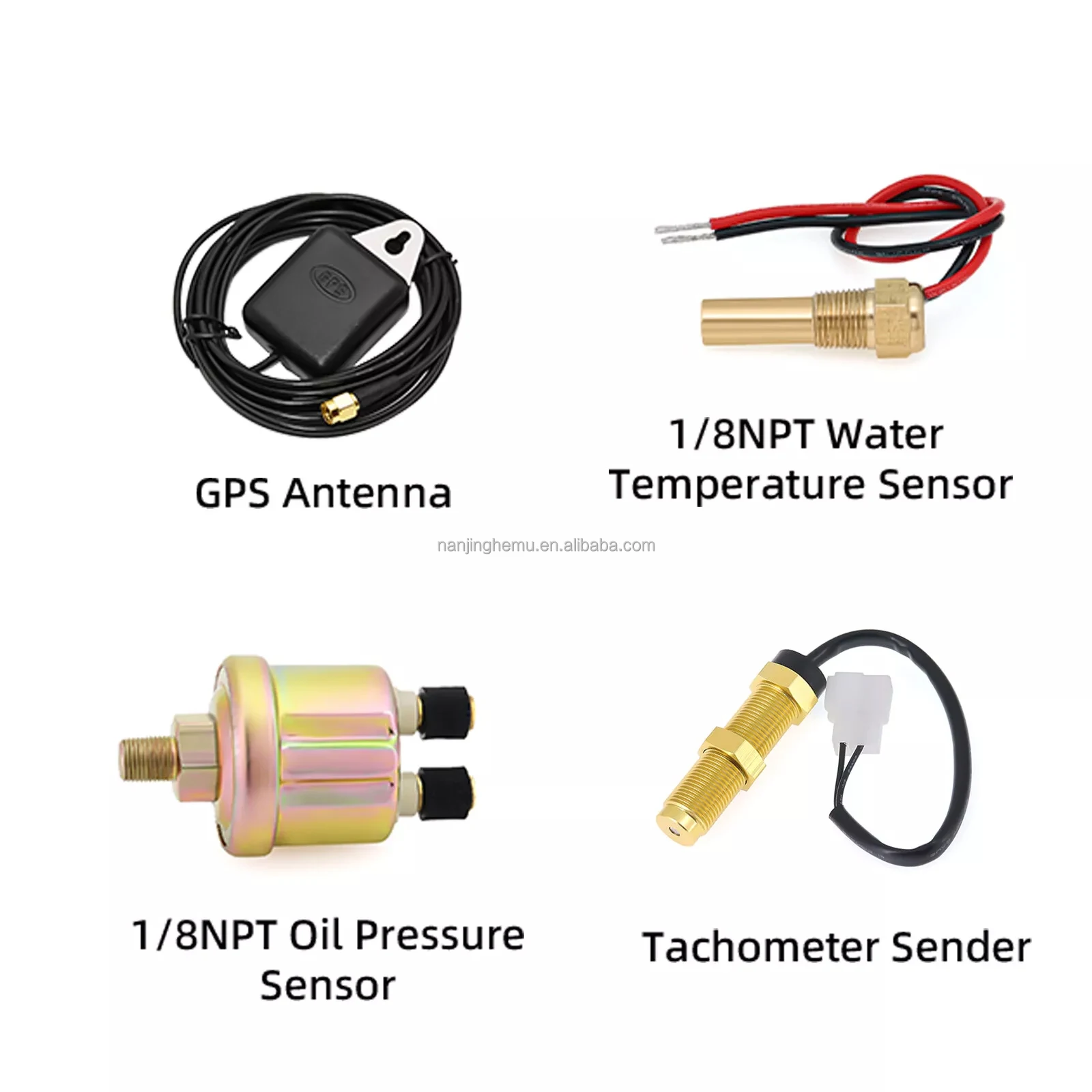Features:Suitable for all vehicles and off-road vehiclesAnalog Display Speedometer & Tachometer & Digital Display Odometer.Speedometer with Turn Signal & High Beam Function.High Quality Stepper Motor Movement.Convex Clear Lens. 316 Stainless Steel Bezel & ABS Plastic Housing.Black Gauge Faceplate. Red Needle.RED LED Illumination.IP67 Waterproof. Rustproof. Anti-Fog & UV-Resistant.Tachometer Fits Both Gas & Diesel Powered Engine.4 In 1 Multi-Function Gauge with Warning Function.2 IN 1 Multi-Function Gauge Requires 12 / 24 Volt Negative Ground Systems.4 IN 1 Multi-Function Gauge Requires 12 Volt Negative Ground Systems.Most importantly. the gauge is easy to setup. and can be used in all vehicles. boats and off-road vehicles.GPS Speedometer Specifications:Application: Universal fit for Motorcycle/ Boat/Truck/Bus/CarElectronic Speedometer (stepper motor)No Mechanic Sensor. get speed signal from GPSSpeed ≠0 and show accurate speed in tunnel with the help of accelerometerGPS Blind Area Odometer CompensationOverSpeed Buzzer Alarm (Value Adjustable)Indication Light (Left. Right and High Beam)Installation Diameter: 110mm (4 3/8")Speed Range: 0~120MPHRPM Range : 0~8000RPMMileage Range: 0-99999.9milesWorking Voltage: 8-16VPower consumption:??120MAWorking temperatures: – 20 to 70°CStorage temperatures: -30 to 80??Protection rank: IP67 WaterproofReverse polarity protection and anti-fogging performance 4 In 1 Multi-Function GaugeFixing dimension: 110mm (4 3/8") Indicating Range: Oil press. meter: 0-150PSI;Water temp. meter: 100-250?HFuel level meter: 0-100%. empty-full; 0-190ohms/240-33ohms. The signal can be adjustedVoltmeter: 8-16VWorking Voltage: 12V Input Signal:10-184ohms for 0-10Bar oil pressure meter;0-100% for fuel level meter;(Default 0-190ohms. can adjust to 240-33ohms before delivery)8-16V voltage meter;Input Signal 301-22ohms for water temperature meterRed backlightProtection grade is IP67. the whole body is completely waterproof;Excellent antifogging function;316 Stainless steel bezel with curved glass;Convenient Installation by multi-plug socket connecting way;Accessories: matched with connectors. Installation InstructionAlarm Value:1. Fuel??13% Alarm2. Oil pressure ??0.8Bar Alarm3. Water temp.??95?? Alarm4. Voltage??11.5V Alarm Package Included:1 x 110mm 4 in 1 Multifunctional Gauge1 x 110mm GPS Speedometer Gauge1 x GPS Antenna1 x Tacho sensor1 x Water temp sensor 1/8NPT1 x Oil pressure sensor 1/8NPT2 x Cable2 x Installation Instruction