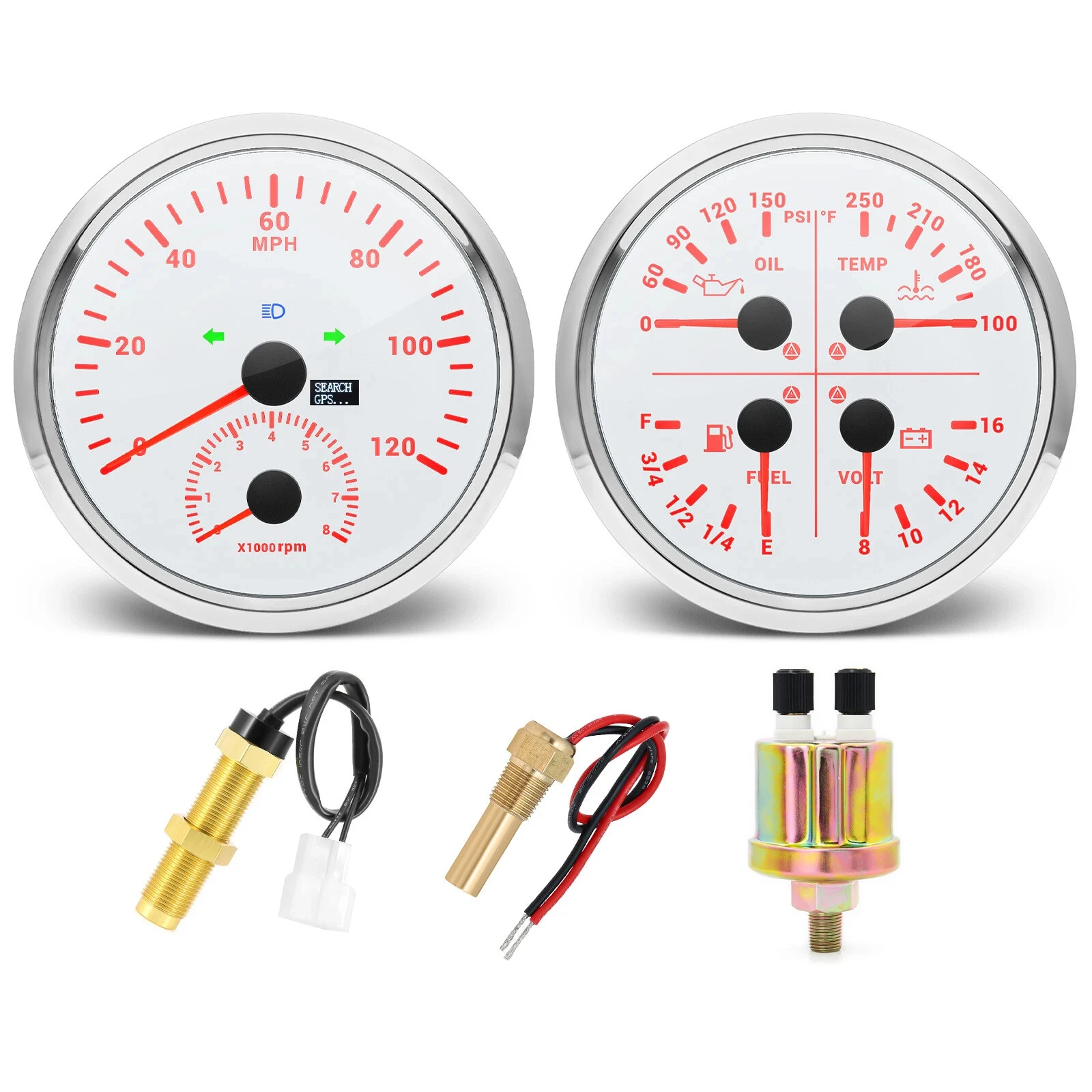 2 Gauge Set 110mm GPS Speedometer Tachometer 0-120MPH & 4in 1 Gauge with Senders