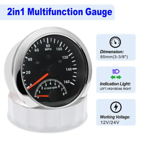 Features:Suitable for all vehicles and off-road vehiclesThe signal comes directly from the satellite signal receiver(GPS Antenna). don't need other speed sensor.The gauge has the advantages of high precision. quick location confirmation and short start up time.IP67 waterproof and dustproof gradeReverse polarity protection and anti-fogging performanceStepper motors used for full range of stepping gauges. great feature with its less power consumption. longer life. higher precision. etc.Most importantly. the gauge is easy to setup. and can be used in all vehicles. boats and off-road vehicles.Speedometer Specifications:Application: Universal fit for Motorcycle/ Boat/Truck/Bus/CarElectronic Speedometer (stepper motor)No Mechanic Sensor. get speed signal from GPSSpeed ≠0 and show accurate speed in tunnel with the help of accelerometerGPS Blind Area Odometer CompensationOverSpeed Buzzer Alarm (Value Adjustable)Indication Light (Left. Right and High BeamInstallation Diameter: 85mm (3 3/8")Speed Range: 0~160MPHRPM Range : 0~8000RPMMileage Range: 0-99999.9milesWorking Voltage: 12V/24VWorking temperatures: – 40 to 85°CProtection rank: IP67 WaterproofReverse polarity protection and anti-fogging performance4 IN 1 Gauge Technical Data:Fixing dimension: 85mmIndicating Range: Oil press. meter: 0-150PSI;Water temp. meter: 100-250?HFuel level meter: 0-190ohms/240-33ohms. empty-full; The signal can be adjustedVoltmeter: 8-16VWorking Voltage: 12VInput Signal:10-184ohms for 0-10Bar oil pressure meter;0-190ohms for fuel level meter;(Default 0-190ohms. can adjust to 240-33ohms)8-16V voltage meter;Input Signal 320-22ohms for water temperature meterRed backlightProtection grade is IP67. the whole body is completely waterproof;Excellent antifogging function;316 Stainless steel bezel with curved glass;Convenient Installation by multi-plug socket connecting way;Accessories: matched with connectors. Installation InstructionPackage Included: