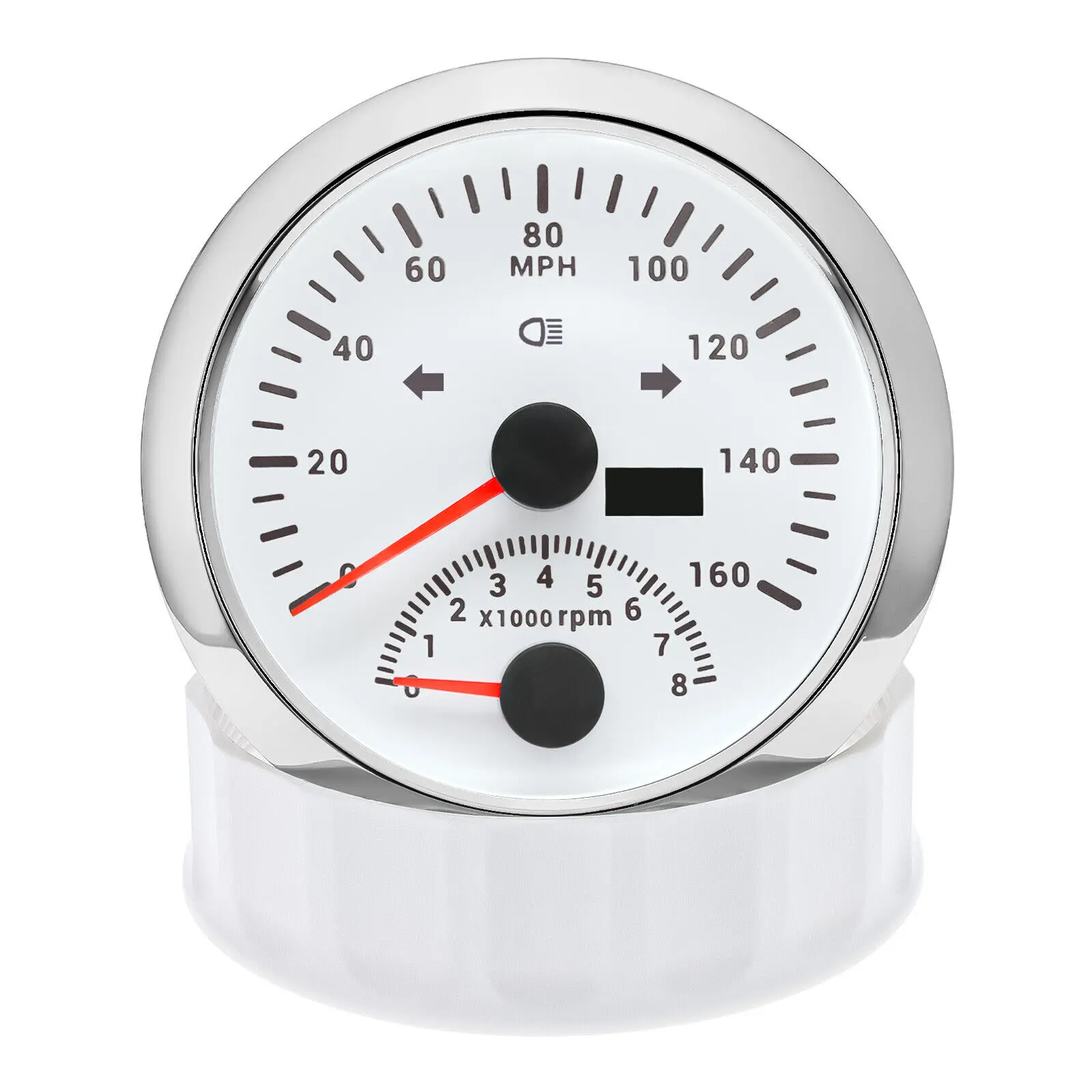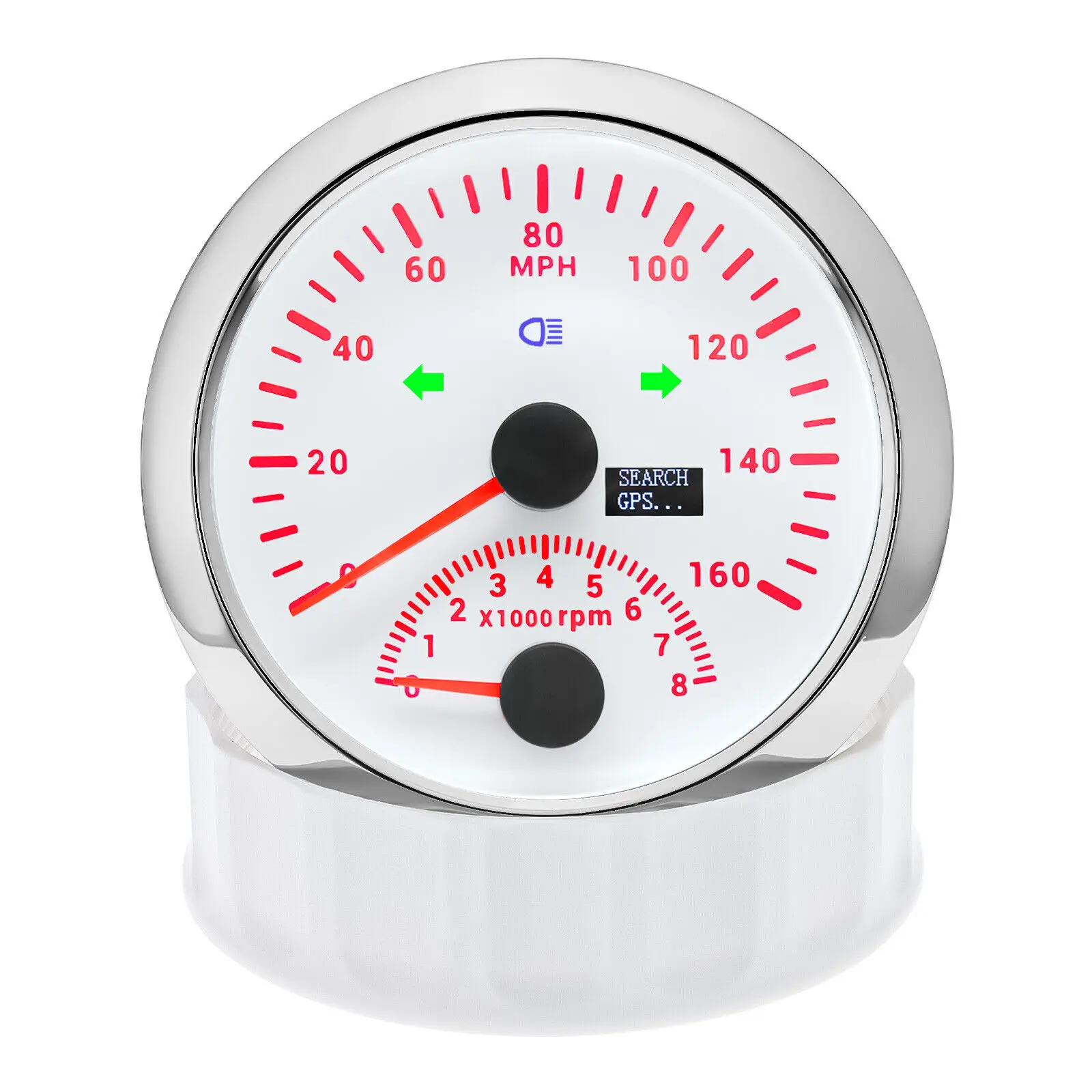 Features:Suitable for all vehicles and off-road vehiclesThe signal comes directly from the satellite signal receiver(GPS Antenna). don't need other speed sensor.The gauge has the advantages of high precision. quick location confirmation and short start up time.IP67 waterproof and dustproof gradeReverse polarity protection and anti-fogging performanceStepper motors used for full range of stepping gauges. great feature with its less power consumption. longer life. higher precision. etc.Most importantly. the gauge is easy to setup. and can be used in all vehicles. boats and off-road vehicles.Speedometer Specifications:Application: Universal fit for Motorcycle/ Boat/Truck/Bus/CarElectronic Speedometer (stepper motor)No Mechanic Sensor. get speed signal from GPSSpeed ≠0 and show accurate speed in tunnel with the help of accelerometerTotal Mileage AdjustableGPS Blind Area Odometer CompensationOverSpeed Buzzer Alarm (Value Adjustable)Indication Light (Left. Right and High BeamInstallation Diameter: 85mm (3 3/8")Speed Range: 0~160MPHRPM Range : 0~8000RPMMileage Range: 0-99999.9milesWorking Voltage: 12V/24VWorking temperatures: – 40 to 85°CProtection rank: IP67 WaterproofReverse polarity protection and anti-fogging performance4 IN 1 Gauge Technical Data:Fixing dimension: 85mmIndicating Range: Oil press. meter: 0-150PSI;Water temp. meter: 100-250?HFuel level meter: 0-190ohms/240-33ohms. empty-full; The signal can be adjustedVoltmeter: 8-16VWorking Voltage: 12VInput Signal:10-184ohms for 0-10Bar oil pressure meter;0-190ohms for fuel level meter;(Default 0-190ohms. can adjust to 240-33ohms)8-16V voltage meter;Input Signal 320-22ohms for water temperature meterRed backlightProtection grade is IP67. the whole body is completely waterproof;Excellent antifogging function;316 Stainless steel bezel with curved glass;Convenient Installation by multi-plug socket connecting way;Accessories: matched with connectors. Installation InstructionPackage Included:1 x 85mm 4 in 1 Multifunctional Gauge1 x 85mm GPS Speedometer Gauge1 x GPS Antenna2 x Cable2 x Installation Instruction