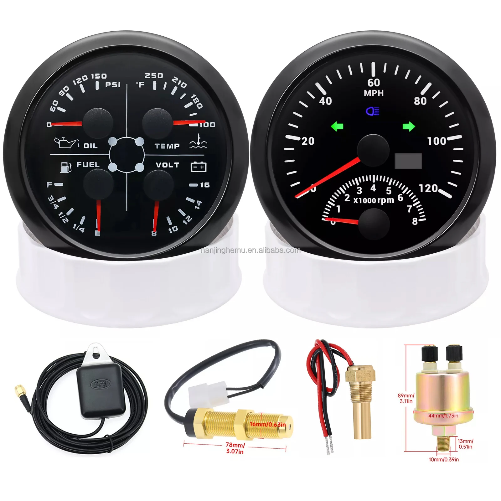 Features:Suitable for all vehicles and off-road vehiclesThe signal comes directly from the satellite signal receiver(GPS Antenna). don't need other speed sensor.The gauge has the advantages of high precision. quick location confirmation and short start up time.IP67 waterproof and dustproof gradeReverse polarity protection and anti-fogging performanceStepper motors used for full range of stepping gauges. great feature with its less power consumption. longer life. higher precision. etc.Most importantly. the gauge is easy to setup. and can be used in all vehicles. boats and off-road vehicles.Speedometer Specifications:Application: Universal fit for Motorcycle/ Boat/Truck/Bus/CarElectronic Speedometer (stepper motor)No Mechanic Sensor. get speed signal from GPSSpeed ≠0 and show accurate speed in tunnel with the help of accelerometerGPS Blind Area Odometer CompensationOverSpeed Buzzer Alarm (Value Adjustable)Indication Light (Left. Right and High BeamInstallation Diameter: 85mm (3 3/8")Speed Range: 0~160MPHRPM Range : 0~8000RPMMileage Range: 0-99999.9milesWorking Voltage: 12V/24VWorking temperatures: – 40 to 85°CProtection rank: IP67 WaterproofReverse polarity protection and anti-fogging performance4 IN 1 Gauge Technical Data:Fixing dimension: 85mmIndicating Range: Oil press. meter: 0-150PSI;Water temp. meter: 100-250?HFuel level meter: 0-190ohms/240-33ohms. empty-full; The signal can be adjustedVoltmeter: 8-16VWorking Voltage: 12VInput Signal:10-184ohms for 0-10Bar oil pressure meter;0-190ohms for fuel level meter;(Default 0-190ohms. can adjust to 240-33ohms)8-16V voltage meter;Input Signal 320-22ohms for water temperature meterRed backlightProtection grade is IP67. the whole body is completely waterproof;Excellent antifogging function;316 Stainless steel bezel with curved glass;Convenient Installation by multi-plug socket connecting way;Accessories: matched with connectors. Installation InstructionPackage Included: