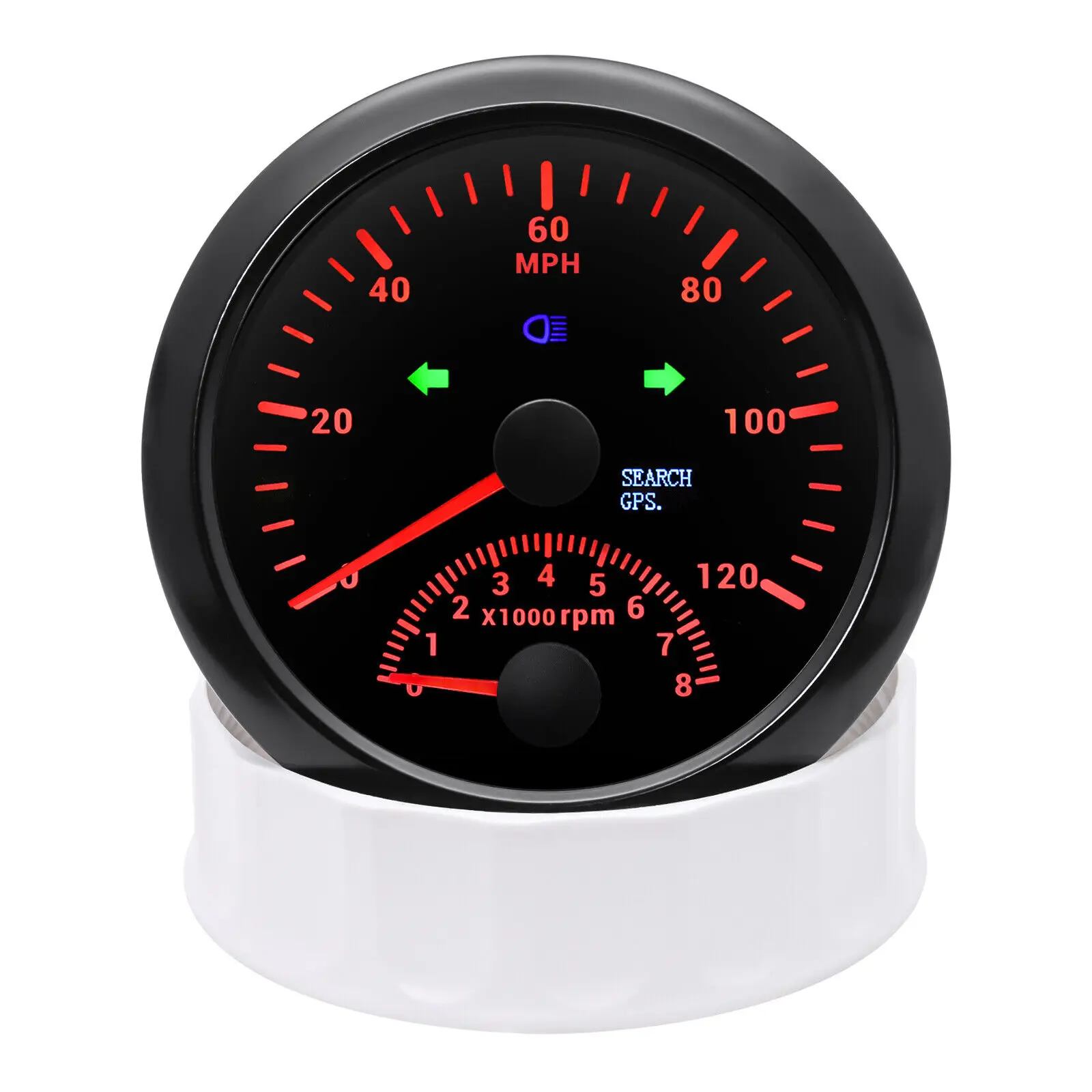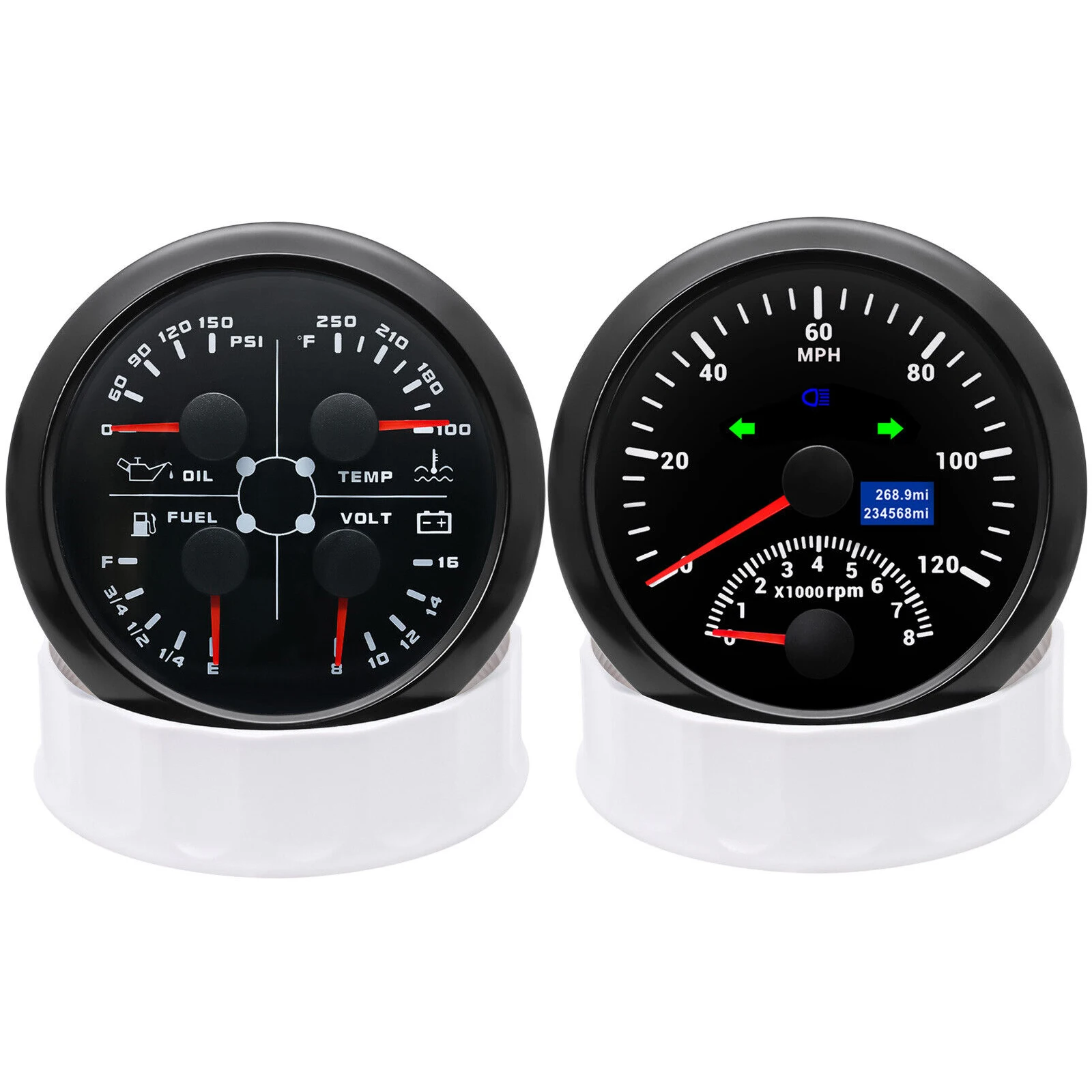 Features:Suitable for all vehicles and off-road vehiclesThe signal comes directly from the satellite signal receiver(GPS Antenna). don't need other speed sensor.The gauge has the advantages of high precision. quick location confirmation and short start up time.IP67 waterproof and dustproof gradeReverse polarity protection and anti-fogging performanceStepper motors used for full range of stepping gauges. great feature with its less power consumption. longer life. higher precision. etc.Most importantly. the gauge is easy to setup. and can be used in all vehicles. boats and off-road vehicles.Speedometer Specifications:Application: Universal fit for Motorcycle/ Boat/Truck/Bus/CarElectronic Speedometer (stepper motor)No Mechanic Sensor. get speed signal from GPSSpeed ≠0 and show accurate speed in tunnel with the help of accelerometerGPS Blind Area Odometer CompensationOverSpeed Buzzer Alarm (Value Adjustable)Indication Light (Left. Right and High BeamInstallation Diameter: 85mm (3 3/8")Speed Range: 0~160MPHRPM Range : 0~8000RPMMileage Range: 0-99999.9milesWorking Voltage: 12V/24VWorking temperatures: – 40 to 85°CProtection rank: IP67 WaterproofReverse polarity protection and anti-fogging performance4 IN 1 Gauge Technical Data:Fixing dimension: 85mmIndicating Range: Oil press. meter: 0-150PSI;Water temp. meter: 100-250?HFuel level meter: 0-190ohms/240-33ohms. empty-full; The signal can be adjustedVoltmeter: 8-16VWorking Voltage: 12VInput Signal:10-184ohms for 0-10Bar oil pressure meter;0-190ohms for fuel level meter;(Default 0-190ohms. can adjust to 240-33ohms)8-16V voltage meter;Input Signal 320-22ohms for water temperature meterRed backlightProtection grade is IP67. the whole body is completely waterproof;Excellent antifogging function;316 Stainless steel bezel with curved glass;Convenient Installation by multi-plug socket connecting way;Accessories: matched with connectors. Installation InstructionPackage Included: