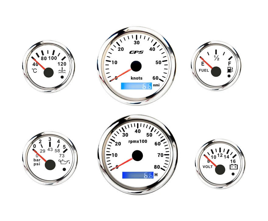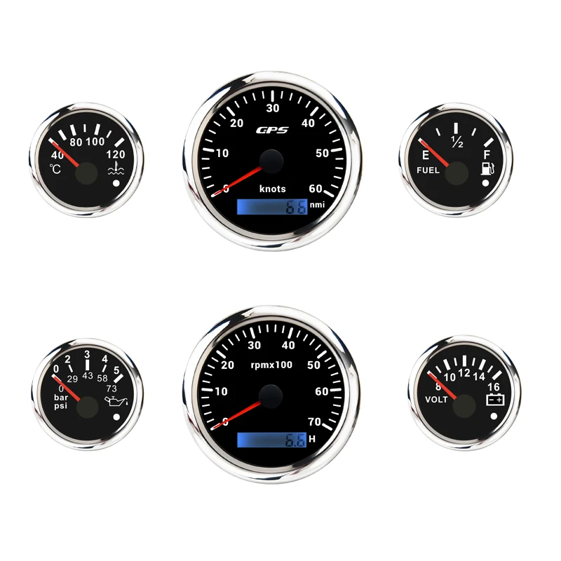 1.316L stainless steel for long-term use even in acid-base. humid environment .2.IP67 waterproof and dustproof grade3.Stepper motors used for full range of stepping gauges. great feature with its less power consumption. longer life. higher precision. etc.4.With curved glass (with anti-fog function)5.With ultra-wide working voltage design( long-term operating voltage: 9-32V. Maximum up to: 36V (≤ 1 minute)).6.Backlight for standard is red(Gauge with multi-color LED light of back-lit illumination (red. yellow. green. blue. purple. white). but various back light could be customized according to customer's requirement.7.Ultra-low power design— The working current of most of the instruments is about 40mA8.Customized color for stainless steel is providedProducts can be used for the engines/generating units. ships. construction machinery. agricultural machinery. automotive modification. etc.