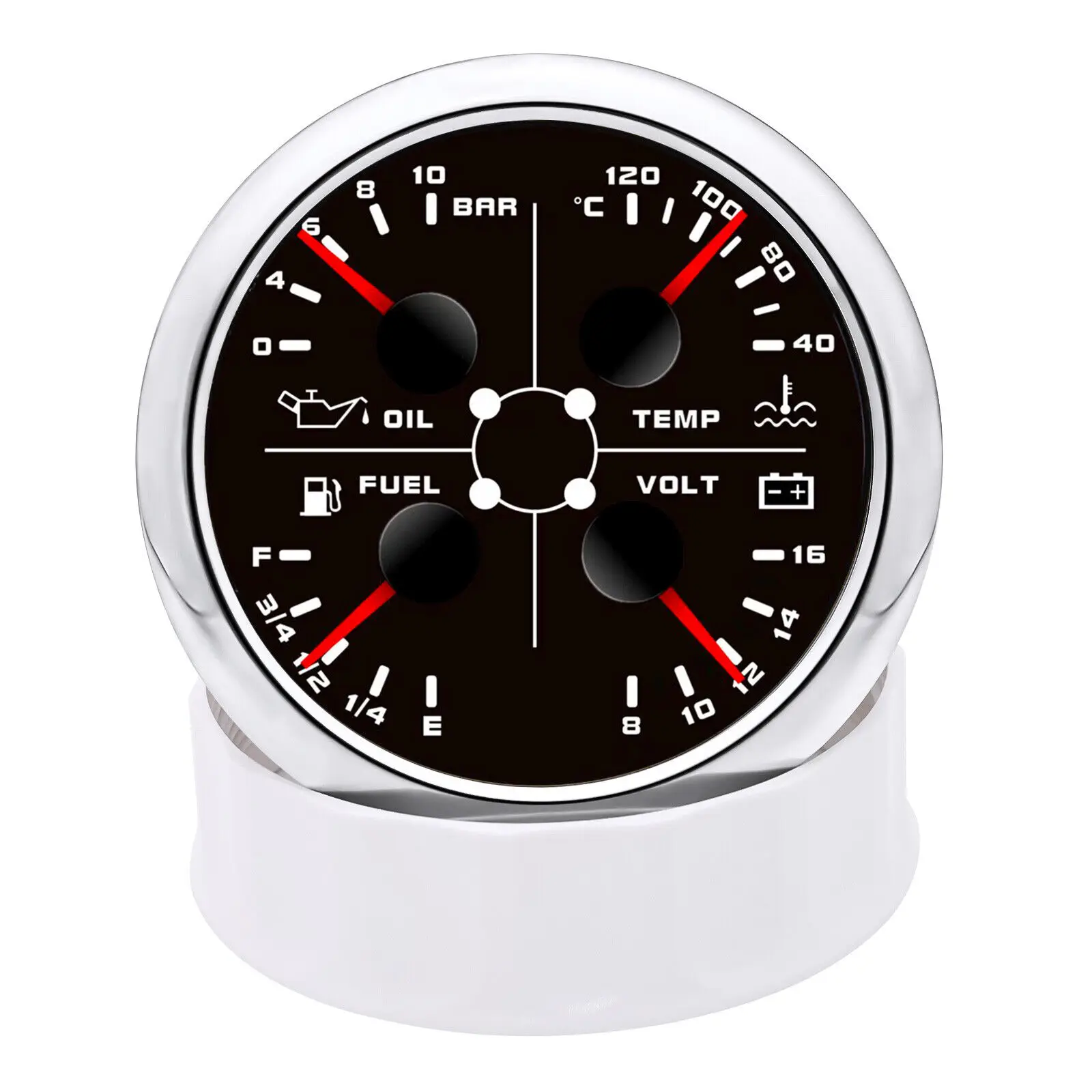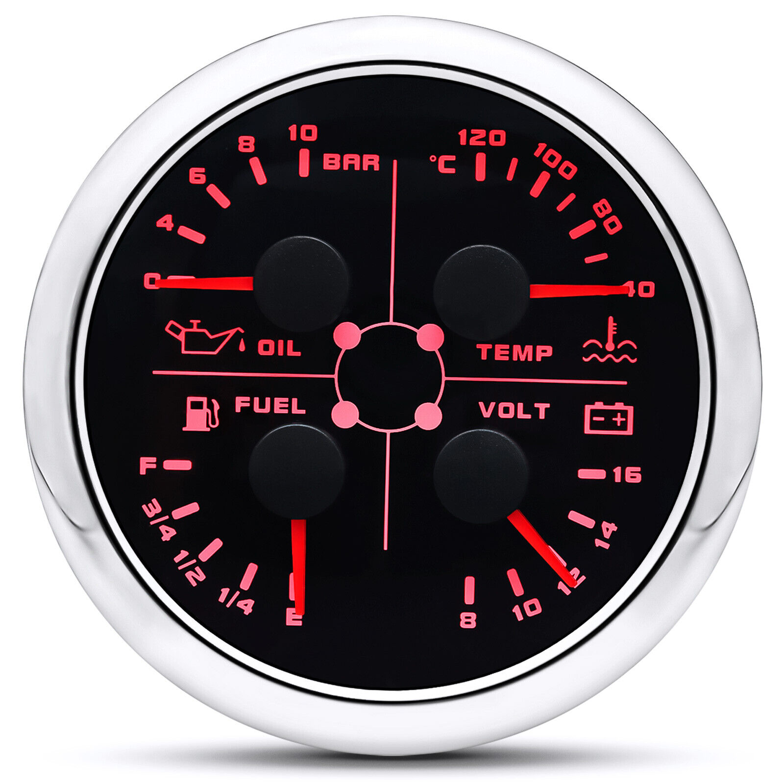 Tachometer Specification:Size:85mmEngine hours:0.0-99999.9HWorking voltage:9-32VDCWaterproof and dustproof grade IP67.Working current:??120mAWorking temperature:-30-70??Storage temperature:-40-85??Backlight:7 Color backlightIndicating Range:0~3000 RPMColor:Black&SilverSignal:PulseSpeedometer SpecificationsDial:Black&SilverMaterial:Stainless Steel 316L Bezel + Anti-fog GlassInstall Diameter:Φ85mm or 3-3/8"Signal:GPSWorking Voltage:9~32V DCWorking Current:≤100mAOperating Temperature:-30?? ~ 75??Storage Temperature:-40?? ~ 85??Size:12x8x12cm / 4.72×3.1×4.75 inchIP67 waterproof and dustproof gradeIndication Range:0-160MPHBacklight:7 Colors Backligt4 IN 1 Gauge Input parameter(The sensor will be not included)Oil pressure sensor: 10~184ohmsTemperature sensor: 301~22ohmsFuel level sensor: 0~190ohml240~30ohms(can be adjusted. default 0-190Ohms)EnvironmentalOperating voltage:9 to 32 Volts(DC)Power Consumption:<120mAOperating Temperature:-20~70degreesStorage Temperature:-30~80degreesEngine oil pressure:0~10 barEngine temperature:40~120 ??Battery voltage:8-16VFuel level:0~ 100%Degree of Protection lp671??Default input signal is 0~190ohm. when 7-Green connect to Ground. input signal change to 240~33ohm;2??Default input signal is 240~33ohm. when 7-Green connect to Ground. input signal change to 0~190ohm.Package Included:1X 85mm tachometer 1X 85mm GPS speedometer 1 x 85mm 4 in 1 Multifunctional Gauge1X GPS Cable1 x Cable1 x Installation Instruction