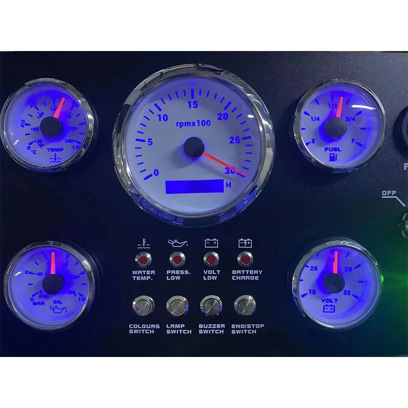 Features: | The gauge can be change: Tachometer with Digital Hour Meter:0-3000/4000/6000/7000/8000RPM Water Temperature gauge:40-120degree Oil Pressure gauge:0-5bar/0-10bar Volt meter:8-16V/16-32V Fuel Level gauge:0-190ohm/240-330hm Marine grade push button Switch (Engine Stop or Pre-heat) Marine grade Ignition key Sealed Key Switch. 4-position With Anti-restart 10A at 12V Four positions: Accessory – Off – Ignition/Accessory – Start. Spring return to Off. Key switch is constructed from engineering thermoplastic and is fully sealed using O-rings and ultrasonic welding to protect switch to ip67 (with connector installed). Plastic face nut and nickel-plated brass backing nut. Supplied with two matching keys. and with protective key boot. 2 tone Alarm Pizzo Siren |