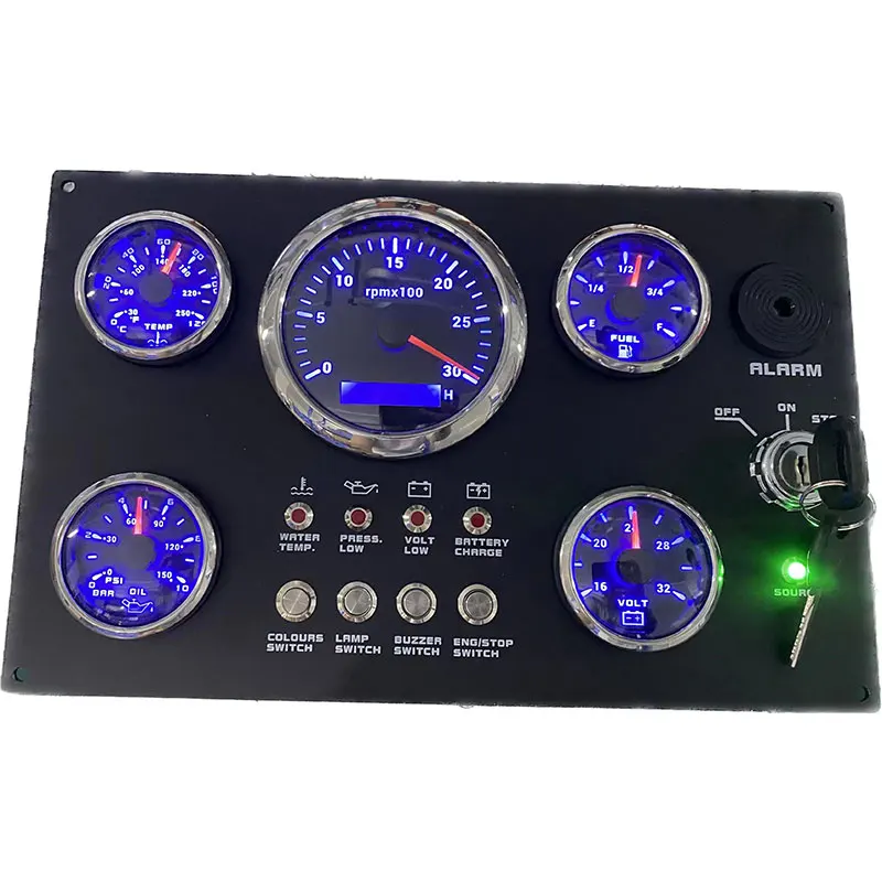 Features: | The gauge can be change: Tachometer with Digital Hour Meter:0-3000/4000/6000/7000/8000RPM Water Temperature gauge:40-120degree Oil Pressure gauge:0-5bar/0-10bar Volt meter:8-16V/16-32V Fuel Level gauge:0-190ohm/240-330hm Marine grade push button Switch (Engine Stop or Pre-heat) Marine grade Ignition key Sealed Key Switch. 4-position With Anti-restart 10A at 12V Four positions: Accessory – Off – Ignition/Accessory – Start. Spring return to Off. Key switch is constructed from engineering thermoplastic and is fully sealed using O-rings and ultrasonic welding to protect switch to ip67 (with connector installed). Plastic face nut and nickel-plated brass backing nut. Supplied with two matching keys. and with protective key boot. 2 tone Alarm Pizzo Siren |