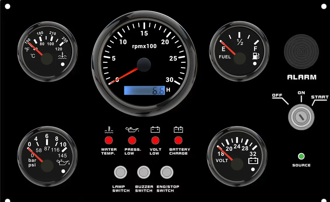 Features: | The gauge can be change: Tachometer with Digital Hour Meter:0-3000/4000/6000/7000/8000RPM Water Temperature gauge:40-120degree Oil Pressure gauge:0-5bar/0-10bar Volt meter:8-16V/16-32V Fuel Level gauge:0-190ohm/240-330hm Marine grade push button Switch (Engine Stop or Pre-heat) Marine grade Ignition key Sealed Key Switch. 4-position With Anti-restart 10A at 12V Four positions: Accessory – Off – Ignition/Accessory – Start. Spring return to Off. Key switch is constructed from engineering thermoplastic and is fully sealed using O-rings and ultrasonic welding to protect switch to ip67 (with connector installed). Plastic face nut and nickel-plated brass backing nut. Supplied with two matching keys. and with protective key boot. 2 tone Alarm Pizzo Siren |
