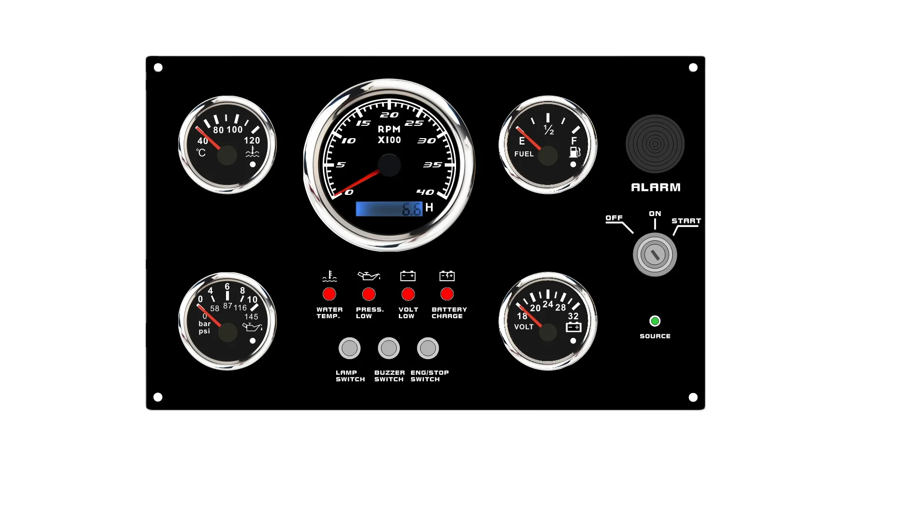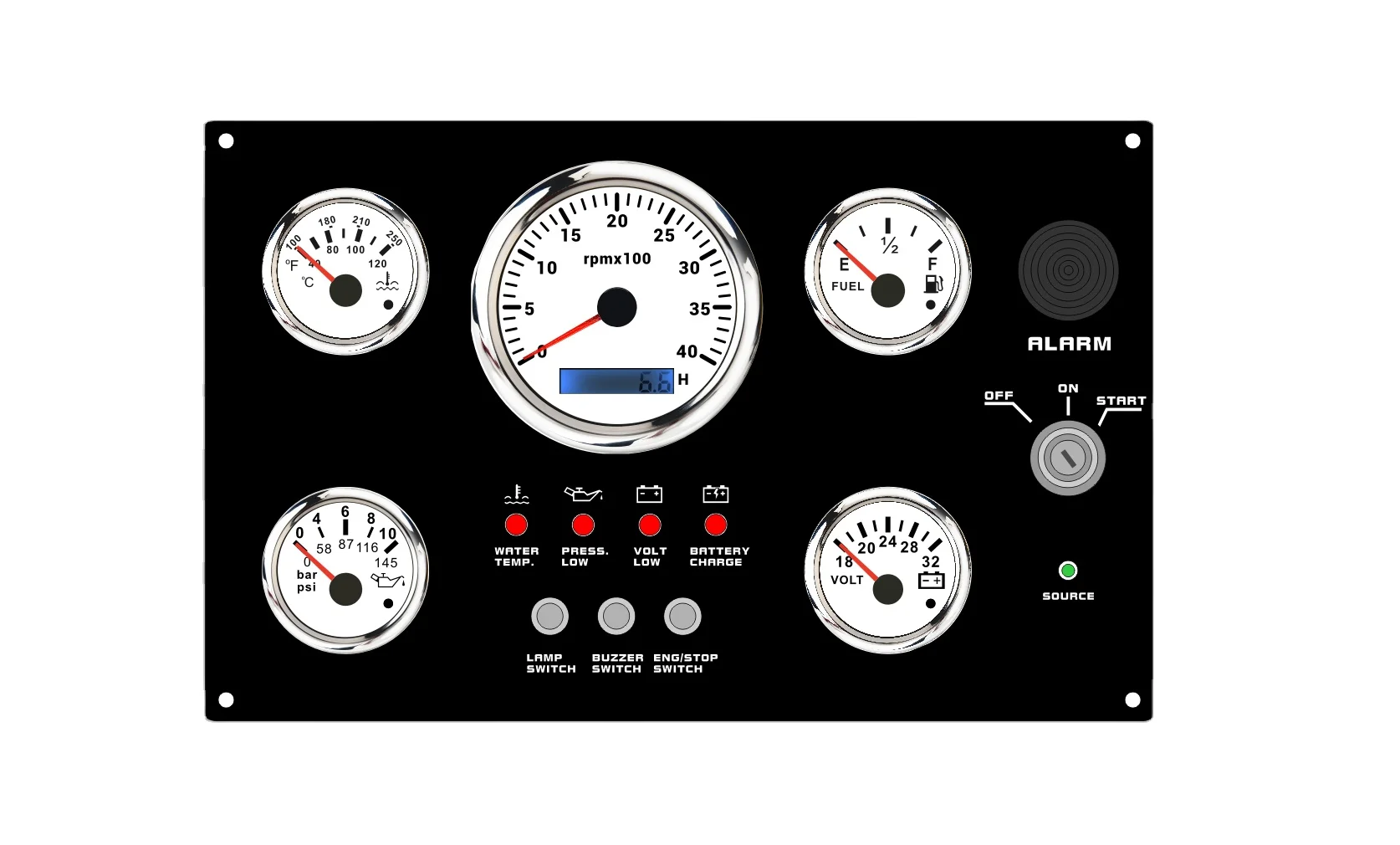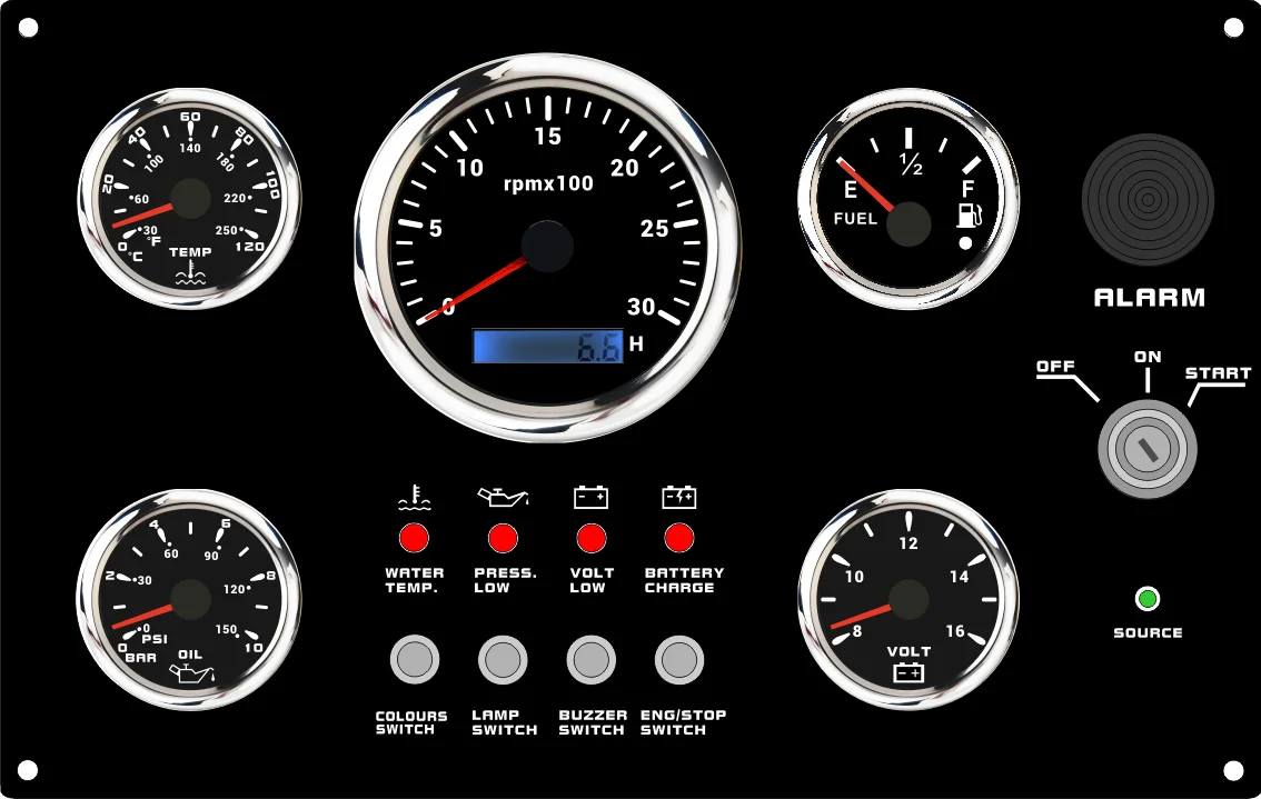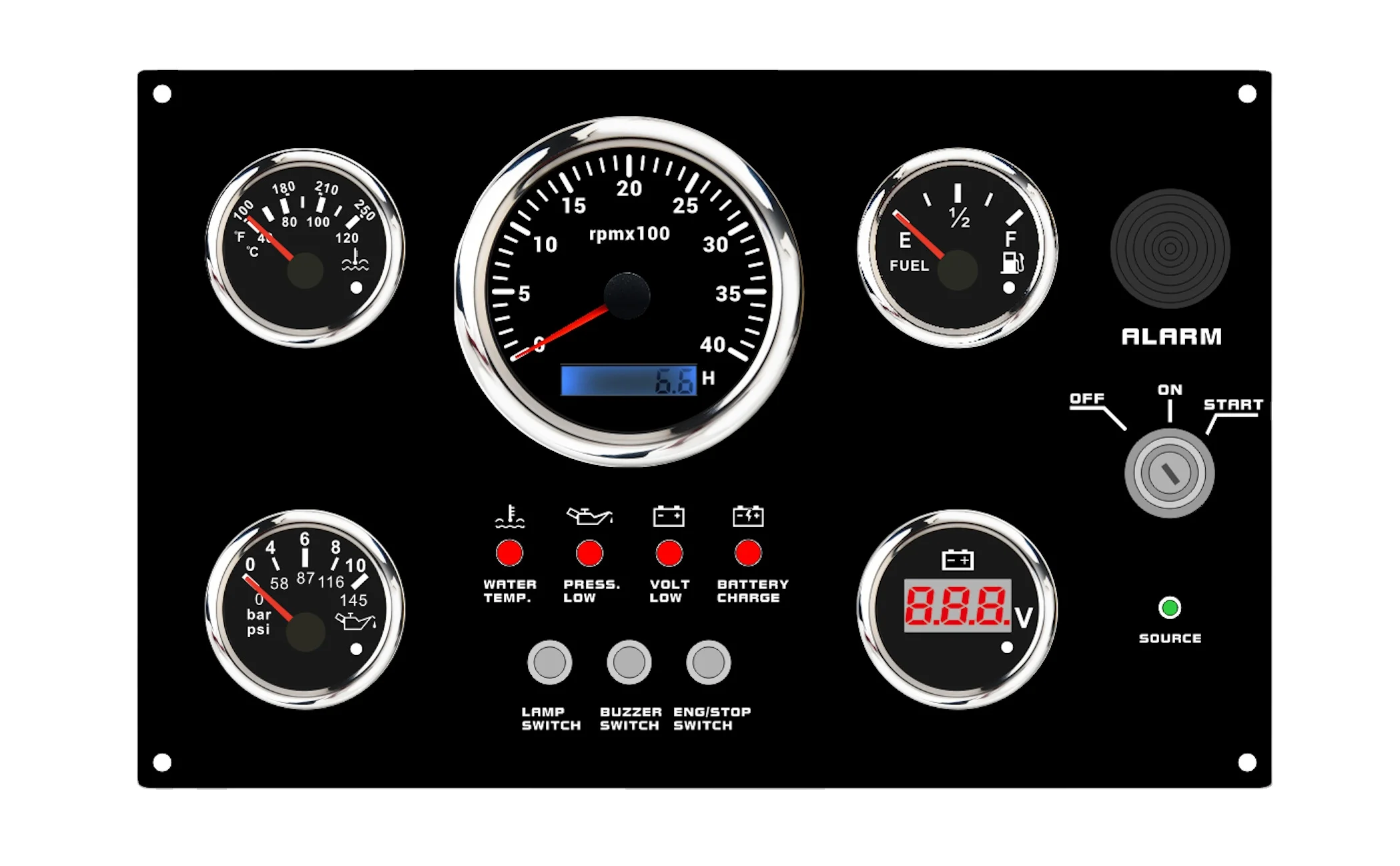 Features: | The gauge can be change: Tachometer with Digital Hour Meter:0-3000/4000/6000/7000/8000RPM Water Temperature gauge:40-120degree Oil Pressure gauge:0-5bar/0-10bar Volt meter:8-16V/16-32V Fuel Level gauge:0-190ohm/240-330hm Marine grade push button Switch (Engine Stop or Pre-heat) Marine grade Ignition key Sealed Key Switch. 4-position With Anti-restart 10A at 12V Four positions: Accessory – Off – Ignition/Accessory – Start. Spring return to Off. Key switch is constructed from engineering thermoplastic and is fully sealed using O-rings and ultrasonic welding to protect switch to ip67 (with connector installed). Plastic face nut and nickel-plated brass backing nut. Supplied with two matching keys. and with protective key boot. 2 tone Alarm Pizzo Siren |