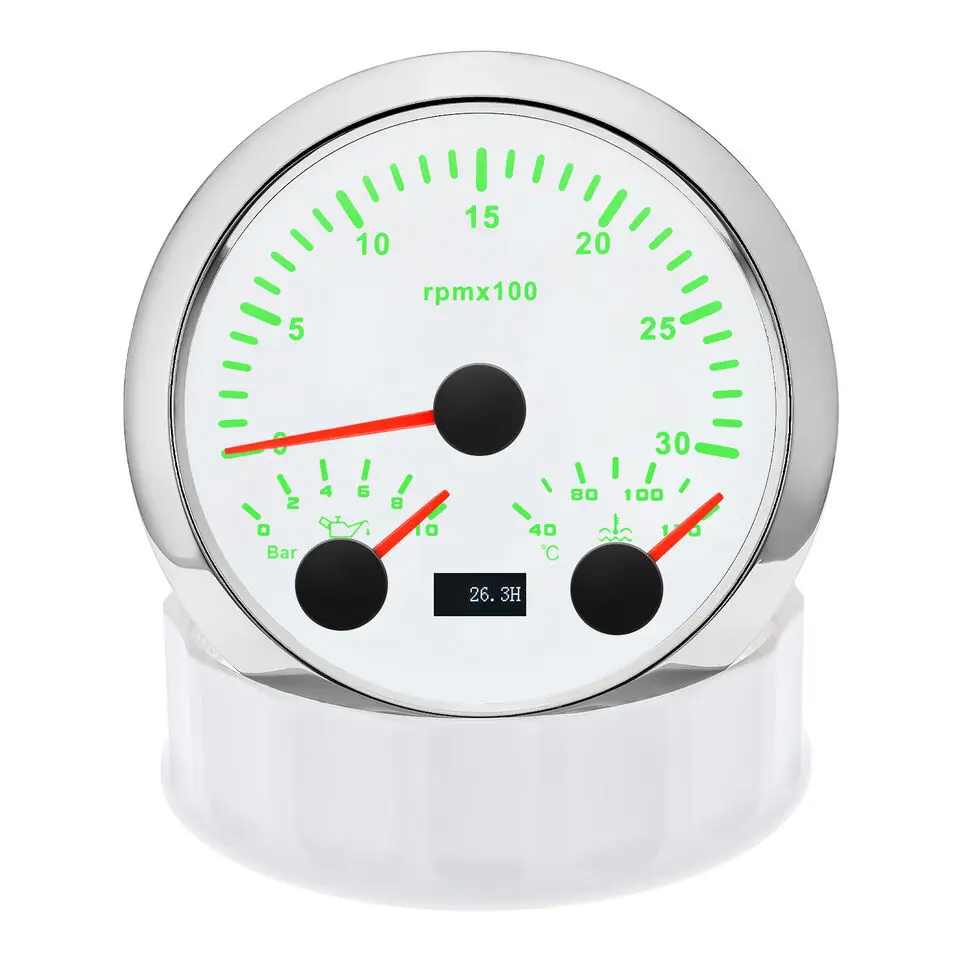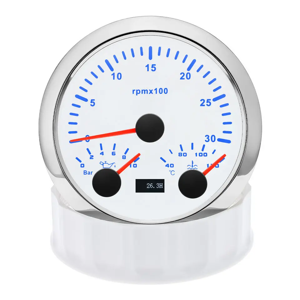 NOTES:The water temperature gauge. Oil pressure gauge does not support desktop testing.It is necessary to connect the SENDING UNITS in order to use it properly.Any helps. please do not hesitate to contact me. Thank you Features:RPM Tachometer Support : Car /Truck/ Boat /Diesel Generator Engine /Gasoline EngineWaterproof:IP 67Excellent anti-fogging function;316 Stainless steel bezel with curved glass;Convenient Installation by multi-plug socket connecting way;With curved glass( with anti-fog function).7 colors baclight for your choose (red (default)→green →blue →white →yellow →cyan →Purple→(automatic)).customers can adjust any color that you likeTachometer fit for Car /Truck/ Boat /Diesel Generator Engine /Gasoline Engine Specification: Size: 85mmTachometer: 0-3000RPMOil pressure: 0~10BarWater temperature: 40-120??Engine hours: 0.0-99999.9HWorking voltage: 9-32VDCWorking current: ??100mAWorking temperature: -30-80??Storage temperature: -40-85??Backlight :7 Color backlightColor: White Input parameter(The sensor will be not included)Oil pressure sensor: 10~184ohmsTemperature sensor: 301~22ohms Connection1 Black: Ground(-)2 Red: 9-32vDC(+)3 Blue:PRM signal4 Yellow: Backlight5 White: Oil pressure signal6 Brown:Temperature signal7 Green:AdjustPackage Included:1 x 85mm 3 in 1 Multifunctional Gauge1 x Cable1 x Installation Instruction