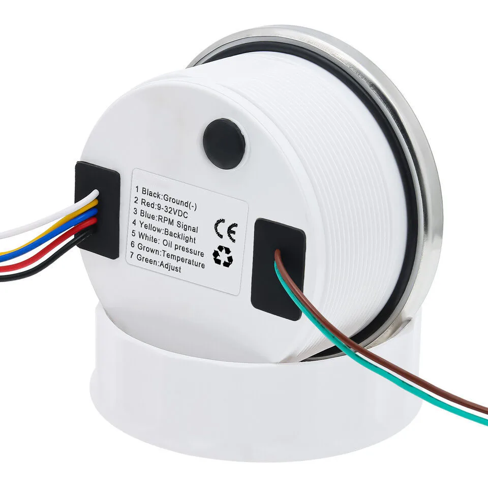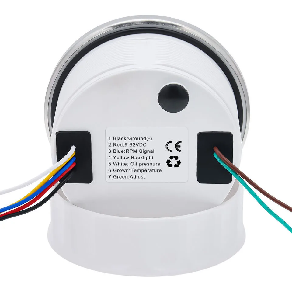 NOTES:The water temperature gauge. Oil pressure gauge does not support desktop testing.It is necessary to connect the SENDING UNITS in order to use it properly.Any helps. please do not hesitate to contact me. Thank you Features:RPM Tachometer Support : Car /Truck/ Boat /Diesel Generator Engine /Gasoline EngineWaterproof:IP 67Excellent anti-fogging function;316 Stainless steel bezel with curved glass;Convenient Installation by multi-plug socket connecting way;With curved glass( with anti-fog function).7 colors baclight for your choose (red (default)→green →blue →white →yellow →cyan →Purple→(automatic)).customers can adjust any color that you likeTachometer fit for Car /Truck/ Boat /Diesel Generator Engine /Gasoline Engine Specification: Size: 85mmTachometer: 0-3000RPMOil pressure: 0~10BarWater temperature: 40-120??Engine hours: 0.0-99999.9HWorking voltage: 9-32VDCWorking current: ??100mAWorking temperature: -30-80??Storage temperature: -40-85??Backlight :7 Color backlightColor: White Input parameter(The sensor will be not included)Oil pressure sensor: 10~184ohmsTemperature sensor: 301~22ohms Connection1 Black: Ground(-)2 Red: 9-32vDC(+)3 Blue:PRM signal4 Yellow: Backlight5 White: Oil pressure signal6 Brown:Temperature signal7 Green:AdjustPackage Included:1 x 85mm 3 in 1 Multifunctional Gauge1 x Cable1 x Installation Instruction