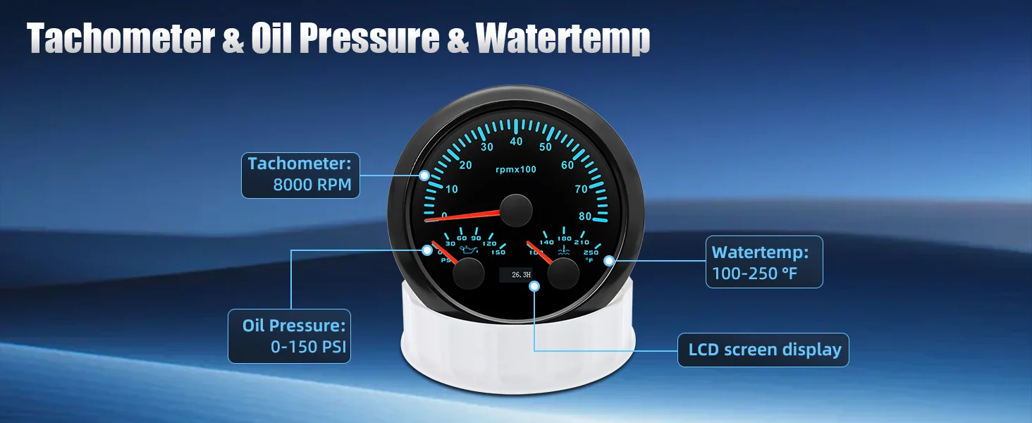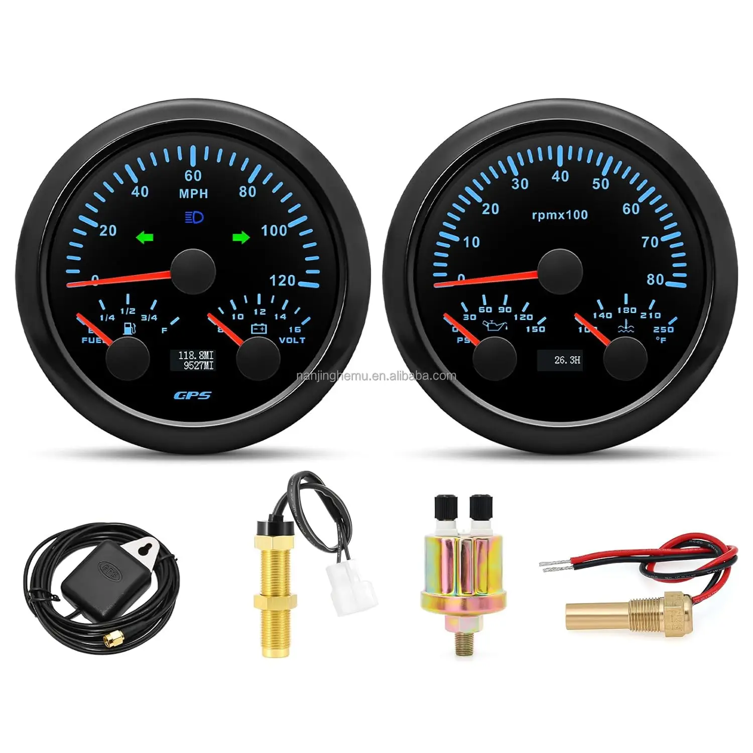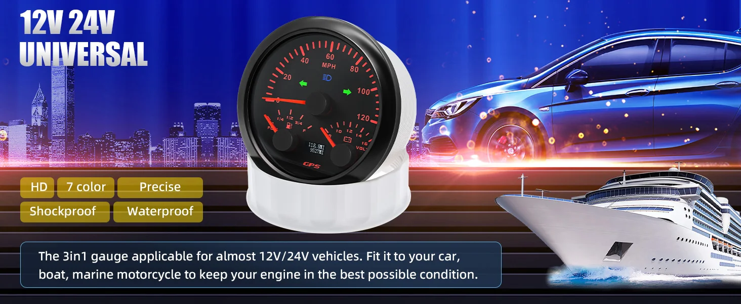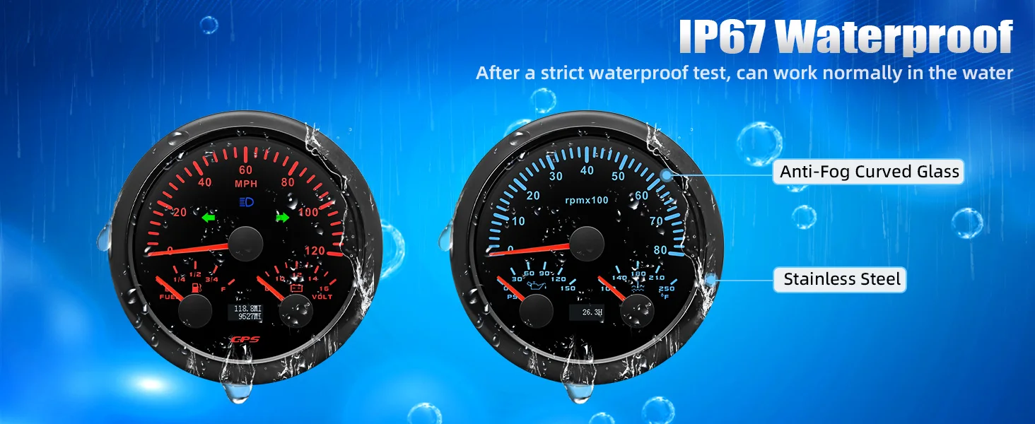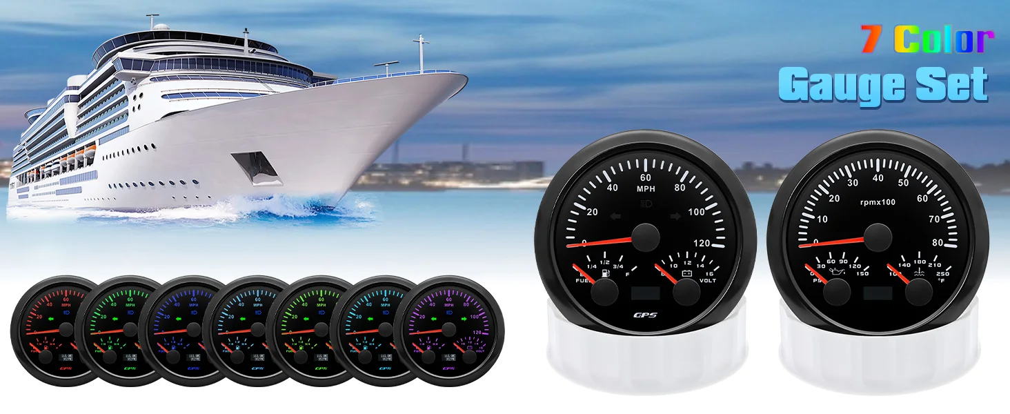 ??Function??2 Gauge Set- 3in1 GPS Speedometer: 0-120MPH. Fuel level: 240-33ohms. 0-190ohms (Can be adjusted). Volt: 8-16 V. 3in1 Tachometer: 0-8000RPM. Oil Pressure: 0-150 PSI. Water Temperature: 100°F-250°F.??Material??These 2 Gauge Set Install diameter: Φ85mm or 3-3/8". These boat gauges are made of Stainless Steel 316L Bezel and Anti-fog Curved Glass. IP67 Waterproof and Dustproof grade. GPS Speedometer with Turn Signal & High Beam Function.??Backlight??Two Mode: Auto Cycle Mode and Fix Mode – 7 Color Cycle or One Fix Color of Seven Colors. 7 Color Backlight Adjustment: Red(default). Green. Blue. White. Yellow. Cyan. Purple (automatic).??Wide Applicability??Suitable for all vehicles Car/ Marine/ Boat/Truck/Motorcycle and off-road vehicles. It gets quicker under a clear view of the sky. The signal comes directly from the satellite signal receiver(GPS Antenna). Tachometer installs to any 4.6.8.10.12 Cylinder Gas Powered Engine for 12V vehicles.??Included??Included 1 x 3in1 GPS Speedometer&Fuel Level&Voltmeter .1 x 3in1 Tachometer&Water Temp Gauge&Oil Pressure Gauge. 1x GPS Antenna.1x Tachometer Sender. 1x 1/8NPT Oil Pressure Sensor. 1x 1/8NPT Water Temp Sensor.1 x Wire Harness. 1x Installation Instruction.