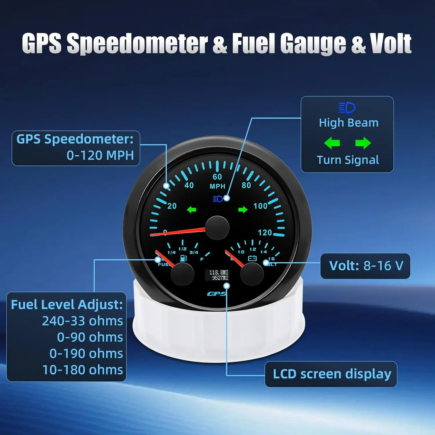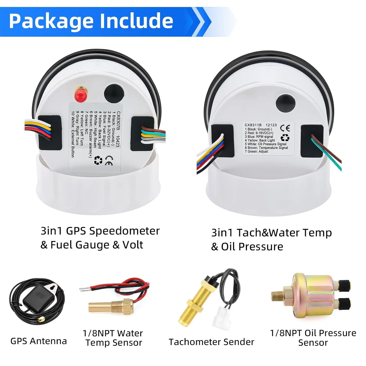 ??Function??2 Gauge Set- 3in1 GPS Speedometer: 0-120MPH. Fuel level: 240-33ohms. 0-190ohms (Can be adjusted). Volt: 8-16 V. 3in1 Tachometer: 0-8000RPM. Oil Pressure: 0-150 PSI. Water Temperature: 100°F-250°F.??Material??These 2 Gauge Set Install diameter: Φ85mm or 3-3/8". These boat gauges are made of Stainless Steel 316L Bezel and Anti-fog Curved Glass. IP67 Waterproof and Dustproof grade. GPS Speedometer with Turn Signal & High Beam Function.??Backlight??Two Mode: Auto Cycle Mode and Fix Mode – 7 Color Cycle or One Fix Color of Seven Colors. 7 Color Backlight Adjustment: Red(default). Green. Blue. White. Yellow. Cyan. Purple (automatic).??Wide Applicability??Suitable for all vehicles Car/ Marine/ Boat/Truck/Motorcycle and off-road vehicles. It gets quicker under a clear view of the sky. The signal comes directly from the satellite signal receiver(GPS Antenna). Tachometer installs to any 4.6.8.10.12 Cylinder Gas Powered Engine for 12V vehicles.??Included??Included 1 x 3in1 GPS Speedometer&Fuel Level&Voltmeter .1 x 3in1 Tachometer&Water Temp Gauge&Oil Pressure Gauge. 1x GPS Antenna.1x Tachometer Sender. 1x 1/8NPT Oil Pressure Sensor. 1x 1/8NPT Water Temp Sensor.1 x Wire Harness. 1x Installation Instruction.