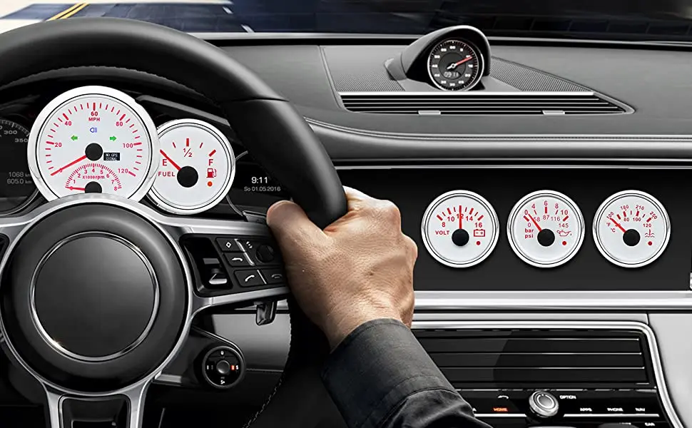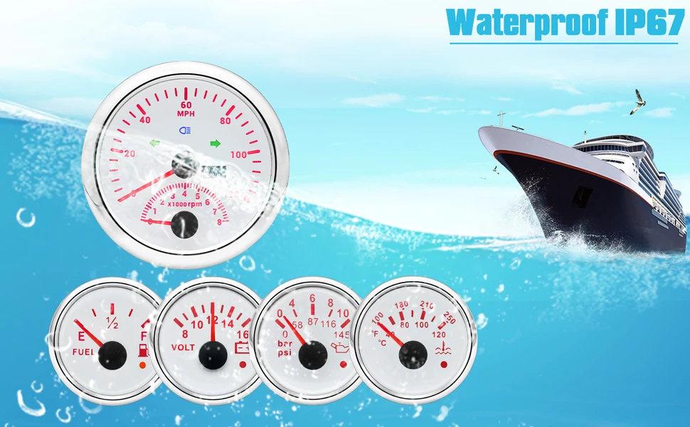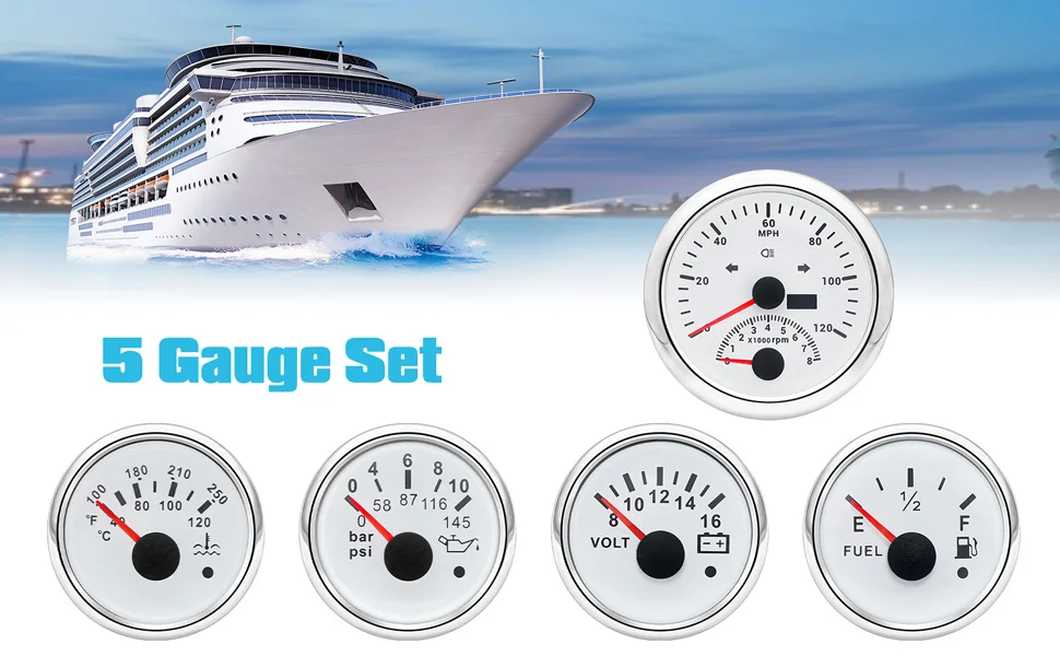 uD83DuDE975 Gauge Kit- Includes GPS Speedometer with tachometer. Fuel Gauge. Water Temperature. Volt and Oil Pressure Gauge.uD83DuDE8C[ GPS Speedometer Gauge Set ]: GPS Speedometer gauge indicating Range: 0 – 120 MPH. Tachometer indicating Range: 0 – 8000 RPM. Volt gauge indicating Range: 8 – 16V. Fuel Level gauge indicating Range: E – F & Resistance 240-33 ohms. Water Temperature gauge indicating Range: 30 – 250°F (0 – 120°C). Oil Pressure gauge indicating Range: 0 – 150 PSI (0 -10 BAR).uD83DuDE99 GPS Speedometer with Tachometer : Standard 85mm (3 3/8") hole in the panel (II) and allow a clearance of 55mm (2 3/16") behind the panel to fit the gauge. The Fuel Gauge. Water Temperature. Volt and Oil Pressure Gauge diameter is 2-1/16 inch (52mm).uD83EuDDED??Material??The boat gauge are made of 316L Metal. Rubber and Plastic. Scratch resistant curved glass lenses. IP67 waterproof and dustproof grade.?????[Attention]: Package Just Includes Gauges & Installation Instructions . Please contact us if you are dissatisfied with our products. the response will be taken in 24 hours and provide proper solutions.