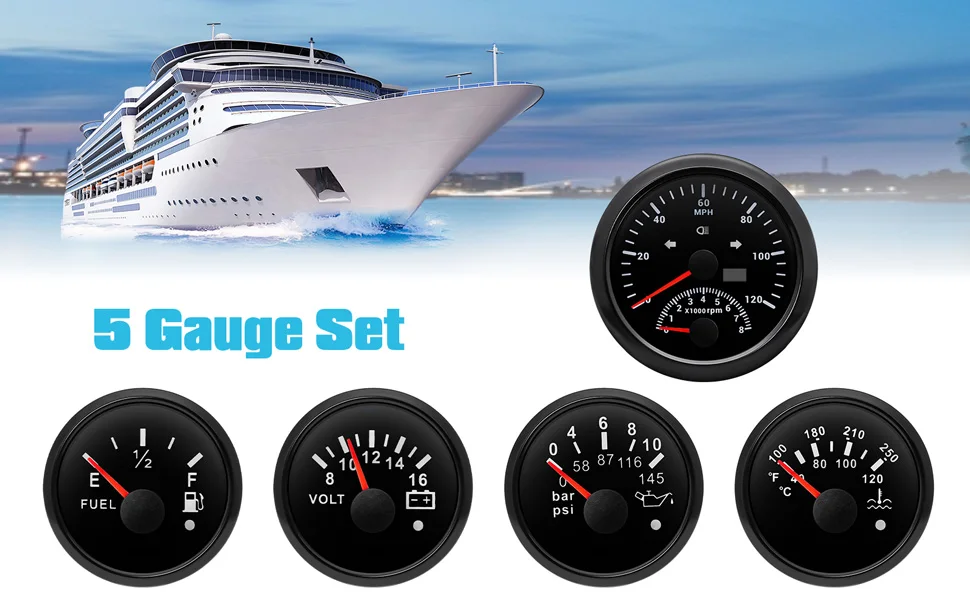 uD83DuDE975 Gauge Kit- Includes GPS Speedometer with tachometer. Fuel Gauge. Water Temperature. Volt and Oil Pressure Gauge.uD83DuDE8C[ GPS Speedometer Gauge Set ]: GPS Speedometer gauge indicating Range: 0 – 120 MPH. Tachometer indicating Range: 0 – 8000 RPM. Volt gauge indicating Range: 8 – 16V. Fuel Level gauge indicating Range: E – F & Resistance 240-33 ohms. Water Temperature gauge indicating Range: 30 – 250°F (0 – 120°C). Oil Pressure gauge indicating Range: 0 – 150 PSI (0 -10 BAR).uD83DuDE99 GPS Speedometer with Tachometer : Standard 85mm (3 3/8") hole in the panel (II) and allow a clearance of 55mm (2 3/16") behind the panel to fit the gauge. The Fuel Gauge. Water Temperature. Volt and Oil Pressure Gauge diameter is 2-1/16 inch (52mm).uD83EuDDED??Material??The boat gauge are made of 316L Metal. Rubber and Plastic. Scratch resistant curved glass lenses. IP67 waterproof and dustproof grade.?????[Attention]: Package Just Includes Gauges & Installation Instructions . Please contact us if you are dissatisfied with our products. the response will be taken in 24 hours and provide proper solutions.