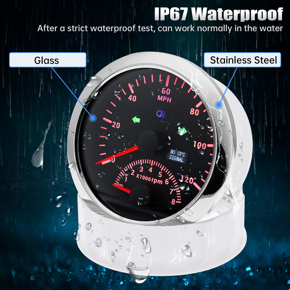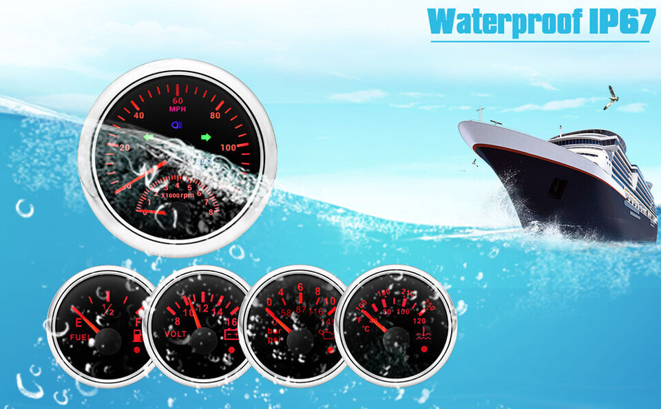 uD83DuDE975 Gauge Kit- Includes GPS Speedometer with tachometer. Fuel Gauge. Water Temperature. Volt and Oil Pressure Gauge.uD83DuDE8C[ GPS Speedometer Gauge Set ]: GPS Speedometer gauge indicating Range: 0 – 120 MPH. Tachometer indicating Range: 0 – 8000 RPM. Volt gauge indicating Range: 8 – 16V. Fuel Level gauge indicating Range: E – F & Resistance 240-33 ohms. Water Temperature gauge indicating Range: 30 – 250°F (0 – 120°C). Oil Pressure gauge indicating Range: 0 – 150 PSI (0 -10 BAR).uD83DuDE99 GPS Speedometer with Tachometer : Standard 85mm (3 3/8") hole in the panel (II) and allow a clearance of 55mm (2 3/16") behind the panel to fit the gauge. The Fuel Gauge. Water Temperature. Volt and Oil Pressure Gauge diameter is 2-1/16 inch (52mm).uD83EuDDED??Material??The boat gauge are made of 316L Metal. Rubber and Plastic. Scratch resistant curved glass lenses. IP67 waterproof and dustproof grade.?????[Attention]: Package Just Includes Gauges & Installation Instructions . Please contact us if you are dissatisfied with our products. the response will be taken in 24 hours and provide proper solutions.