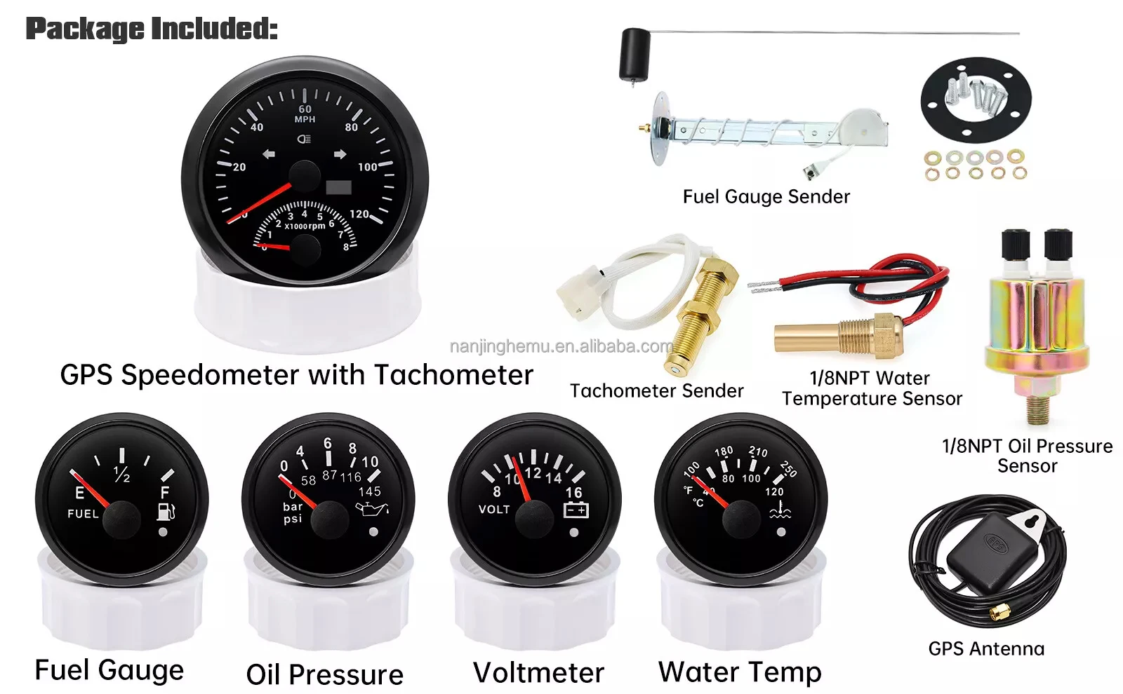 Features:100% brand new with curved glass (with anti-fog function).Dust and waterproof rating: IP67.Small and light. easy to install. work great for checking Voltage.It can display Voltage inside the car simultaneously.Real-time monitoring of voltage changes to protect the safety of the instrument.The screen is made of LED material to ensure it is easy and convenient for you to read even in dim light.Widely used in yachts. motor boats. speedboats. fishing boats. luxury ships. and other related ships; Rv. engineering machinery vehicles. modified vehicles. battery cars. electric vehicles. rv. excavators.Specification1). GPS Speedometer with Tachometer GaugeFixing dimension:85mm(3-3/8")Indicating Range:0-120MPH and 0-8000rpmWorking Voltage:12V/24VTotal Mileage Adjustable. Mileage Range: 0-99999.9 milesGPS Blind Area Odometer CompensationOverSpeed Buzzer Alarm (Value Adjustable)Indication light: LEFT. HIGH BEAM. RIGHTBacklight: RedWorking temperatures: – 40 to 85°COperation mode: LCD display. stepper motor2).Fuel Level GaugeName: Fuel Level MeterMaterial:316 stainless steelWorking voltage: 9-32V(12V/24V)Waterproof level: IP67Application range: 240~33ohm/0-190ohmsMounting hole:52mmColor: BlackWarning Alarm: When fuel level low than 13%. the warning light will flash.3). Water Temperature GaugeDiameter:52mm/2.05inchMeasuring range: 40-120?? & 100-250?HItem Color: BlackWorking voltage:9~32V DCInput signal:301~22ohmsBacklight: RedWorking current:≤60mAWarning Alarm: When coolant Temp more than 95%. the warning light will flash.4). Oil Pressure GaugeDial:BlackMaterial: 316 Stainless Steel. PCSize: 8x8x7cm / 3.1×3.1×2.75 inchWorking Temperature: -40~85??Protection Level: IP67Working Voltage: DC 8~16V. DC 18~32VOutput Signal: 10~184 ohmsWorking Current:<100mADisplay Accuracy:<3°Indicating Range: 0~10bar/0~145psiWarning Alarm: When Pressure low than 0.8Bar. the warning light will flash.5). VoltageDiameter: 52mm/2.05inchMeasuring range: 8V-16VColor:BlackBacklight: RedWarning Alarm: When Volt low than 11.5%. the warning light will flash.Package Included:1x GPS Speedometer with Tachometer1x GPS Antenna1x Fuel Level gauge1x Water temp gauge1x Oil pressure gauge1x Fuel Sending Units 240-33ohms1x Tachometer Sender M16*1.51x Water temp sensor 1/8NPT1x Oil pressure sender 1/8NPT1x Voltage