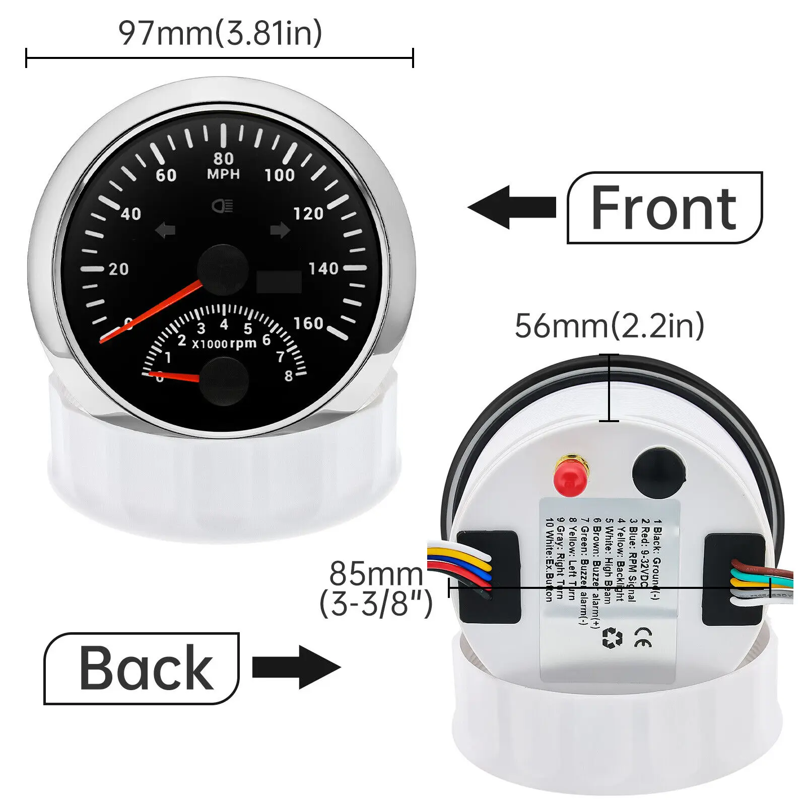 Fixing dimension:85mm(3-3/8")Indicating Range:0-160MPH and 0-8000rpmWorking Voltage:12V/24VTotal Mileage Adjustable. Mileage Range: 0-99999.9 milesGPS Blind Area Odometer CompensationOverSpeed Buzzer Alarm (Value Adjustable)Indication light: LEFT. HIGH BEAM. RIGHTBacklight: RedWorking temperatures: – 40 to 85°COperation mode: LCD display. stepper motor 2).Fuel Level GaugeName:Fuel Level MeterMaterial:316 stainless steelWorking voltage:9-32V(12V/24V)Waterproof level:IP67Application range:240~33ohm/0-190ohmsMounting hole:52mmColor:Black&Silver3). Water Temperature GaugeDiameter:52mm/2.05inchMeasuring range:40-120??Item Color:Black&Silver Working voltage:9~32V DCInput signal:301~22ohmsBacklight:RedWorking current:≤60mA4). Oil Pressure GaugeDial:Black&Silver Material:316 Stainless Steel. PCSize: 8x8x7cm / 3.1×3.1×2.75 inchWorking Temperature: -40~85??Protection Level:IP67Working Voltage:DC 8~16V. DC 18~32VOutput Signal:10~184 ohmsWorking Current:<100mADisplay Accuracy:<3°Indicating Range:0~10bar/0~145psi52mm (2") mounting holeOil Pressure Gauge:0~10bar (0~145psi)5). VoltageDiameter: 52mm/2.05inchMeasuring range: 8V-16VColor:Black&Silver Backlight: RedPackage Included:1x GPS Speedometer with Tachometer1x Fuel Level gauge1x Water temp gauge1x Oil pressure gauge1x Voltage