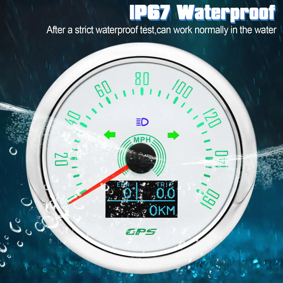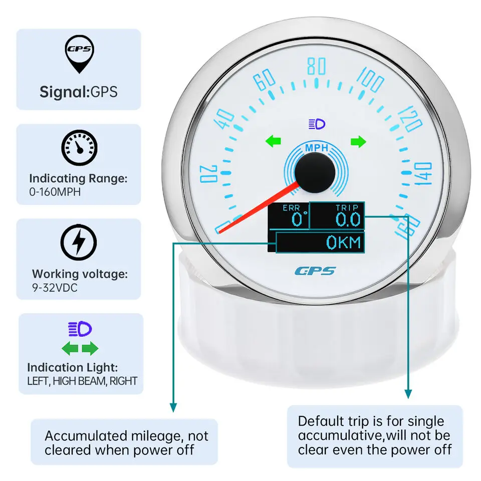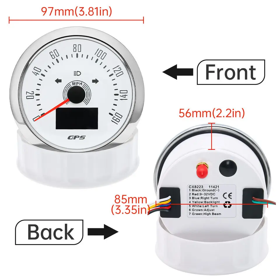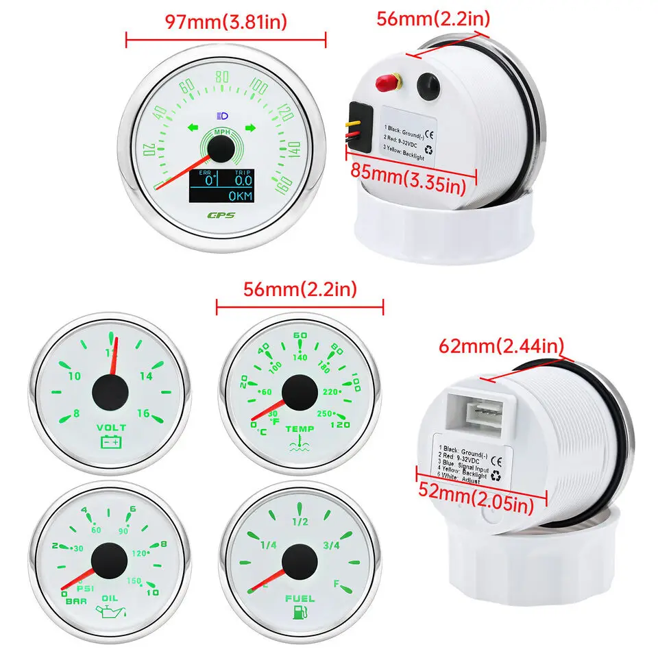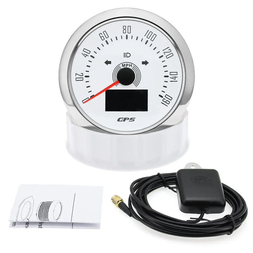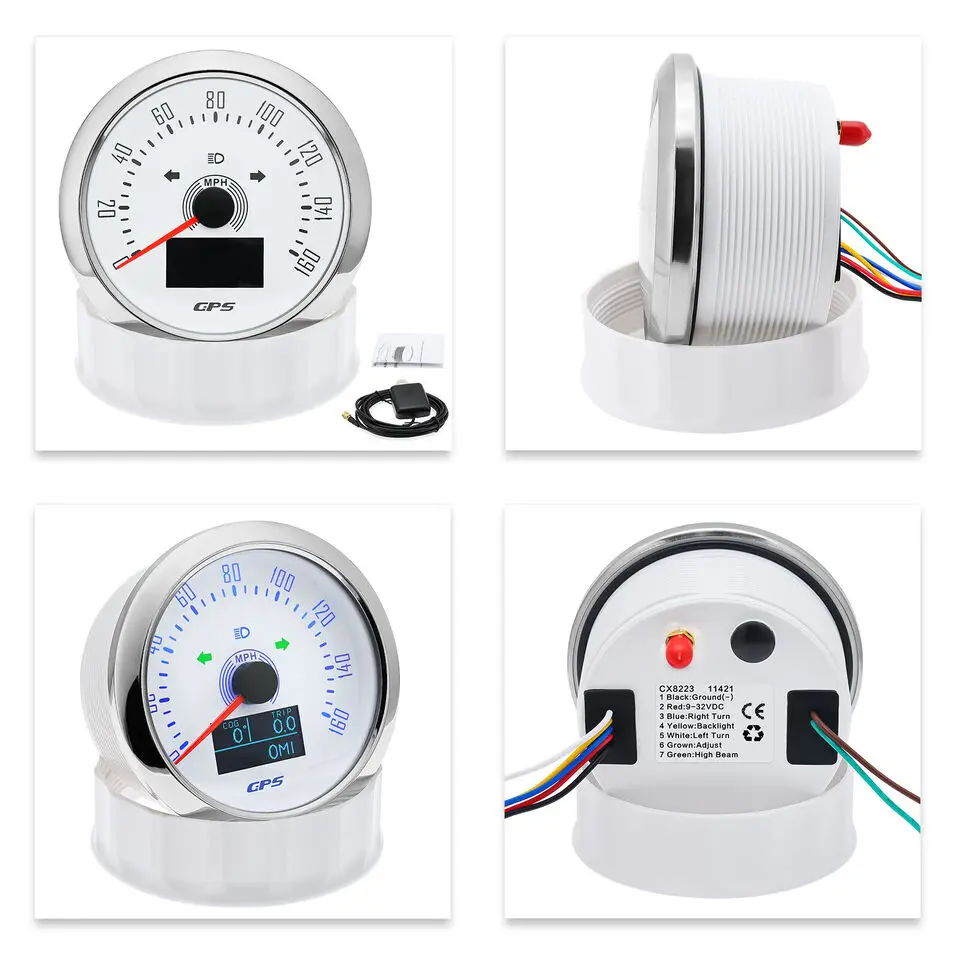 Feature:High-brightness LED backlight.316 stainless steel for long-term use even in acid-base. humid environment.IP67 waterproof and dust-proof grade.With curved glass( with anti-fog function).Suitable for all kinds of vehicle modification.Using stepper motor drive pointer. accurate display of the engine speed. and with the LCD display clear display mileage.Gauges have many kinds backlight color (red.yellow.orange.green.blue.purple.white).customers can adjust any color that you likeFeatures:GPS Speedometer: 160mphTotal mileage: (can't be adjusted )TRIP: Short mileage(can be adjusted )1. Save when power off2. Long press the button to resetCOG: Course Over GroundBacklight: 7 colors backlightOLED LCD screen: working temperature -40??~+80?? Volt Gauge:Sizes: 52 mm (2-1/16")Measuring Range: 8 – 16 (V)Backlight: 7 Colors Fuel Level Gauge:Sizes: 52 mm (2-1/16")Measuring Range: Empty – FullResistance: 240 (E) – 33 (F) ohmsBacklight: 7 Colors Water Temperature Gauge:Install diameter: Φ52mmIndication range: 0~120??/30-250?HInput signal: 287.4~22.4 ohmsStorage temperature: -40~+85?? Backlight: 7 Colors Oil Pressure Gauge:Install diameter:Φ52mm or 2-1/16"Indication range:0~10bar / 0-150 PSIOperating temperature:-30~+75?? Storage temperature:-40~+85?? Backlight: 7 Colors Package Include:1X 85MM Digital GPS Speedometer Gauge1X GPS Antenna1x Fuel level gauge1X Voltmeter1X Water temp gauge1X Oil pressure gauge Installation Instruction