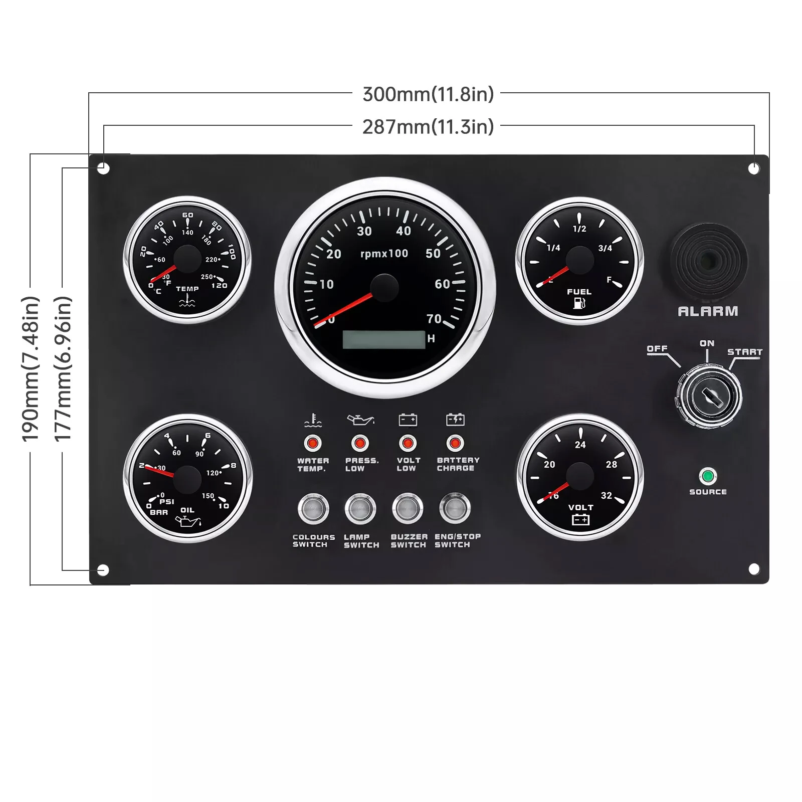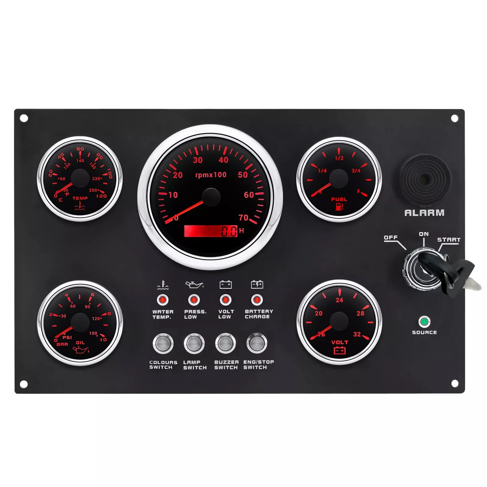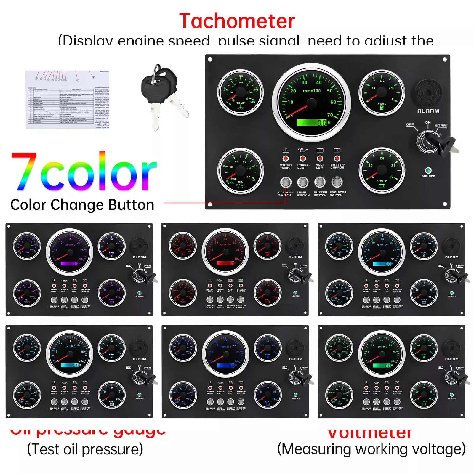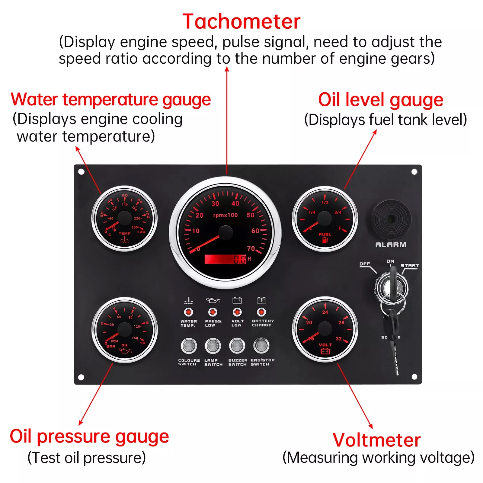 Features: | The gauge can be change: Tachometer with Digital Hour Meter:0-3000/4000/6000/7000/8000RPM Water Temperature gauge:40-120degree Oil Pressure gauge:0-5bar/0-10bar Volt meter:8-16V/16-32V Fuel Level gauge:0-190ohm/240-330hm Marine grade push button Switch (Engine Stop or Pre-heat) Marine grade Ignition key Sealed Key Switch. 4-position With Anti-restart 10A at 12V Four positions: Accessory – Off – Ignition/Accessory – Start. Spring return to Off. Key switch is constructed from engineering thermoplastic and is fully sealed using O-rings and ultrasonic welding to protect switch to ip67 (with connector installed). Plastic face nut and nickel-plated brass backing nut. Supplied with two matching keys. and with protective key boot. 2 tone Alarm Pizzo Siren |