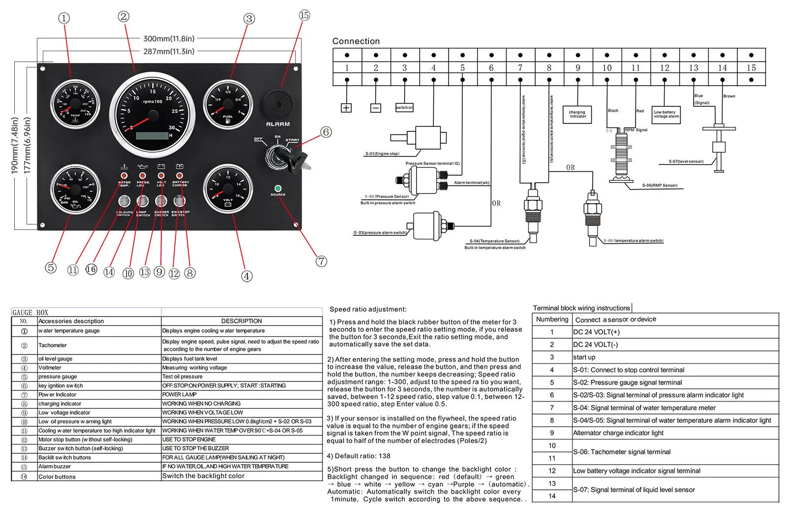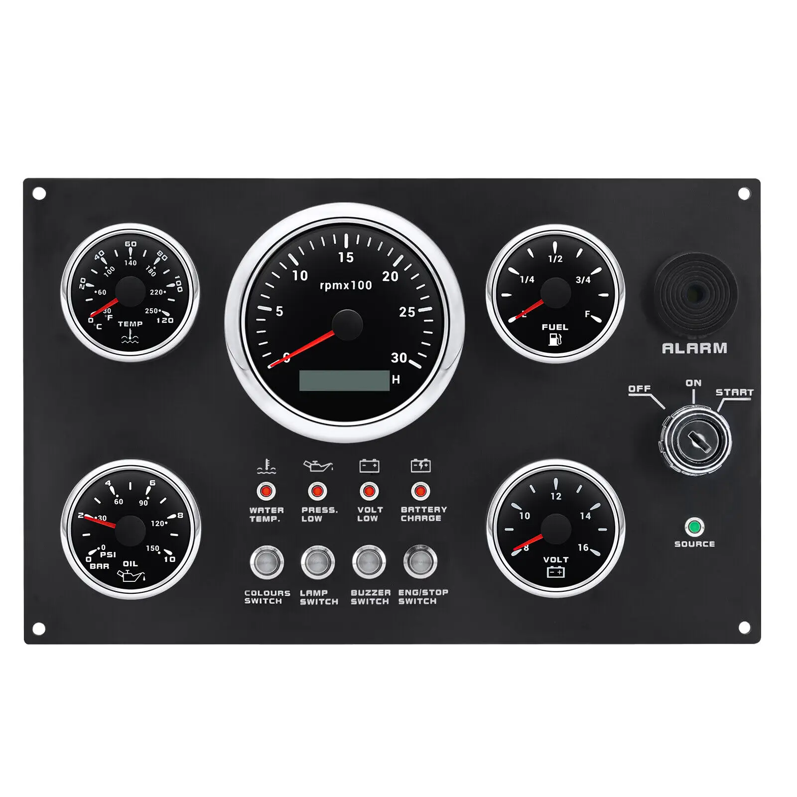 Features: | The gauge can be change: Tachometer with Digital Hour Meter:0-3000/4000/6000/7000/8000RPM Water Temperature gauge:40-120degree Oil Pressure gauge:0-5bar/0-10bar Volt meter:8-16V/16-32V Fuel Level gauge:0-190ohm/240-330hm Marine grade push button Switch (Engine Stop or Pre-heat) Marine grade Ignition key Sealed Key Switch. 4-position With Anti-restart 10A at 12V Four positions: Accessory – Off – Ignition/Accessory – Start. Spring return to Off. Key switch is constructed from engineering thermoplastic and is fully sealed using O-rings and ultrasonic welding to protect switch to ip67 (with connector installed). Plastic face nut and nickel-plated brass backing nut. Supplied with two matching keys. and with protective key boot. 2 tone Alarm Pizzo Siren |