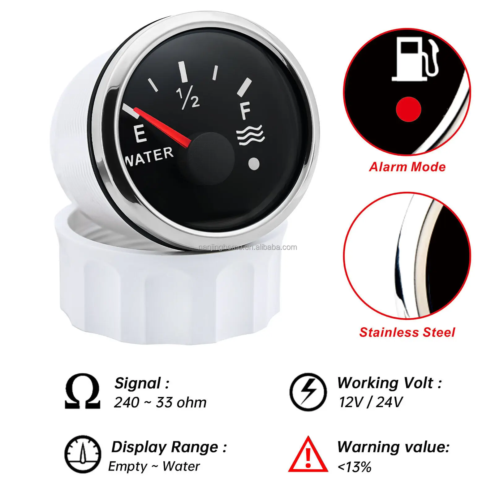 Fuel gaugeThis is a high quality fuel level gauge.for most fuel level sensors Description:Fit For: Car Truck Motorcycle ATV UTV Marine BoatFace Color: WhiteBezel Materials: Stainless SteelIndicating Range: 240-33ohms (240–empty 33–full) 0-190ohm (0–empty 190–full)Operating Voltage: 9-30VDCOperating Current: ≤60mAOperating Temperature: -30~+75 ??Storage Temperature: -40~+85 ??Install Diameter: 52mm(2-1/16'')Grade Of Protection: IP67Package Method: Neutral boxWhen the fuel level is lower than 13%. the warning light will flash Features: