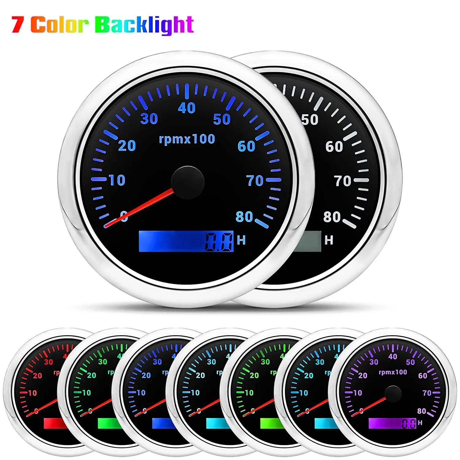 uD83DuDE976 Gauge Kit- Includes GPS Speedometer. Tachometer. Fuel Gauge. Water Temperature. Volt and Oil Pressure Gauge. 7 color backlight : red??green??blue??yellow??olivine??orange??purple.uD83DuDE8C[ GPS Speedometer Gauge Set ]: GPS Speedometer gauge indicating Range: 0 – 80 MPH. Tachometer indicating Range: 0 – 8000 RPM. Volt gauge indicating Range: 8 – 16V. Fuel Level gauge indicating Range: E – F & Resistance 240-33 ohms. Water Temperature gauge indicating Range: 30 – 250°F (0 – 120°C). Oil Pressure gauge indicating Range: 0 – 150 PSI (0 -10 BAR).uD83DuDE99 GPS Speedometer and Tachometer: Standard 85mm (3 3/8") hole in the panel (II) and allow a clearance of 55mm (2 3/16") behind the panel to fit the gauge. The Fuel Gauge. Water Temperature. Volt and Oil Pressure Gauge diameter is 2-1/16 inch (52mm).uD83EuDDED??Material??The boat gauge are made of 316L Metal. Rubber and Plastic. Scratch resistant curved glass lenses. IP67 waterproof and dustproof grade.?????[Attention]: Package just gauges & Installation Instructions . Please contact us if you are dissatisfied with our products. the response will be taken in 24 hours and provide proper solutions.