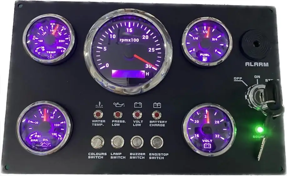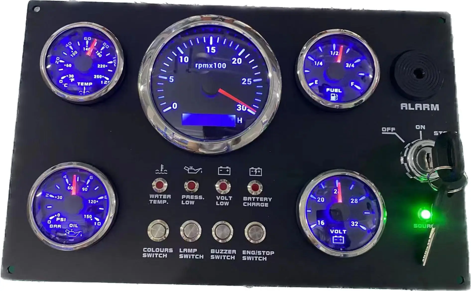 Features: | The gauge can be change: Tachometer with Digital Hour Meter:0-3000/4000/6000/7000/8000RPM Water Temperature gauge:40-120degree Oil Pressure gauge:0-5bar/0-10bar Volt meter:8-16V/16-32V Fuel Level gauge:0-190ohm/240-330hm Marine grade push button Switch (Engine Stop or Pre-heat) Marine grade Ignition key Sealed Key Switch. 4-position With Anti-restart 10A at 12V Four positions: Accessory – Off – Ignition/Accessory – Start. Spring return to Off. Key switch is constructed from engineering thermoplastic and is fully sealed using O-rings and ultrasonic welding to protect switch to ip67 (with connector installed). Plastic face nut and nickel-plated brass backing nut. Supplied with two matching keys. and with protective key boot. 2 tone Alarm Pizzo Siren |
