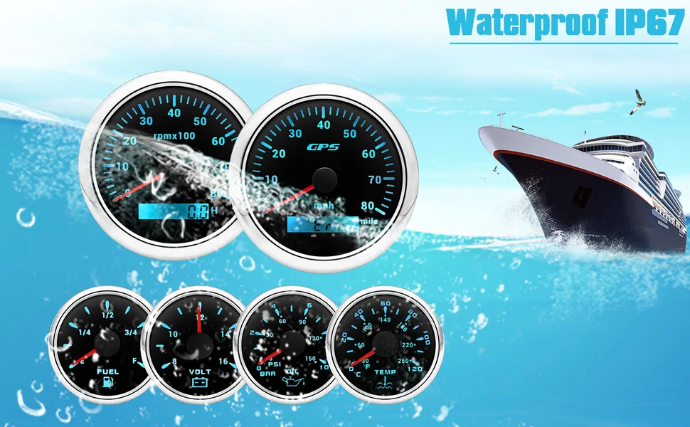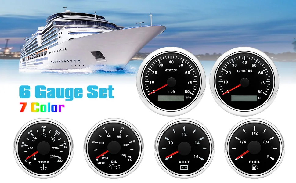 uD83DuDE976 Gauge Kit- Includes GPS Speedometer. Tachometer. Fuel Gauge. Water Temperature. Volt and Oil Pressure Gauge. 7 color backlight : red??green??blue??yellow??olivine??orange??purple.uD83DuDE8C[ GPS Speedometer Gauge Set ]: GPS Speedometer gauge indicating Range: 0 – 80 MPH. Tachometer indicating Range: 0 – 8000 RPM. Volt gauge indicating Range: 8 – 16V. Fuel Level gauge indicating Range: E – F & Resistance 240-33 ohms. Water Temperature gauge indicating Range: 30 – 250°F (0 – 120°C). Oil Pressure gauge indicating Range: 0 – 150 PSI (0 -10 BAR).uD83DuDE99 GPS Speedometer and Tachometer: Standard 85mm (3 3/8") hole in the panel (II) and allow a clearance of 55mm (2 3/16") behind the panel to fit the gauge. The Fuel Gauge. Water Temperature. Volt and Oil Pressure Gauge diameter is 2-1/16 inch (52mm).uD83EuDDED??Material??The boat gauge are made of 316L Metal. Rubber and Plastic. Scratch resistant curved glass lenses. IP67 waterproof and dustproof grade.?????[Attention]: Package just gauges & Installation Instructions . Please contact us if you are dissatisfied with our products. the response will be taken in 24 hours and provide proper solutions.