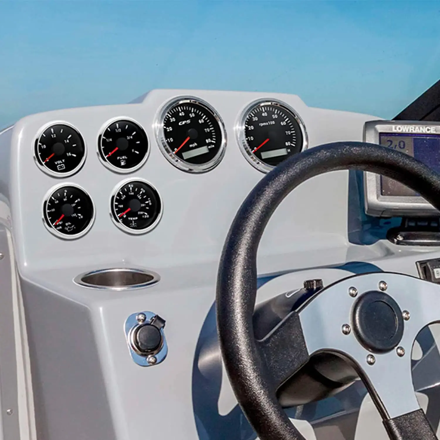 uD83DuDE976 Gauge Kit- Includes GPS Speedometer. Tachometer. Fuel Gauge. Water Temperature. Volt and Oil Pressure Gauge. 7 color backlight : red??green??blue??yellow??olivine??orange??purple.uD83DuDE8C[ GPS Speedometer Gauge Set ]: GPS Speedometer gauge indicating Range: 0 – 80 MPH. Tachometer indicating Range: 0 – 8000 RPM. Volt gauge indicating Range: 8 – 16V. Fuel Level gauge indicating Range: E – F & Resistance 240-33 ohms. Water Temperature gauge indicating Range: 30 – 250°F (0 – 120°C). Oil Pressure gauge indicating Range: 0 – 150 PSI (0 -10 BAR).uD83DuDE99 GPS Speedometer and Tachometer: Standard 85mm (3 3/8") hole in the panel (II) and allow a clearance of 55mm (2 3/16") behind the panel to fit the gauge. The Fuel Gauge. Water Temperature. Volt and Oil Pressure Gauge diameter is 2-1/16 inch (52mm).uD83EuDDED??Material??The boat gauge are made of 316L Metal. Rubber and Plastic. Scratch resistant curved glass lenses. IP67 waterproof and dustproof grade.?????[Attention]: Package just gauges & Installation Instructions . Please contact us if you are dissatisfied with our products. the response will be taken in 24 hours and provide proper solutions.