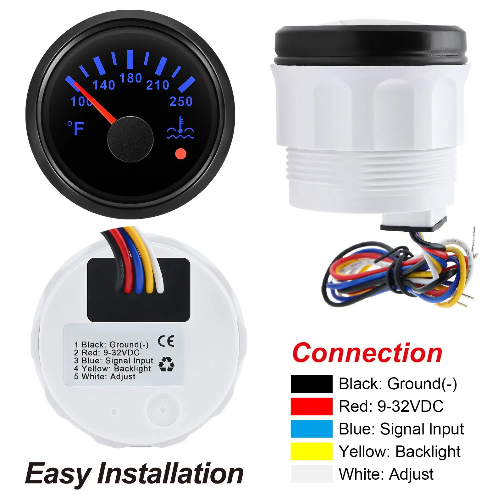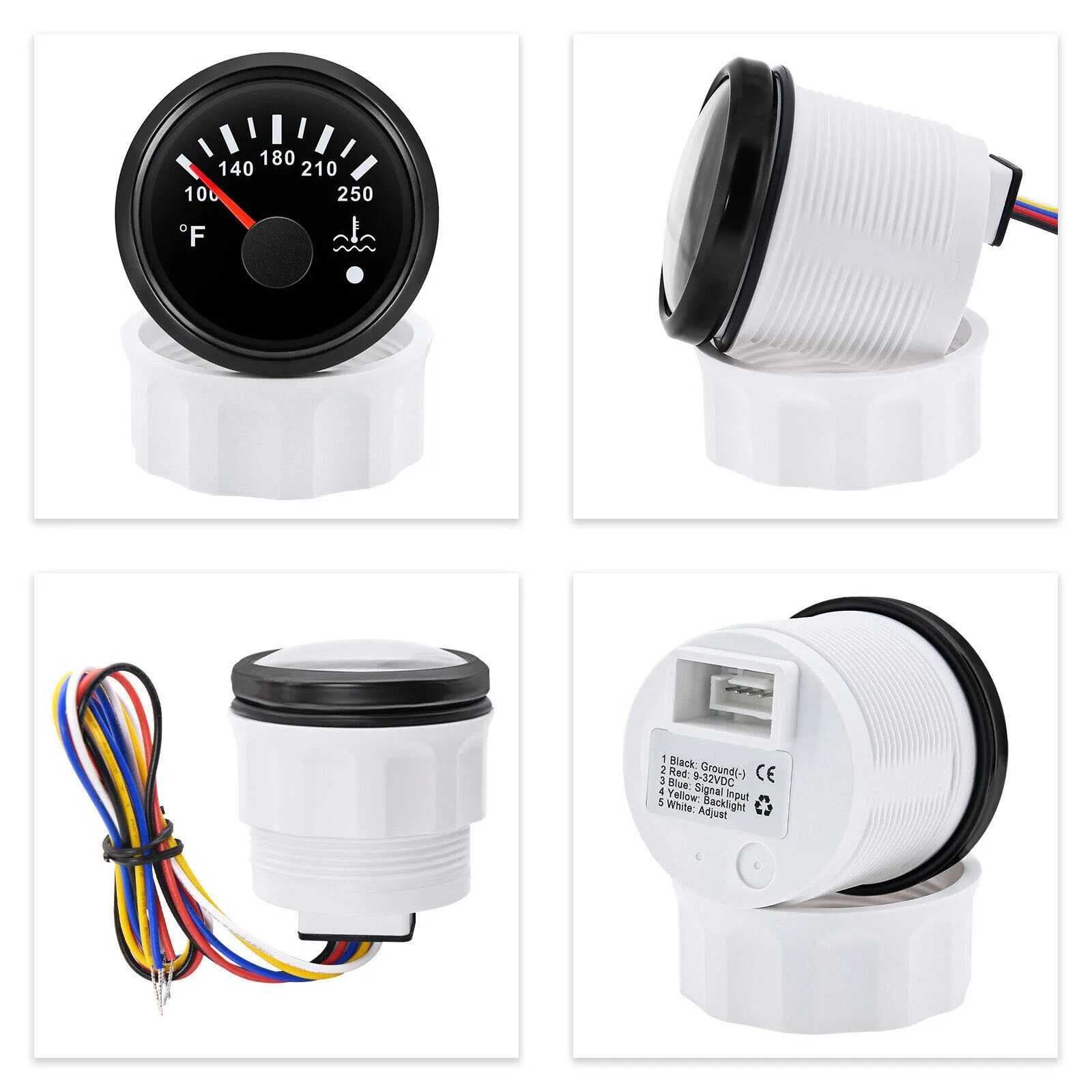 Feature:Be suitable for all kinds of water temperature sensors . and display the temperature of the water tankUse moving-magnet principle to drive the needle. featuring good endurance and anti-vibration.Stepper motors used for full range of stepping gauges. great feature with its less power consumption. longer life. higher precision. etc.With curved glass (with anti-fogging function)With ultra-wide working voltage design( long-term operating voltage: 9-32V. Maximum up to: 36V (<1 min)) Specifications:Working current: ≤60mAWorking voltage: 9~32 VInstall diameter: Φ52mmIndication range: 100-250?HInput signal: 287.4~22.4 ohmStorage temperature: -40??~+85??Operating temperature: -30??~+75??Waterproof: front cover IP67.back cover IP5Backlight: 7 Colors .red.yellow.orange.green.blue.purple.white. you can chose the color that press the gauge back button Connection1: Black: Ground(-)2: Red: 9-32VDC(+)3: Blue: Sensor Signal4: Yellow: Backlight(+)5: White: (Adjust) Package Includes:1 x 52mm Water Temperature Gauge1 x 1/8NPT Water Temp Sensor1 x Wiring Harness1 x Instruction Manual Please Note:Due to the manual measurement.there might be some error.Please make sure that signal parameter fit for your car model before pay.Thank you very much!