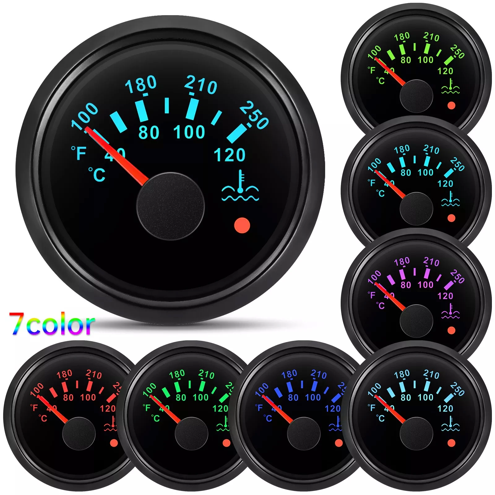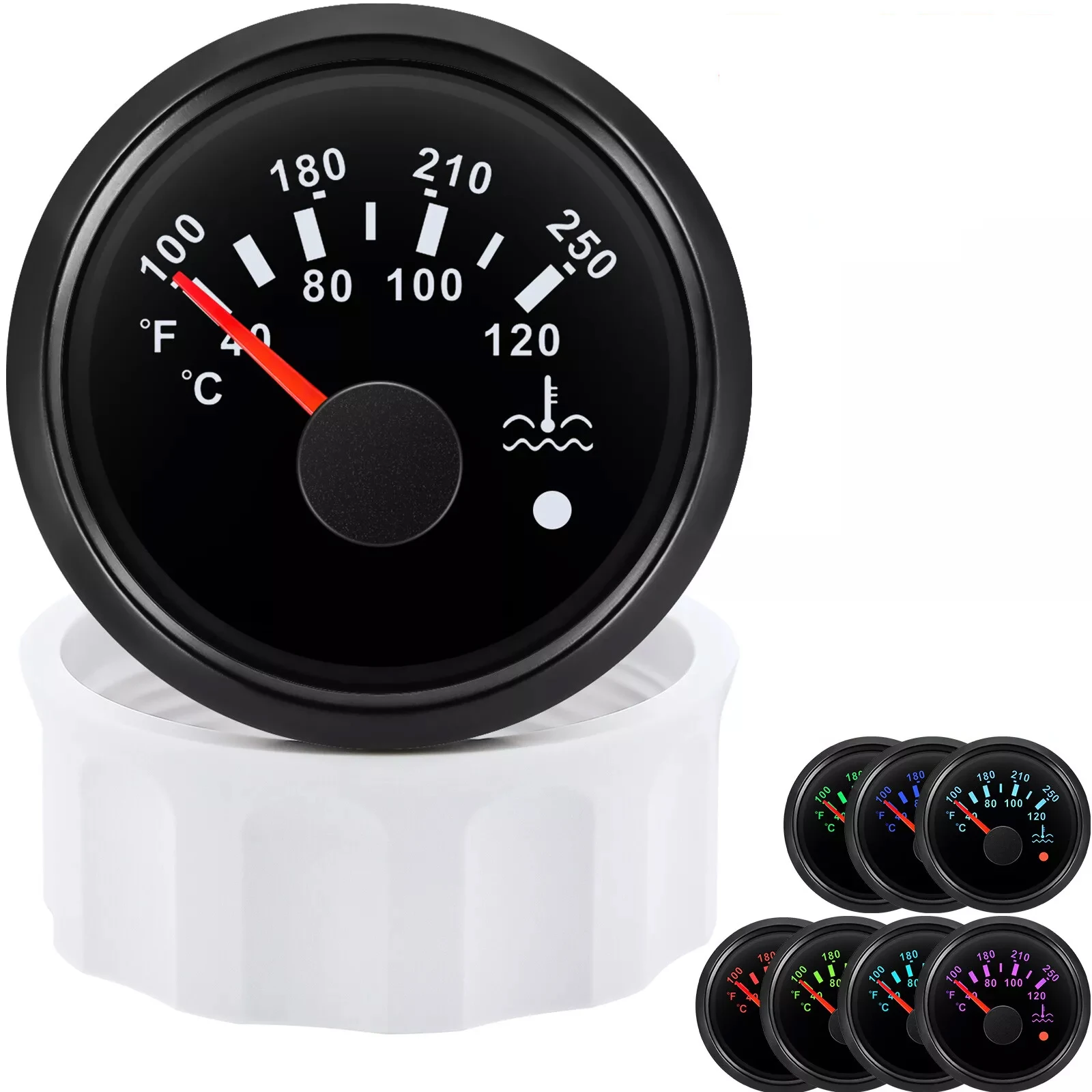 Feature:Be suitable for all kinds of water temperature sensors . and display the temperature of the water tankUse moving-magnet principle to drive the needle. featuring good endurance and anti-vibration.Stepper motors used for full range of stepping gauges. great feature with its less power consumption. longer life. higher precision. etc.With curved glass (with anti-fogging function)With ultra-wide working voltage design( long-term operating voltage: 9-32V. Maximum up to: 36V (<1 min)) Specifications:Working current: ≤60mAWorking voltage: 9~32 VInstall diameter: Φ52mmIndication range: 40-120??/100-250?HInput signal: 287.4~22.4 ohmsStorage temperature: -40??~+85??Operating temperature: -30??~+75??Waterproof: front cover IP67.back cover IP5Backlight: 7 Colors LED (red.yellow.orange.green.blue.purple.white). you can chose the color that press the gauge back button