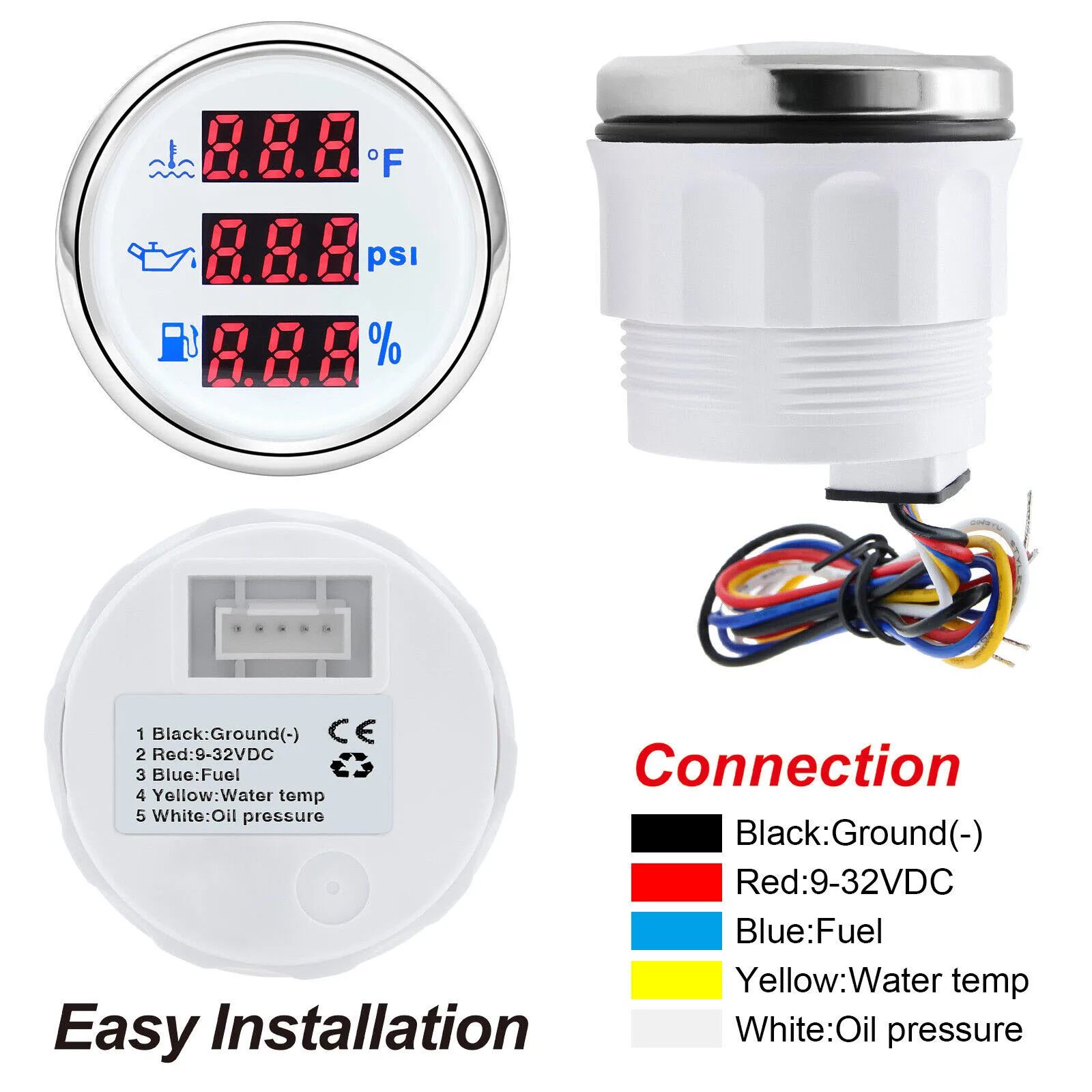 52mm Boat 3 in 1 Multifunction Gauge Fuel Level Water Temp Oil Pressure W/Sensor