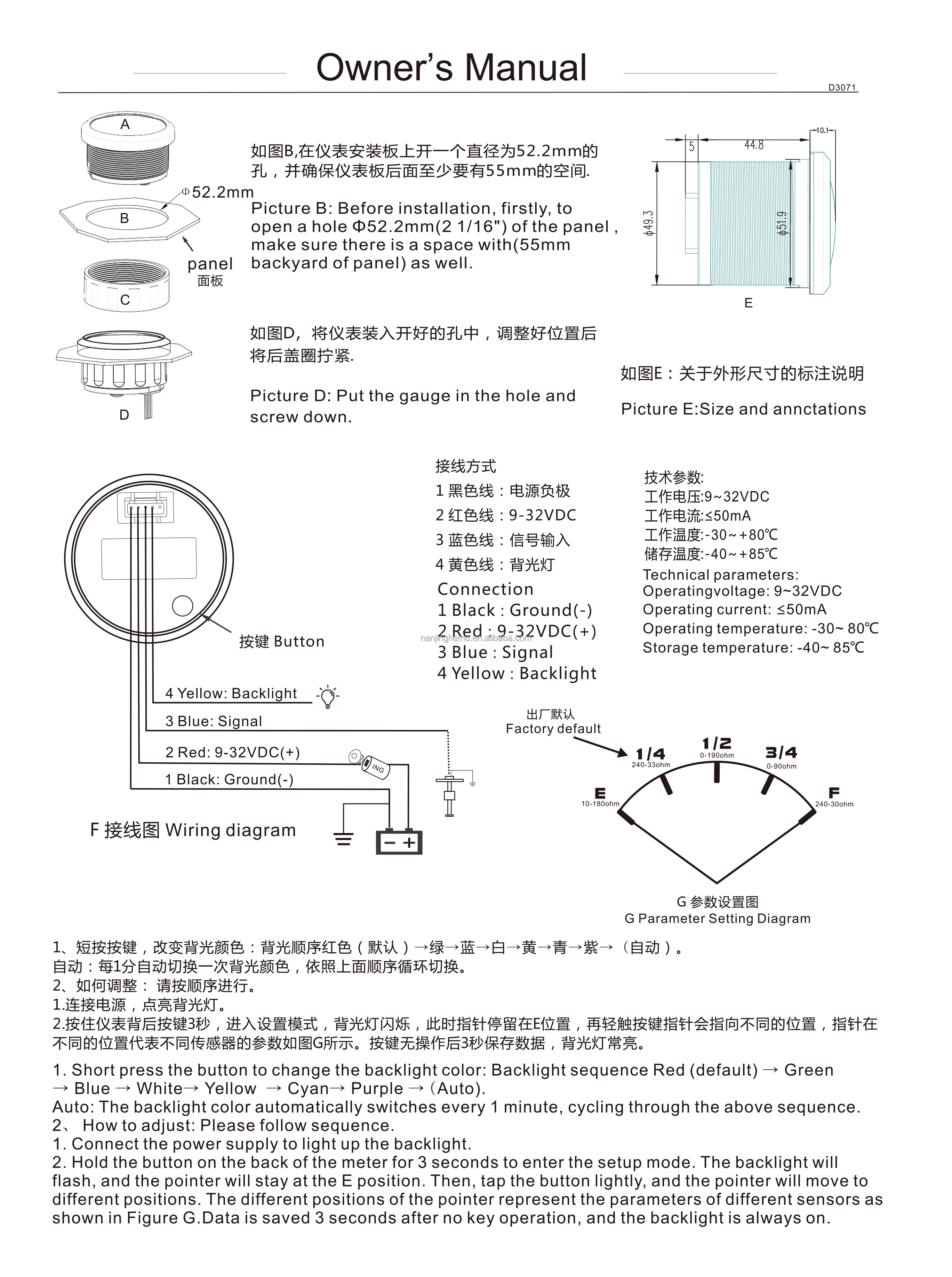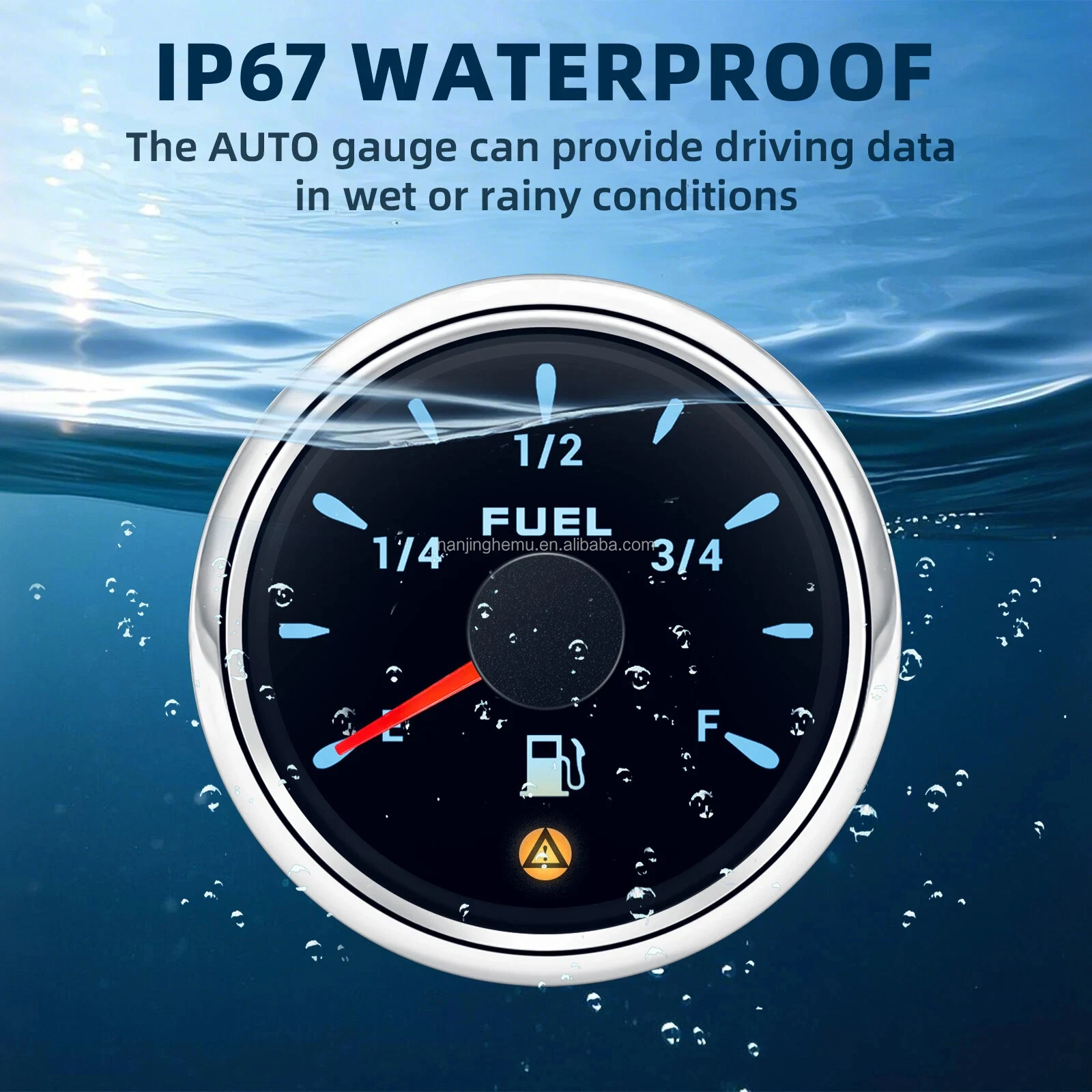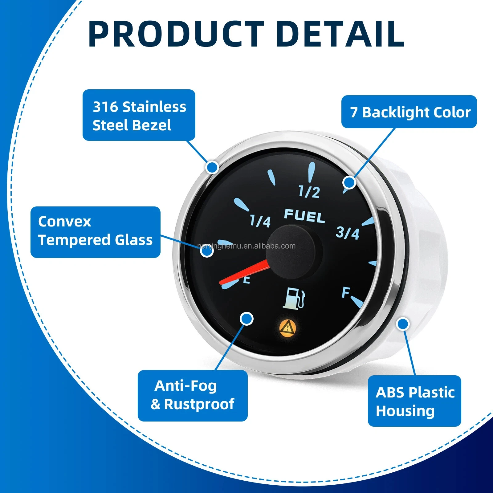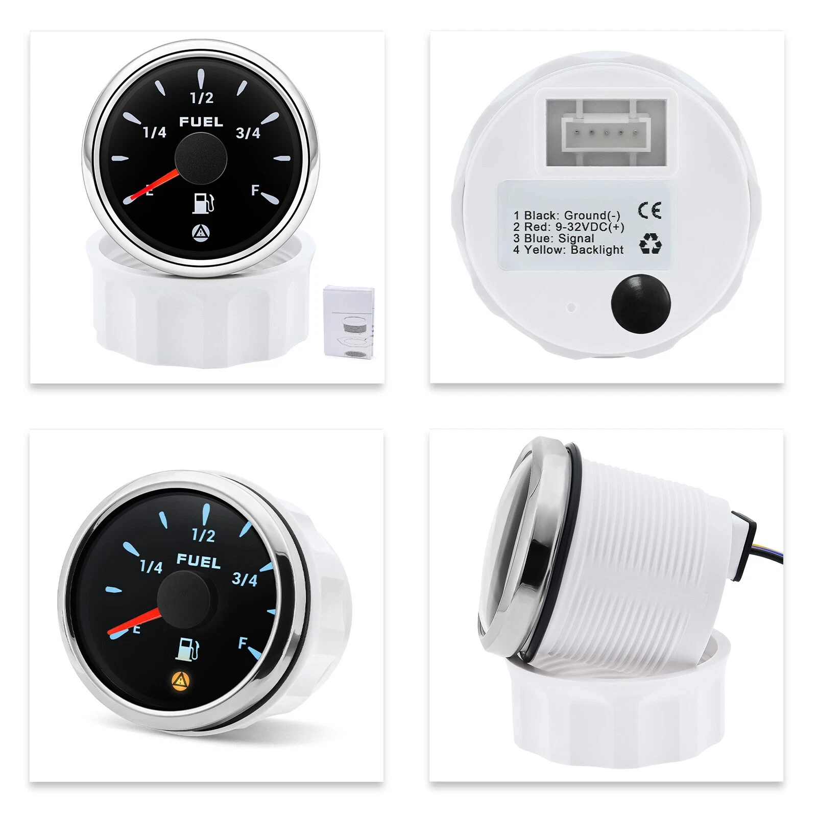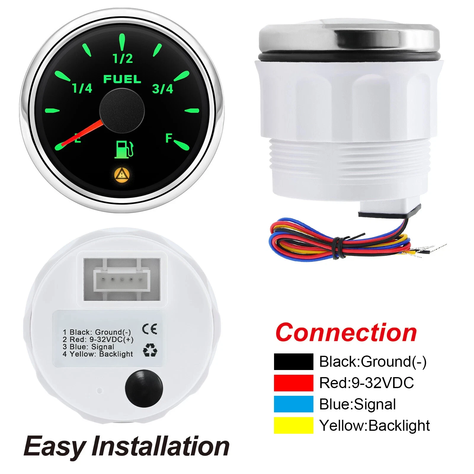 Feature??Fuel Gauge??–The fuel level Gauge is compatible to a wide range of vehicles and equipment. Whether you're using it in a car. truck. boat. this fuel gauge provides accurate and reliable fuel level monitoring for virtually any application . Keeping your fuel tank levels in check??5 signals Fuel Gauge??7-Color Backlight & 5 Signals – Short press the back button to choose 7 color backlight; long press (3s) to choose 5 signals (0-90/240-33/0-190/10-180/240-30 ohm)??Durable 52mm Design?? – Fuel Gauge diameter is Φ52mm or 2-1/16''. made of 316 Stainless Steel Bezel and Anti-fog Glass. IP67 Waterproof and Dustproof grade. keep it away from hot engine get best performance and to avoid fogging??Low Fuel Warning Alert??<13% Fuel Warning Flash – Built-in alert flashes when fuel drops below 13%. Keep track of your fuel levels at all times. The Fuel Gauge provides accurate. real-time readings. so you'll never run out of oil unexpectedly. Avoid running out of oil unexpectedly and protect your engine from damage??Universal Compatibility – Fuel gauge Suitable for 12V/24V cars. trucks. yachts. and boats. Fuel Gauge offers 5 adjustable resistance settings 0-90/240-33/0-190/10-180/240-30 ohm works with many different vehicles Description:Fit For:Car Truck Motorcycle ATV UTV Marine BoatFace Color:BlackSignal: (0-90/240-33/0-190/10-180/240-30 ohm) Can be adjustedBlacklight Color: 7 Colors LEDBezel Materials: Stainless SteelIndicating Range:Empty-FullOperating Voltage:9-32VDCOperating Current:≤60mAOperating Temperature:-30~+75 ??Storage Temperature:-40~+85 ??Install Diameter: 52mm(2-1/16'')Grade Of Protection :IP67Package Method :Neutral box Installation instructions:1.Opening a hole in the panel (your cabin board and dashboard) with a diameter of 52mm.Insert meter into the hole.The panel corresponding to the instrument panel is marked with a convex table.and open a small notch in this location.To ensure that there is at least 70mm of the instrument panel at the back of the instrument.2.After the instrument is mounted in the panel.Screw down with a fixed ring.3.Connect signal Connect the wire.the instrument housing is directly connected to the 9~32V power supply.4.Insert wire harness.Firmly locked in the table. Connection:Red–+9-32VDCBlack–Ground(-)Blue–SignalYellow–Blacklight(+) Package List:1xFuel Level Gauge1xWiring Harness1x Instruction Manual