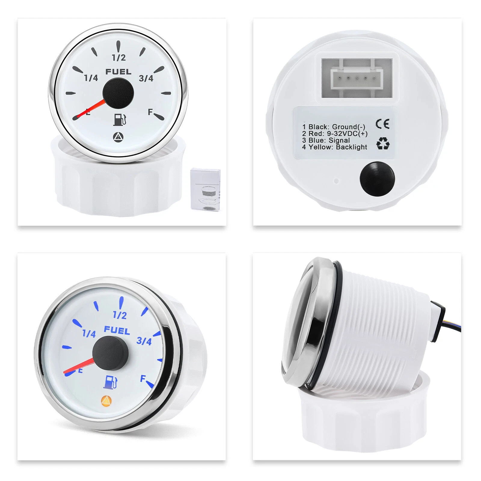 Feature??Fuel Gauge??–The fuel level Gauge is compatible to a wide range of vehicles and equipment. Whether you're using it in a car. truck. boat. this fuel gauge provides accurate and reliable fuel level monitoring for virtually any application . Keeping your fuel tank levels in check??5 signals Fuel Gauge??7-Color Backlight & 5 Signals – Short press the back button to choose 7 color backlight; long press (3s) to choose 5 signals (0-90/240-33/0-190/10-180/240-30 ohm)??Durable 52mm Design?? – Fuel Gauge diameter is Φ52mm or 2-1/16''. made of 316 Stainless Steel Bezel and Anti-fog Glass. IP67 Waterproof and Dustproof grade. keep it away from hot engine get best performance and to avoid fogging??Low Fuel Warning Alert??<13% Fuel Warning Flash – Built-in alert flashes when fuel drops below 13%. Keep track of your fuel levels at all times. The Fuel Gauge provides accurate. real-time readings. so you'll never run out of oil unexpectedly. Avoid running out of oil unexpectedly and protect your engine from damage??Universal Compatibility – Fuel gauge Suitable for 12V/24V cars. trucks. yachts. and boats. Fuel Gauge offers 5 adjustable resistance settings 0-90/240-33/0-190/10-180/240-30 ohm works with many different vehicles Description:Fit For:Car Truck Motorcycle ATV UTV Marine BoatFace Color:BlackSignal: (0-90/240-33/0-190/10-180/240-30 ohm) Can be adjustedBlacklight Color: 7 Colors LEDBezel Materials: Stainless SteelIndicating Range:Empty-FullOperating Voltage:9-32VDCOperating Current:≤60mAOperating Temperature:-30~+75 ??Storage Temperature:-40~+85 ??Install Diameter: 52mm(2-1/16'')Grade Of Protection :IP67Package Method :Neutral box Installation instructions:1.Opening a hole in the panel (your cabin board and dashboard) with a diameter of 52mm.Insert meter into the hole.The panel corresponding to the instrument panel is marked with a convex table.and open a small notch in this location.To ensure that there is at least 70mm of the instrument panel at the back of the instrument.2.After the instrument is mounted in the panel.Screw down with a fixed ring.3.Connect signal Connect the wire.the instrument housing is directly connected to the 9~32V power supply.4.Insert wire harness.Firmly locked in the table. Connection:Red–+9-32VDCBlack–Ground(-)Blue–SignalYellow–Blacklight(+) Package List:1xFuel Level Gauge1xWiring Harness1x Instruction Manual