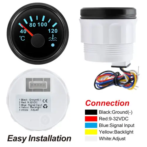 Feature:Be suitable for all kinds of water temperature sensors . and display the temperature of the water tankUse moving-magnet principle to drive the needle. featuring good endurance and anti-vibration.Stepper motors used for full range of stepping gauges. great feature with its less power consumption. longer life. higher precision. etc.With curved glass (with anti-fogging function)With ultra-wide working voltage design( long-term operating voltage: 9-32V. Maximum up to: 36V (<1 min)) Specifications:Working current: ≤60mAWorking voltage: 9~32 VInstall diameter: Φ52mmIndication range: 0~120??Input signal: 287.4~22.4 ohmStorage temperature: -40??~+85??Operating temperature: -30??~+75??Waterproof: front cover IP67.back cover IP5Backlight: 7 Colors .red.yellow.orange.green.blue.purple.white. you can chose the color that press the gauge back button Connection:Black: Ground(-)Red: 9-32VDCBlue: Signal InputYellow: BacklightWhite: Reserve Package Includes:1 x Wiring Harness1 x Water Temp. Gauge