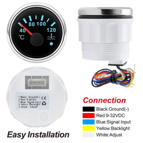 Feature:Be suitable for all kinds of water temperature sensors . and display the temperature of the water tankUse moving-magnet principle to drive the needle. featuring good endurance and anti-vibration.Stepper motors used for full range of stepping gauges. great feature with its less power consumption. longer life. higher precision. etc.With curved glass (with anti-fogging function)With ultra-wide working voltage design( long-term operating voltage: 9-32V. Maximum up to: 36V (<1 min)) Specifications:Working current: ≤60mAWorking voltage: 9~32 VInstall diameter: Φ52mmIndication range: 0~120??Input signal: 287.4~22.4 ohmStorage temperature: -40??~+85??Operating temperature: -30??~+75??Waterproof: front cover IP67.back cover IP5Backlight: 7 Colors .red.yellow.orange.green.blue.purple.white. you can chose the color that press the gauge back button Connection:Black: Ground(-)Red: 9-32VDCBlue: Signal InputYellow: BacklightWhite: Reserve Package Includes:1 x Wiring Harness1 x Water Temp. Gauge