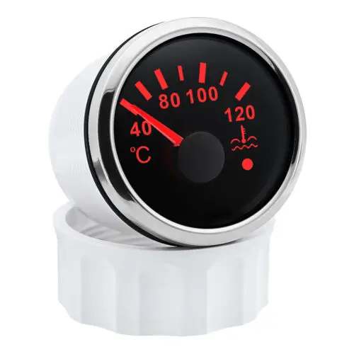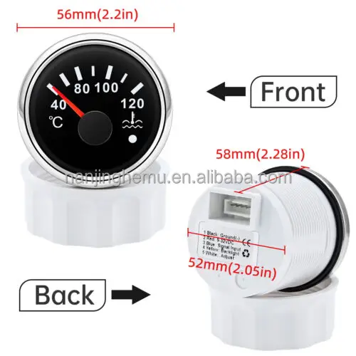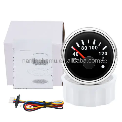 Feature:Be suitable for all kinds of water temperature sensors . and display the temperature of the water tankUse moving-magnet principle to drive the needle. featuring good endurance and anti-vibration.Stepper motors used for full range of stepping gauges. great feature with its less power consumption. longer life. higher precision. etc.With curved glass (with anti-fogging function)With ultra-wide working voltage design( long-term operating voltage: 9-32V. Maximum up to: 36V (<1 min)) Specifications:Working current: ≤60mAWorking voltage: 9~32 VInstall diameter: Φ52mmIndication range: 40~120??Input signal: 287.4~22.4 ohmsStorage temperature: -40??~+85??Operating temperature: -30??~+75??Waterproof: front cover IP67.back cover IP5Backlight: 7 Colors LED (red.yellow.orange.green.blue.purple.white). you can chose the color that press the gauge back button
