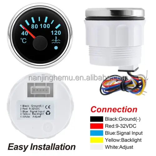 Connection:1: Black: Ground(-)2: Red: 9-32VDC(+)3: Blue: Sensor Signal4: Yellow: Backlight(+)5: White: (Adjust) Package Includes:1 x Water Temp. Gauge1 x Wiring Harness1 x Instruction Manual Please Note:Due to the manual measurement.there might be some error.Please make sure that signal parameter fit for your car model before pay.Thank you very much!