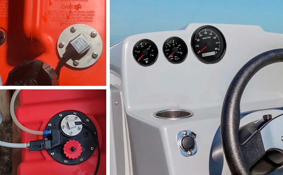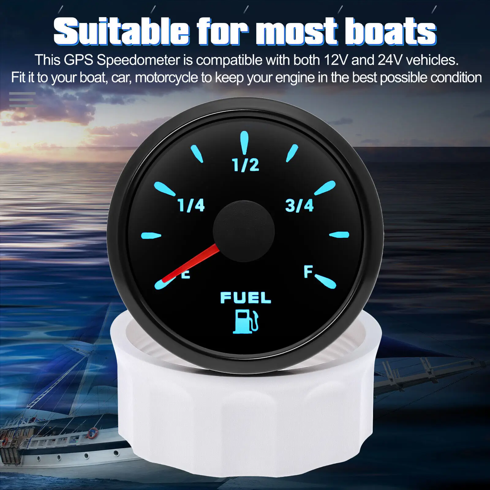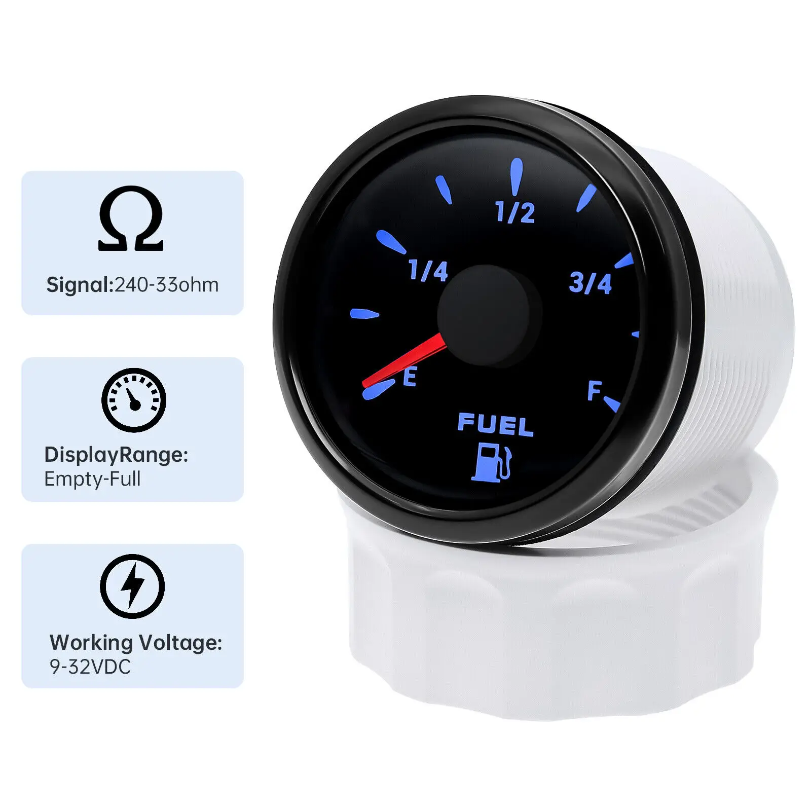 SpecificationWorking voltage: 9~32v/ 12-24VInput signal:240-33ohmsWorking current:≤60mAOperating temperature:-30??~+75??Storage temperature:-40??~+85??Grade of protection:IP67 FeaturesThis gauge have 7 backlight color : red??green??blue??yellow??olivine??orange??purple. totally 7kinds different backlight color. it will change automatically every 1 minute.Fantastic waterproof Function: Can work in the water.You can fix only one color you like by pressing the gauge back "set" buttonGauges front cover use stainless steel 316L for long-term use even in acid-base and humid environmentIP67 waterproof and dustproof gradeStepper motors used for full range of stepping gauges.great feature with its less power consumption.longer life.higher precision etc.With curved glass (with anti-fog function)With ultra-wide working voltage design (long-term operating voltage:9-32v.maximum up to:36v)There is a snap together with the harness connector.for best and firmly connected.in order that the gauges could work even in strongviberation.products can be used for the engines/generating units.ships.construction machinery.agricultural machinery.automotive modification etc. Specifications:Material:stainless steel 316L+anti-fog glassInstall diameter:Φ52mm or 2-1/16"Indication range:E-FBacklight color:red.yellow.orange.green.blue.purple.yellow green. You can choose what you need color that press the gauge back buttonWorking voltage:9-32VDCInput signal:240-33ohmWorking current:≤60mAOperating temperature:-30??~+75??Storage temperature:-40??~+85??Grade of protection:IP67 Package include:1 x Fuel level gauge1 x Wiring harness??1 x Instruction manual